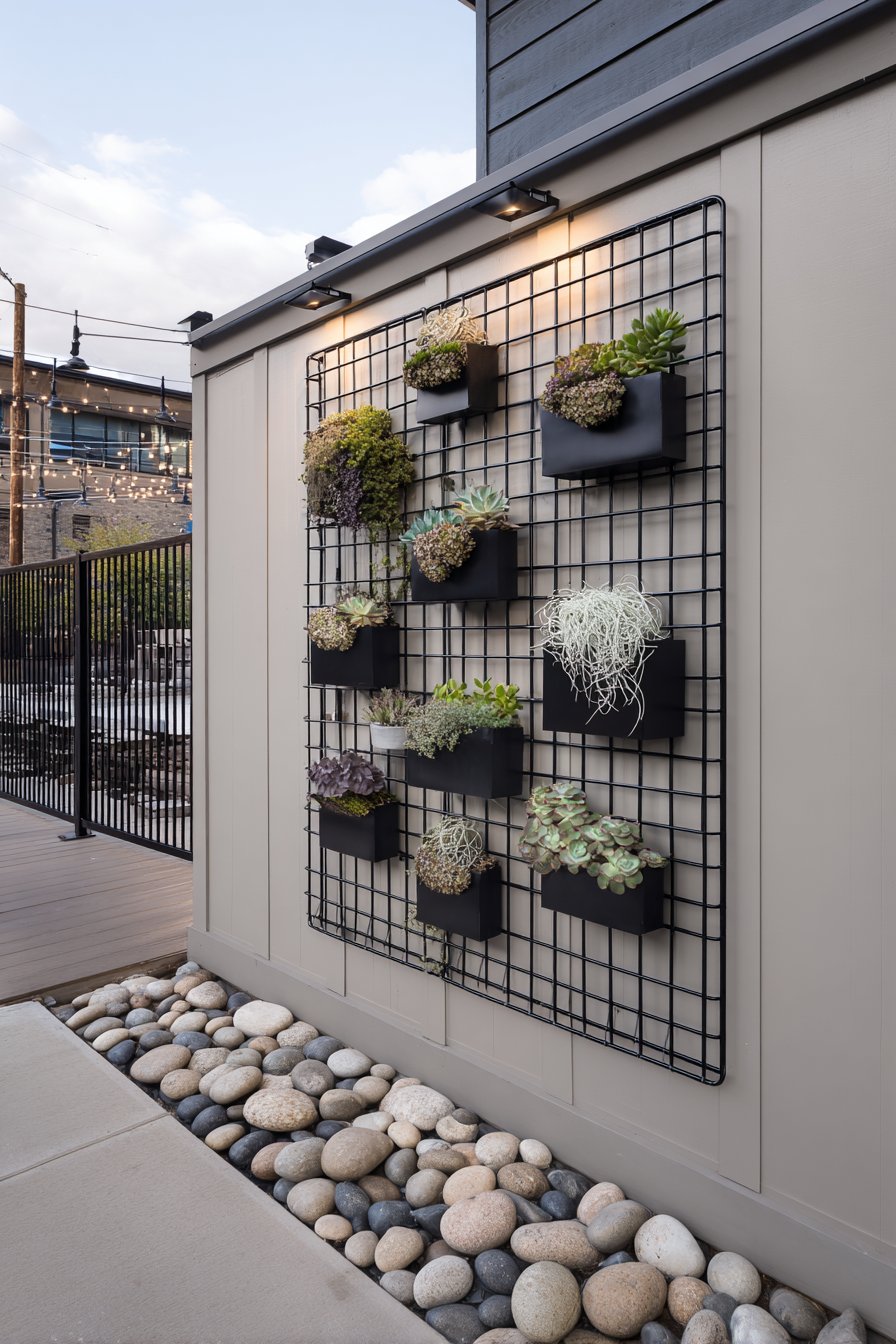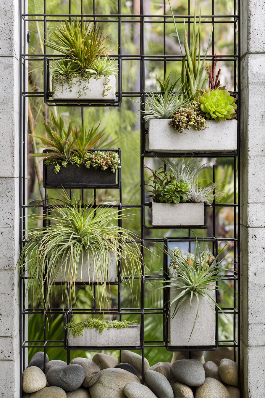 Systematic organization meets modern aesthetics in this grid-based approach where metal framework provides structure for flexible plant displays. Matte black modular panels mount on a light gray painted fence, their grid pattern creating regular geometry that appeals to orderly minds while providing infinite customization options. Various sized planters hook into the grid, holding modern succulents and architectural air plants that require minimal care while offering maximum visual interest through their geometric forms and blue-green coloring. The systematic arrangement demonstrates how contemporary design can accommodate living elements while maintaining clean aesthetic.