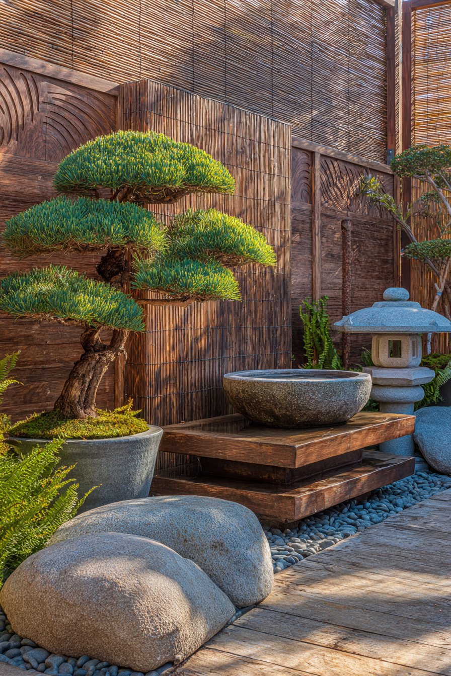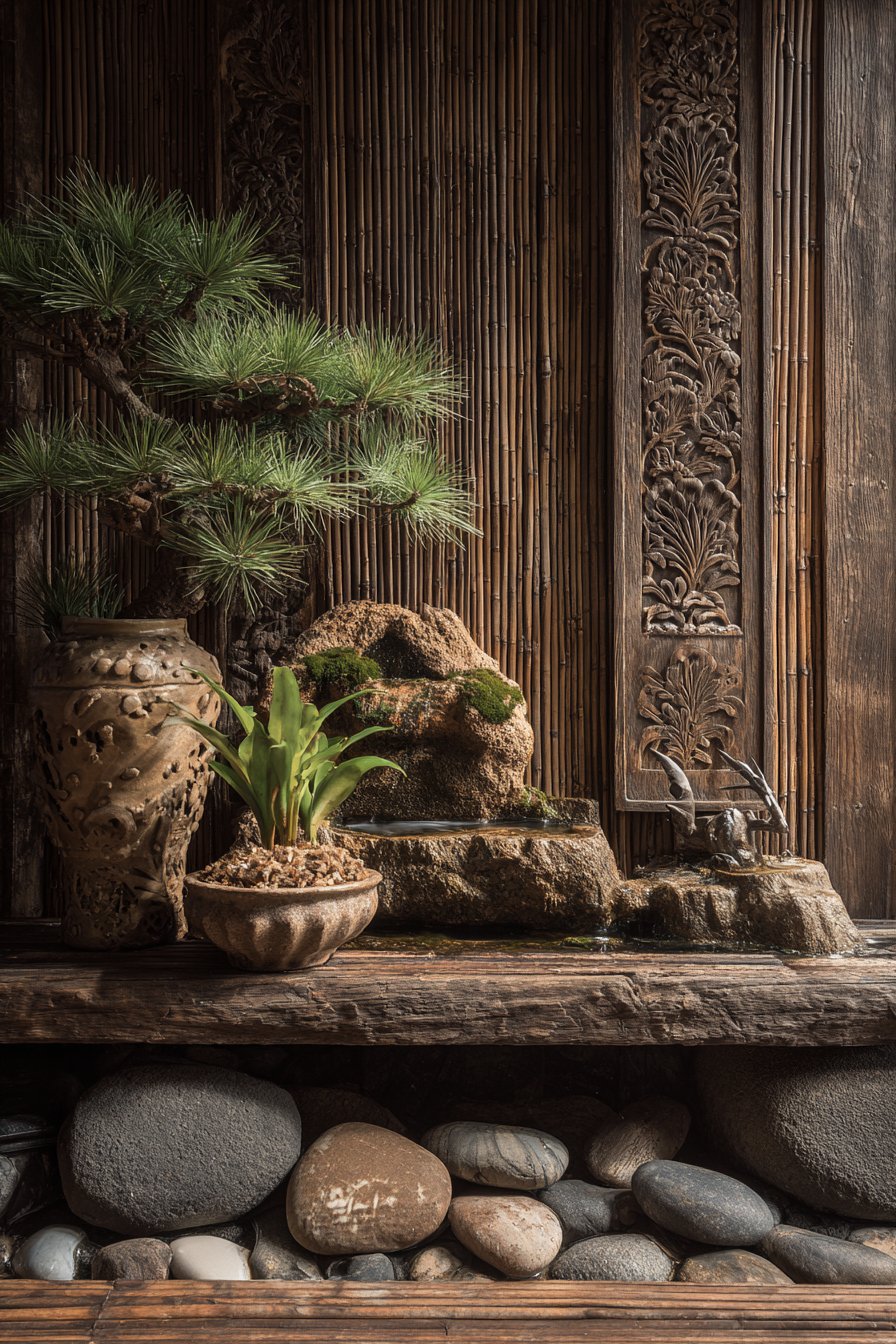Carefully placed bonsai arrangements on floating shelves demonstrate the Japanese aesthetic principle of using living elements as sculpture—each tree carefully shaped over years to express natural forms in miniature. River rocks and zen garden elements at ground level complete the contemplative atmosphere, their smooth surfaces and careful placement inviting quiet reflection. The overall composition demonstrates balance rather than symmetry, with elements weighted carefully to create harmonious relationships without rigid matching.