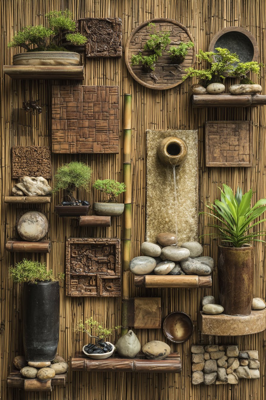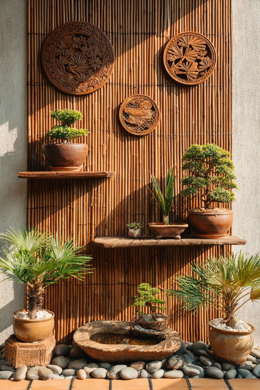 Contemplative design principles create peaceful backyard retreats through carefully balanced Asian-inspired wall treatments. Bamboo privacy screening provides backdrop while introducing authentic Asian garden material—its natural sectioning and vertical growth pattern creating subtle pattern without busy-ness. Decorative wooden wall panels carved with nature motifs—cranes, cherry blossoms, bamboo stalks—demonstrate traditional craftsmanship while maintaining the natural material palette. A small water feature wall fountain in natural stone becomes the meditation focal point, its gentle trickling sound adding crucial auditory dimension to the visual composition.