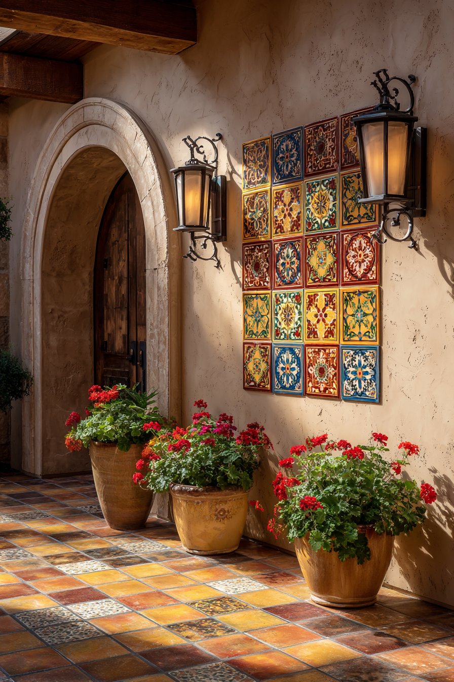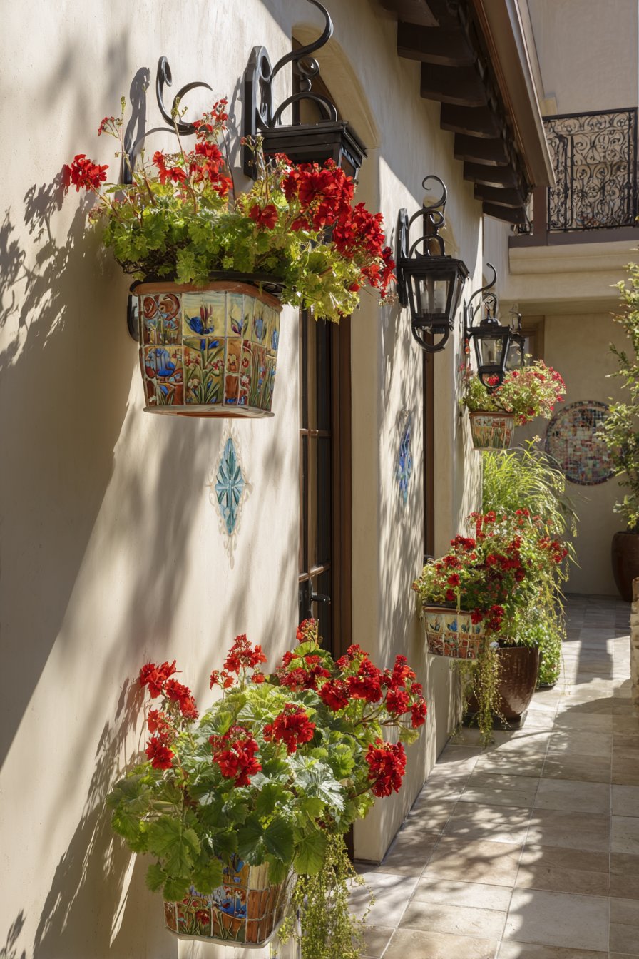 Wrought iron wall sconces provide practical lighting while their black metalwork creates striking contrast against colorful tiles. Matching iron plant holders display cascading geraniums whose red blooms complement the tile colors while introducing organic forms that soften the geometric patterns. Saltillo tile flooring below shows natural color variation from rust to golden tones, its terracotta composition connecting ground plane to wall treatment while establishing Mediterranean character.
