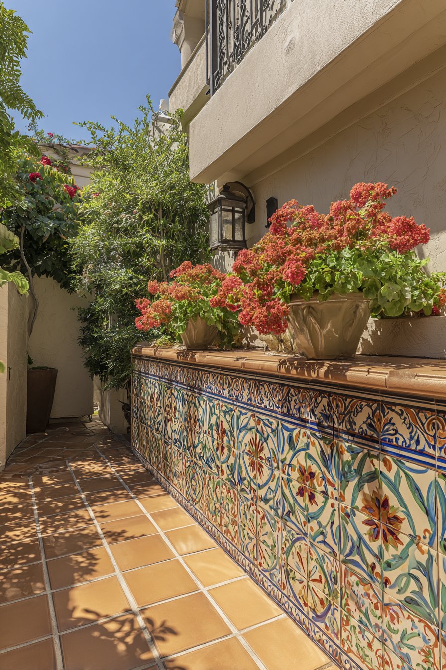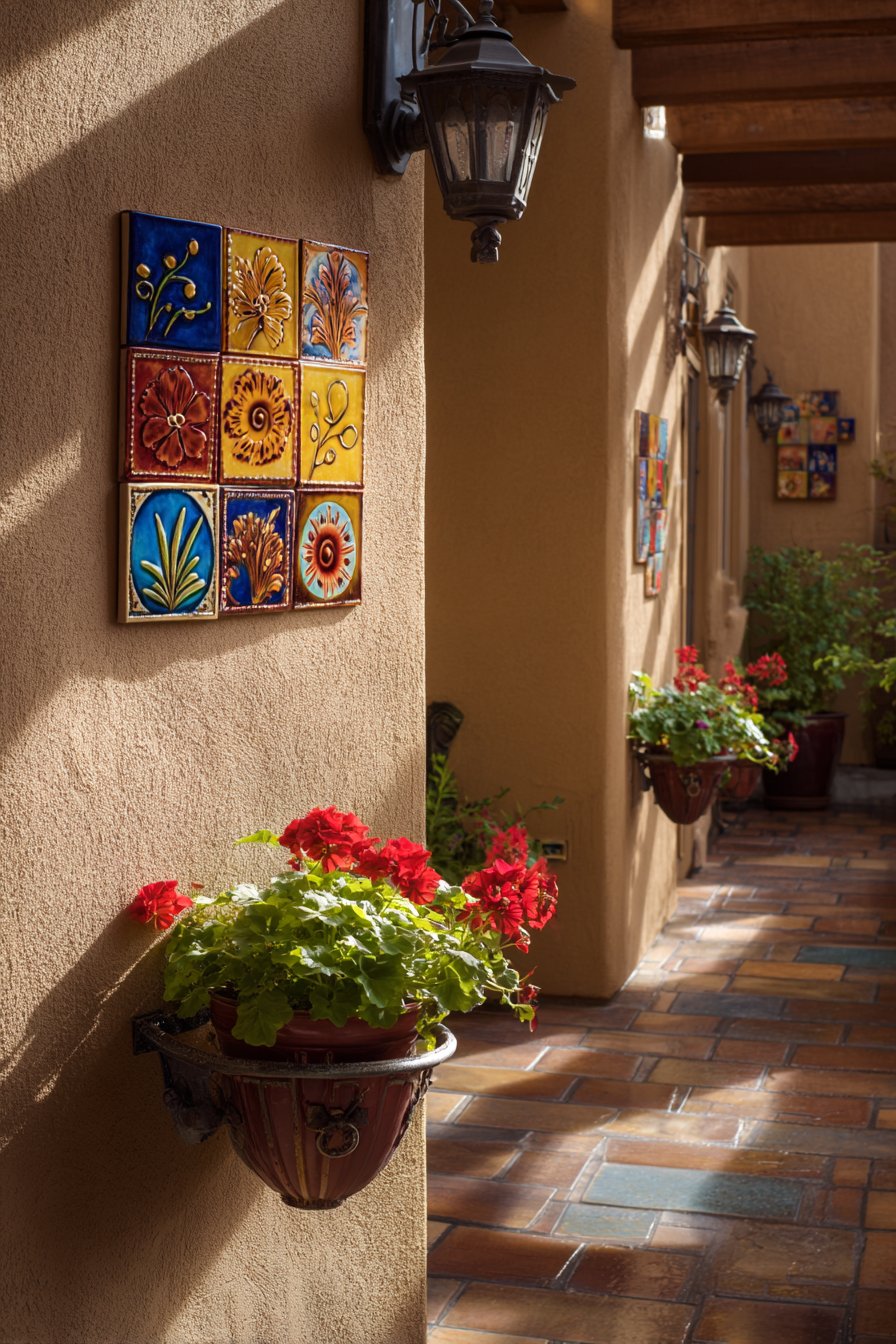 Vibrant hand-painted ceramic tiles transform plain stucco walls into artistic statements that celebrate color, pattern, and craftsmanship. Terra cotta, cobalt blue, and sunny yellow tiles create mosaic effects that reference Spanish, Portuguese, or Mexican decorative traditions. Individual tiles might feature botanical patterns, geometric designs, or pictorial scenes, their hand-painted quality evident through slight variations that distinguish artisan work from mass production. The arrangement—whether formal grid pattern, random placement, or organized border design—establishes rhythm and visual flow across the wall surface.