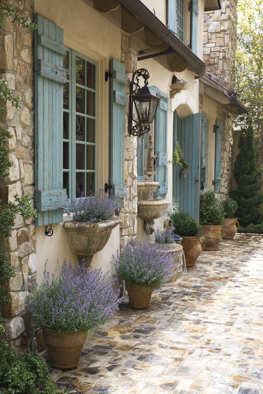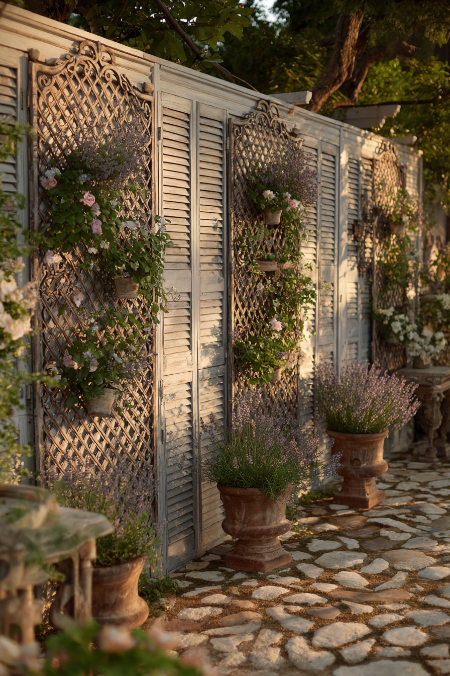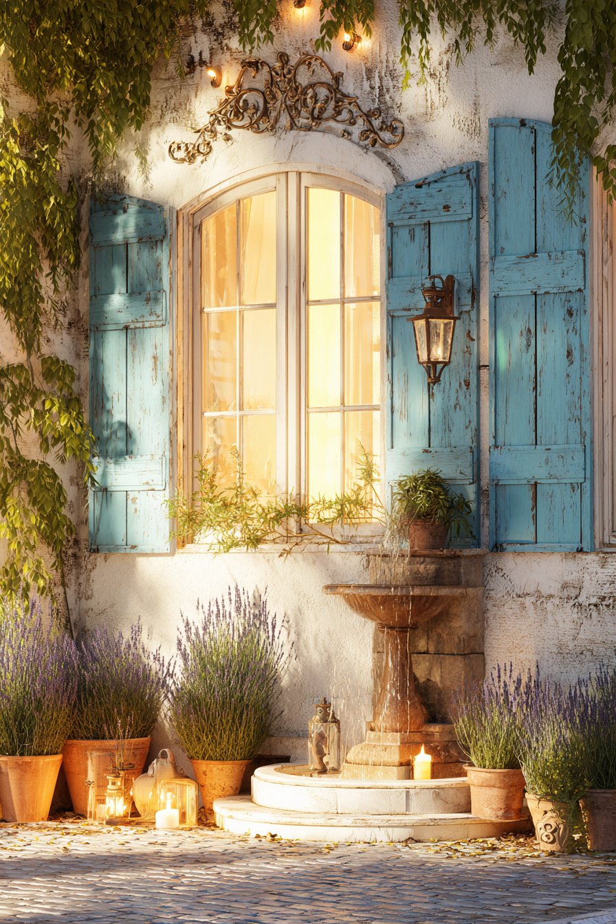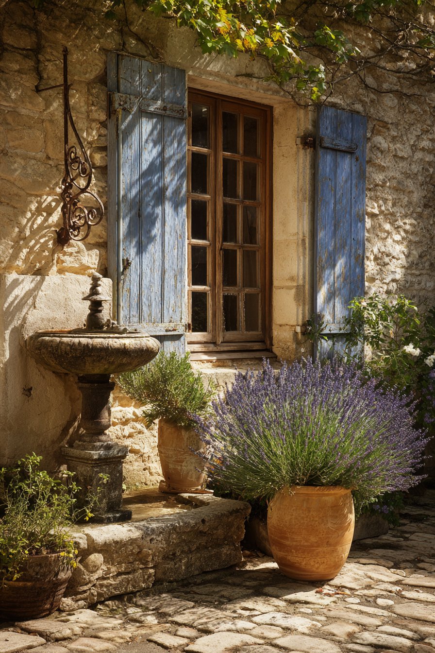 Vintage shutters in weathered blue paint flank a decorative metal wall fountain, their faded color and slightly peeling paint suggesting decades of Provençal sun exposure. The fountain adds crucial water element—both visual and auditory—creating focal point while attracting birds and beneficial insects. Terra cotta pots line the cobblestone base, their warm earthen tones complementing the white-washed stone while containing additional herbs and flowers. The cobblestones themselves—irregular, hand-laid, with moss growing between stones—complete the authentic European garden aesthetic.