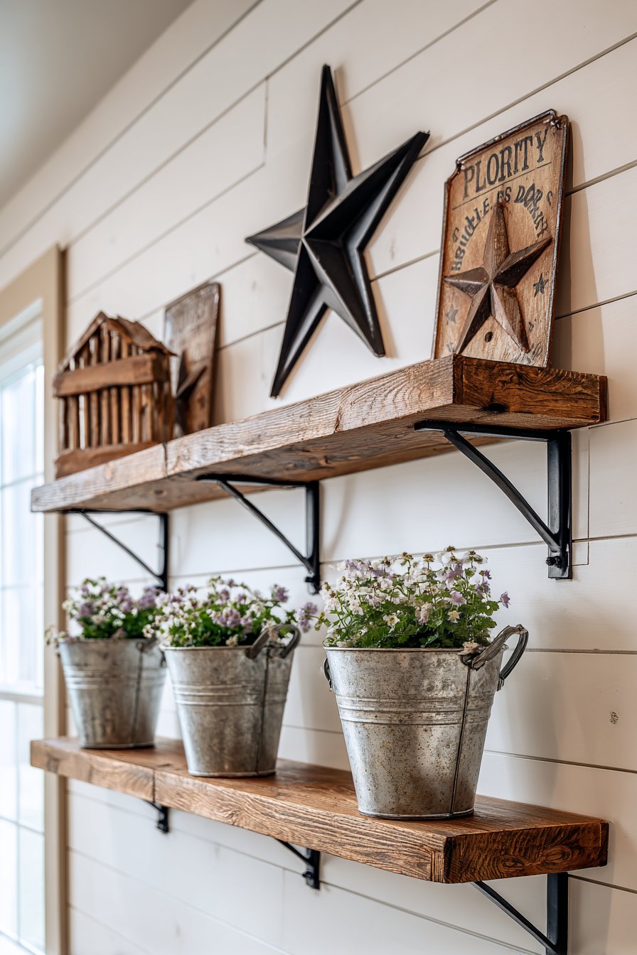 Clean-lined farmhouse aesthetics merge traditional and contemporary elements through horizontal shiplap-style planking painted in crisp white. The evenly spaced boards create subtle shadow lines that add dimensional interest to flat surfaces while the white color reflects light and maintains fresh, clean appearance. Black metal barn star decorations provide bold contrast, their five-pointed forms referencing Pennsylvania Dutch traditions and American agricultural heritage. Vintage-style enamel signs advertising seed companies, farm equipment, or country stores add authentic period details that ground the modern interpretation in historical reality.