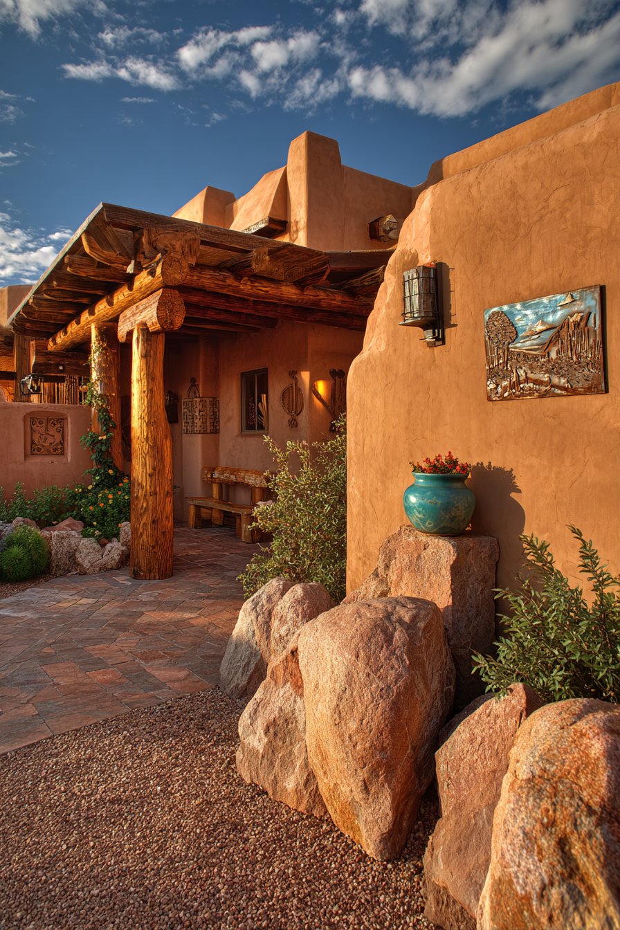 - Apply textured stucco finish in earth tones using traditional methods for authentic adobe appearance