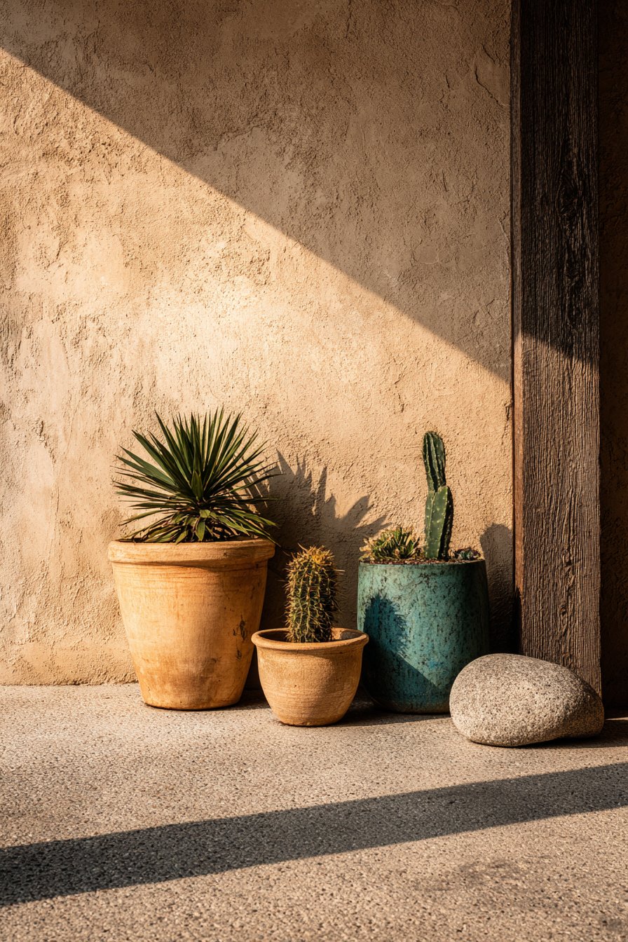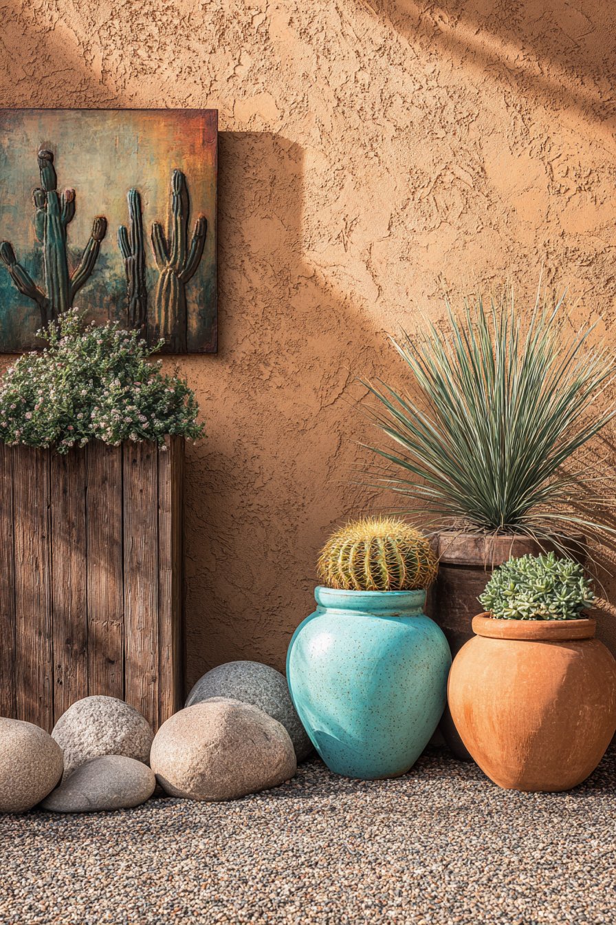 Warm earth tones and heat-loving plants create authentic southwestern ambiance on adobe-style stucco walls in sand and terracotta tones. Southwestern metal wall art depicting cacti, desert scenes, or Native American-inspired patterns immediately establishes regional character while working beautifully in both genuine desert climates and areas simply influenced by southwestern style. Ceramic wall planters in terracotta and turquoise—the classic southwestern color combination—hold drought-tolerant succulents whose architectural forms and blue-green coloring suit the desert aesthetic perfectly.