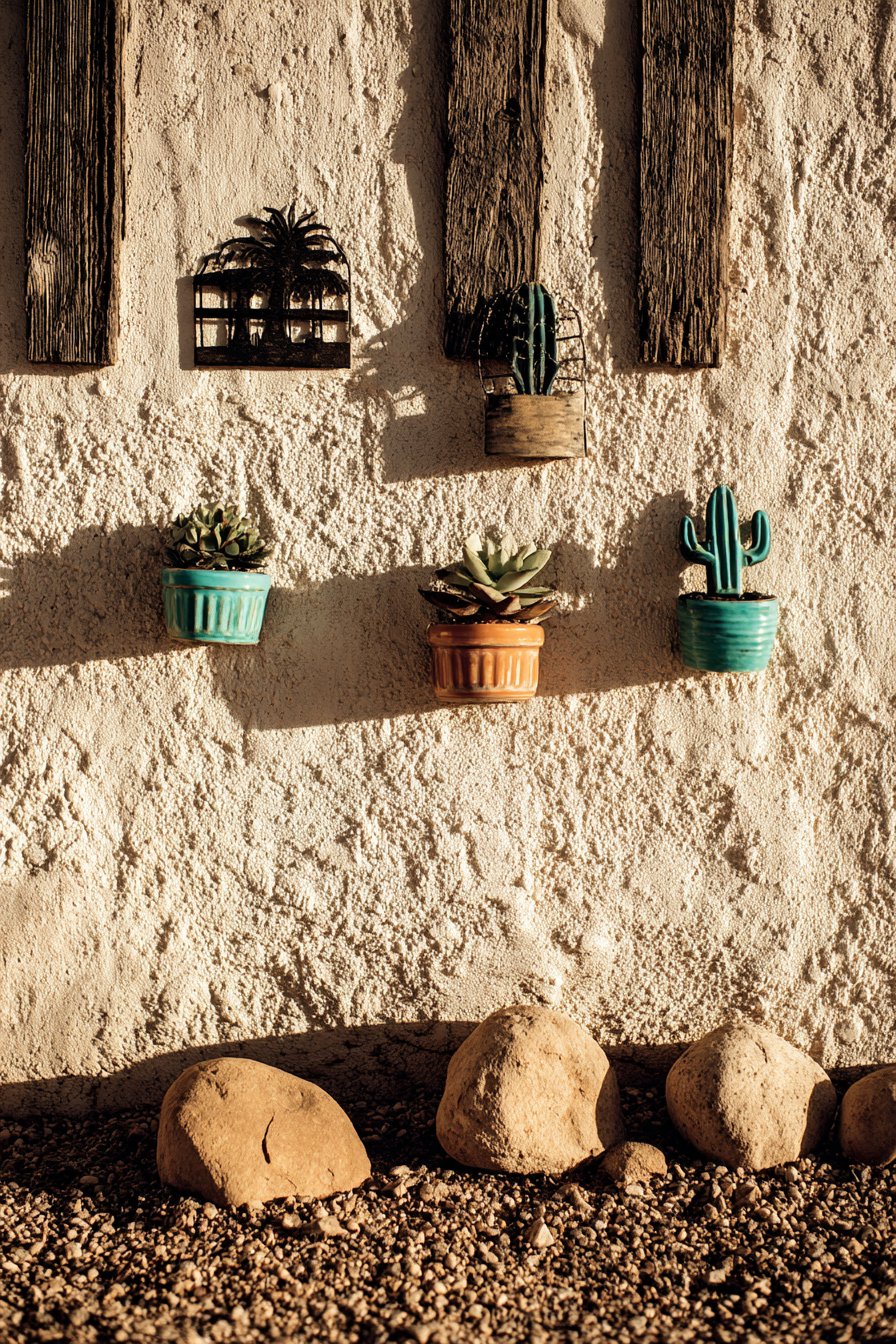 Architectural photography captures the installation during late afternoon when the low-angle light creates dramatic shadows and highlights the textured stucco surface. The warm light intensifies the terracotta and sand tones while making the turquoise accents glow brilliantly. Images emphasize authentic desert garden aesthetic through proper representation of materials, appropriate plant selections, and the distinctive quality of southwestern light that has drawn artists to these regions for centuries.