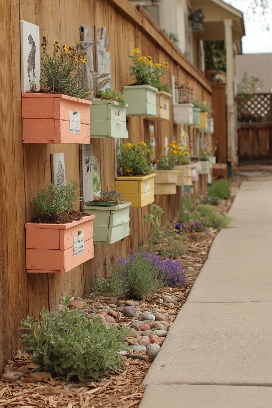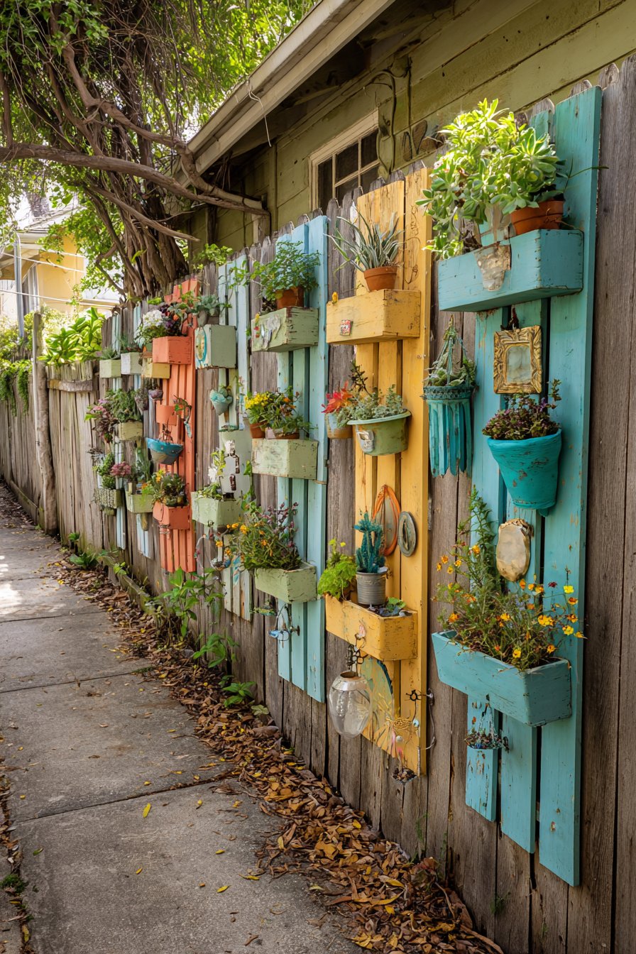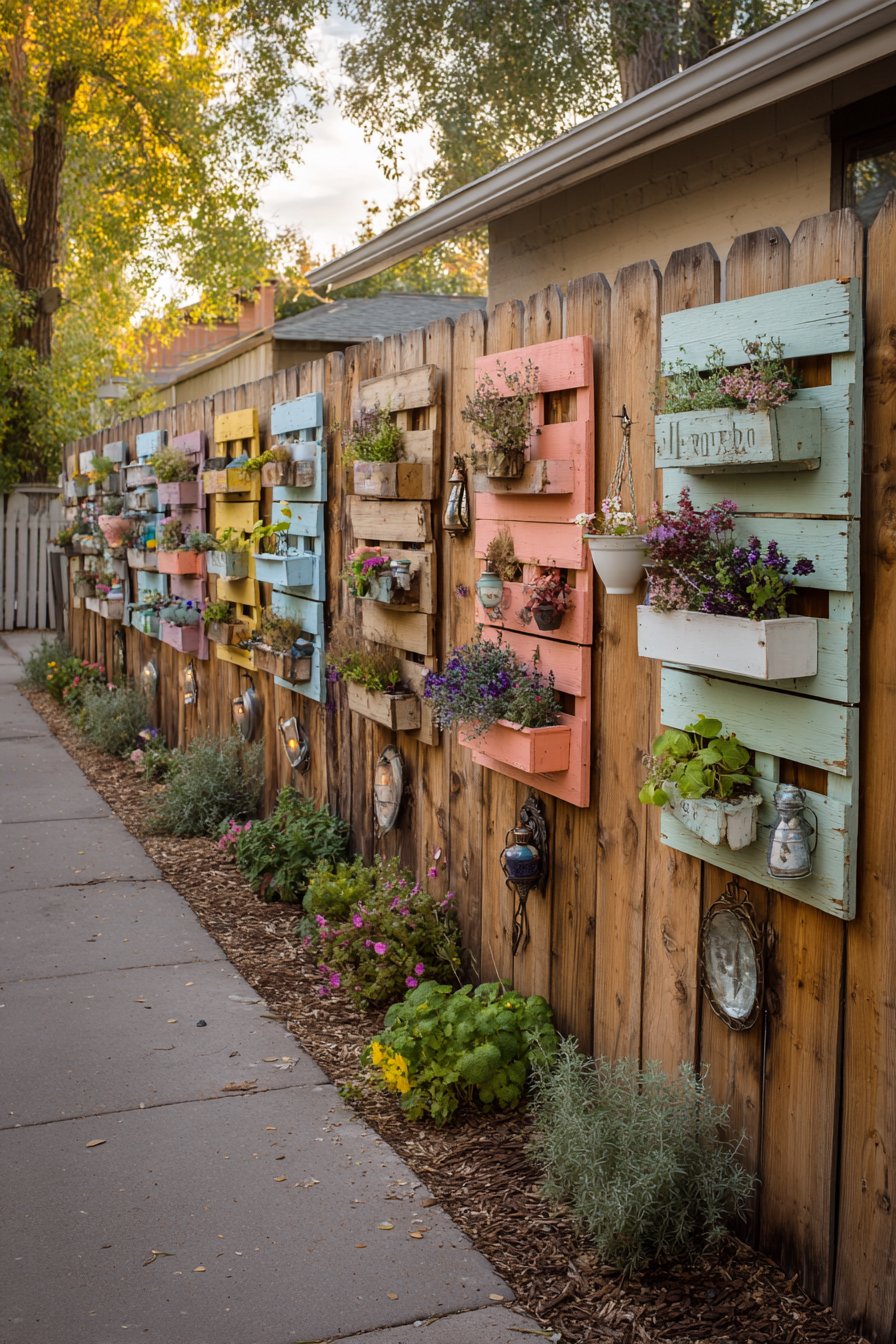 Personal creativity and playful color define this approachable DIY project where painted pallet sections create cheerful vertical gardens. Each pallet section receives different cheerful colors—mint green, coral, soft yellow—transforming humble reclaimed wood into artistic statement pieces. Individual planters within hold different herbs, flowers, or small vegetables, demonstrating how decorative installations can serve practical purposes. Decorative garden stakes, wind chimes, and small mirrors add playful elements that reflect the gardener’s personality and sense of fun.