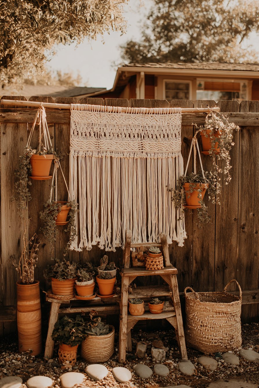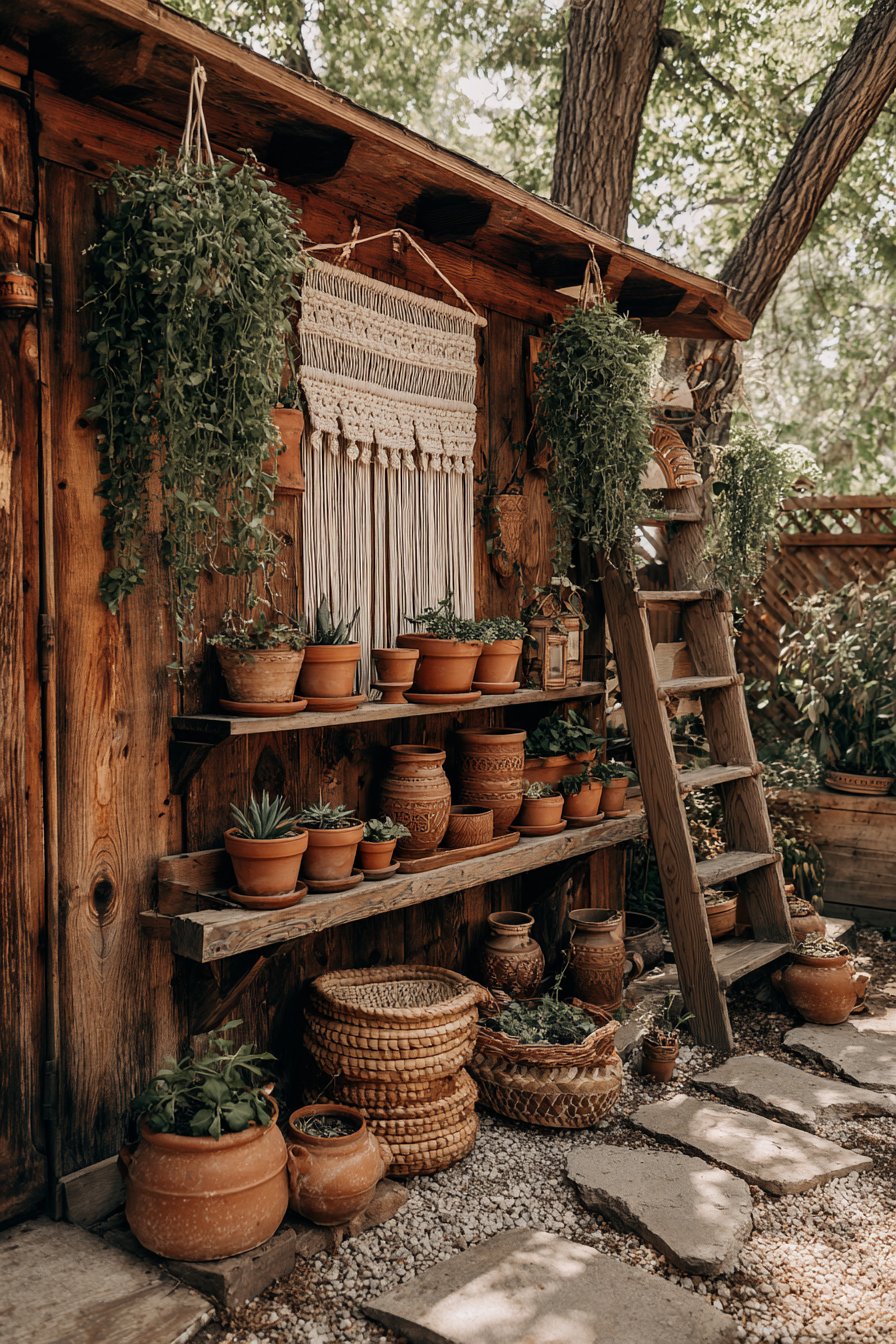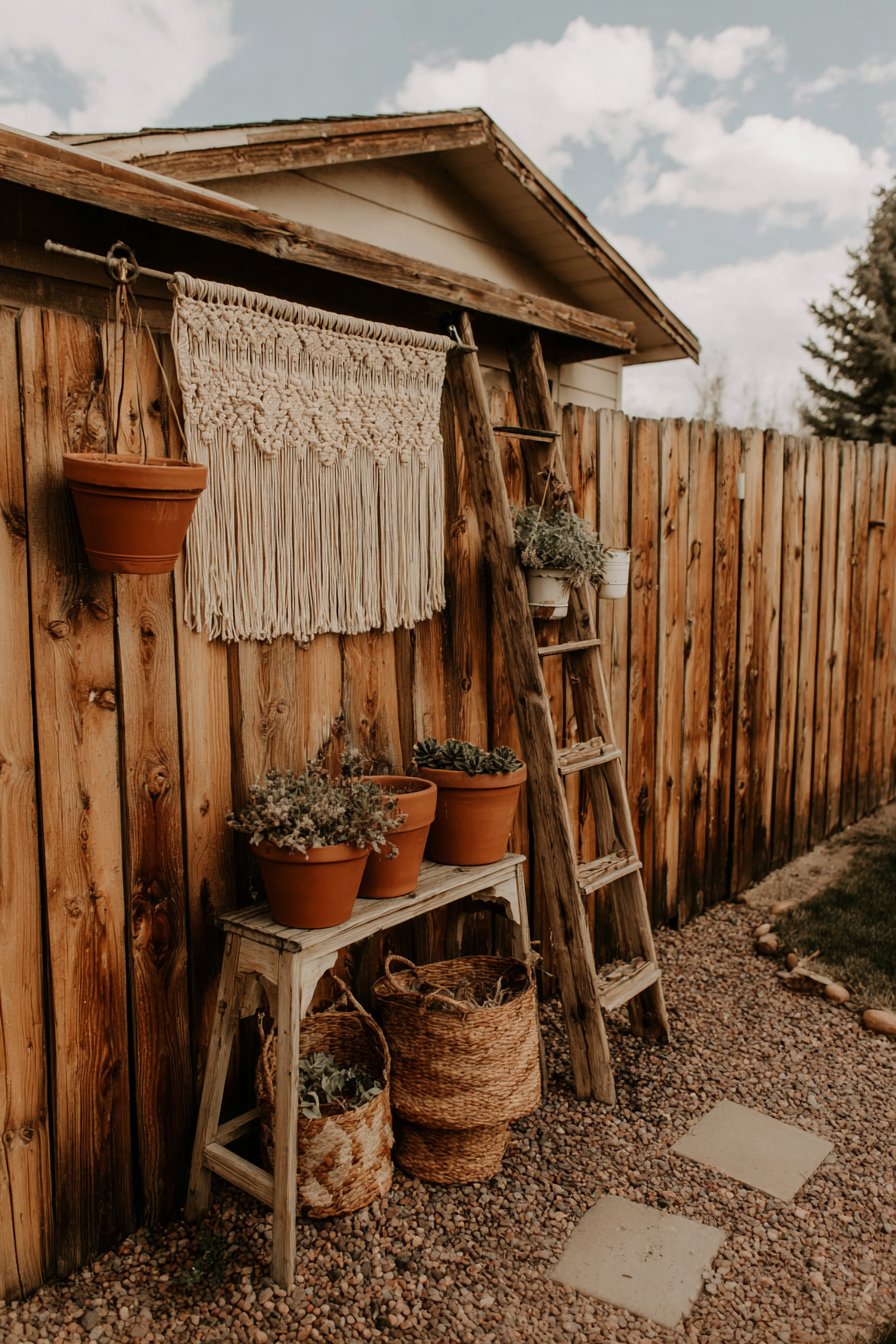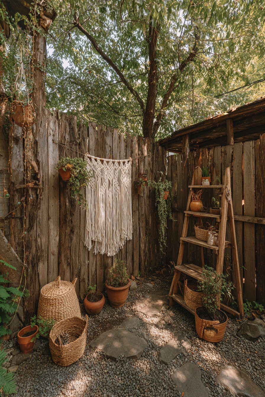 The layering technique employed here exemplifies bohemian design philosophy—nothing feels too precious or rigidly placed, yet the overall effect demonstrates thoughtful curation. A vintage wooden ladder leans casually against the fence, its rungs providing display surfaces for small potted plants at different heights. Woven baskets in varying sizes punctuate the arrangement, adding textural variety and warm brown tones that bridge the cream macramé and green foliage. The ground treatment continues this relaxed aesthetic with a mix of pea gravel and irregular stepping stones that invite exploration rather than dictating rigid pathways.
