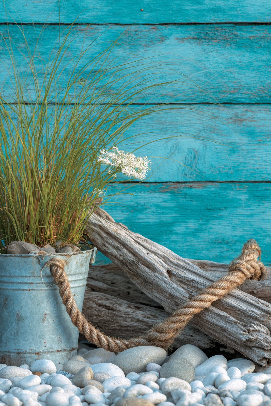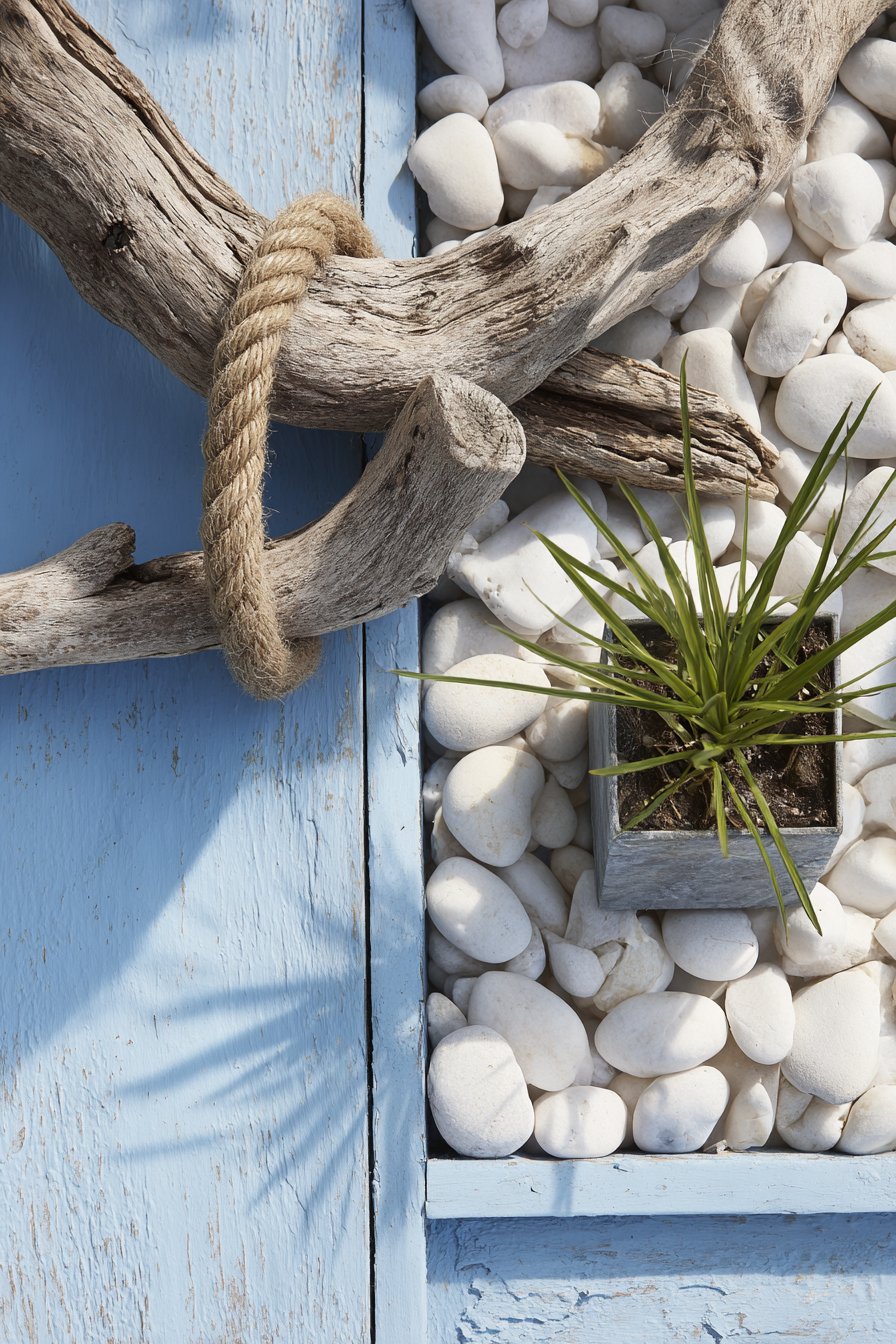 The base treatment deserves equal attention—white pebbles create a clean, bright border that references shorelines while providing definition between vertical and horizontal planes. Morning light proves ideal for this installation, as the low angle emphasizes the driftwood’s sculptural qualities through dramatic shadows while the blue fence captures the sky’s early freshness. The overall effect balances nostalgia with sophistication, creating a space that feels vacation-inspired without resorting to clichéd beach kitsch.