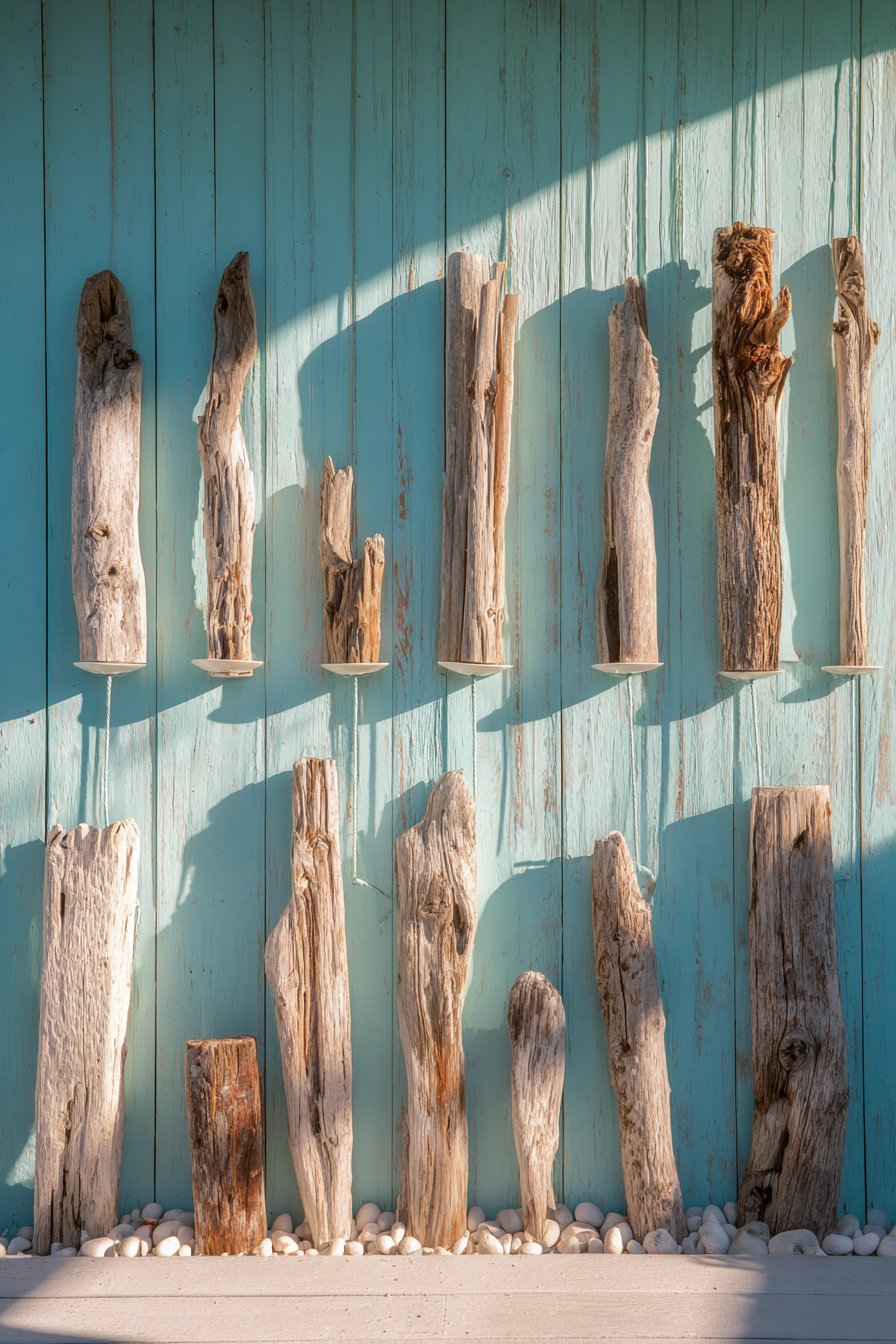 - Select driftwood pieces in varying sizes and shapes to create visual interest while maintaining coastal authenticity