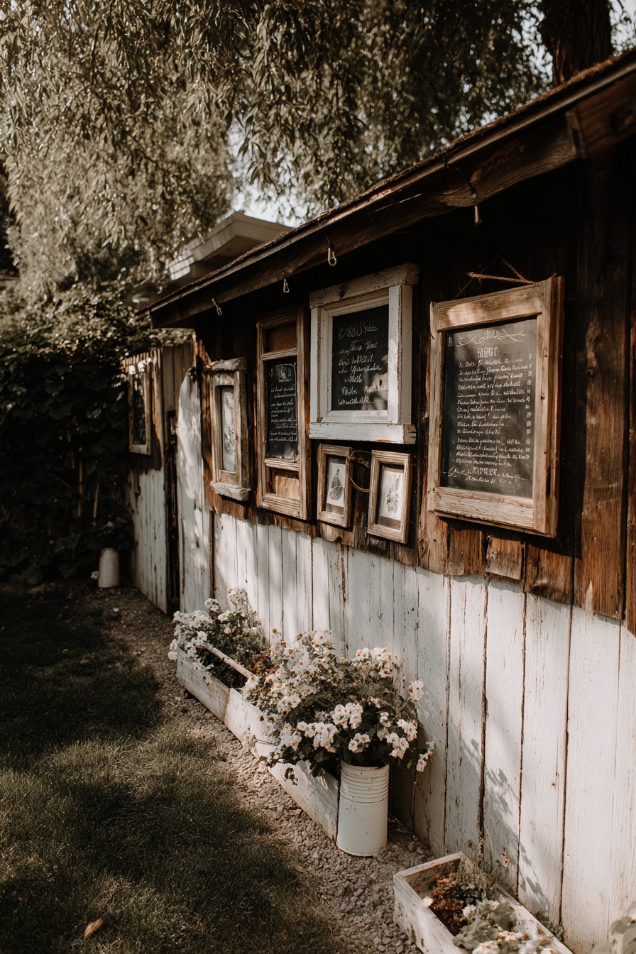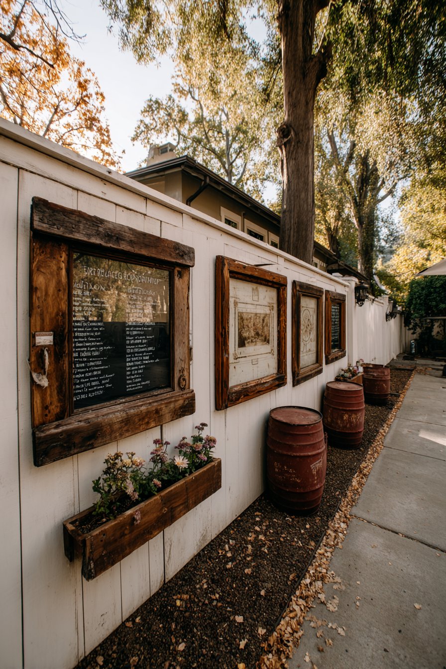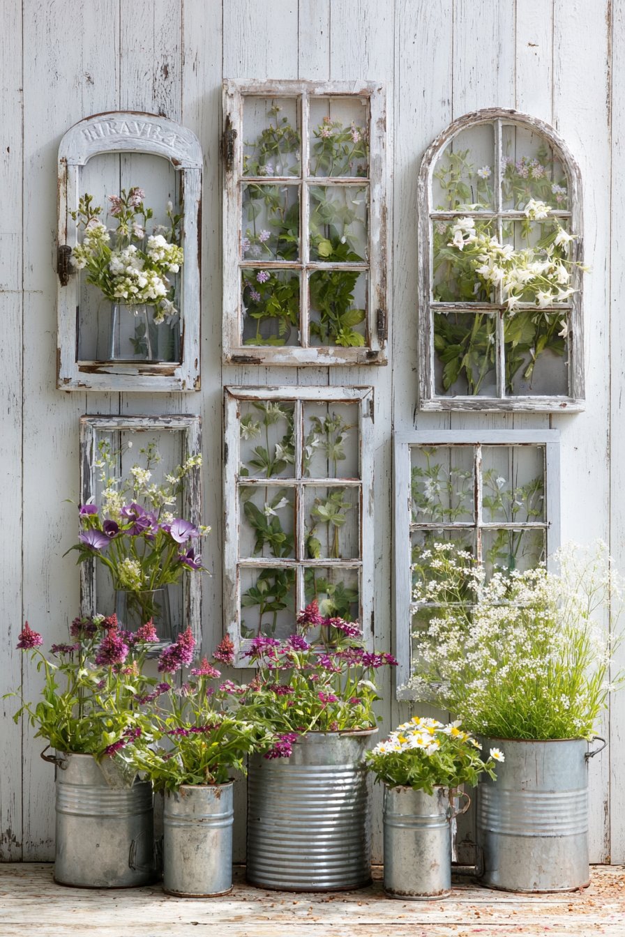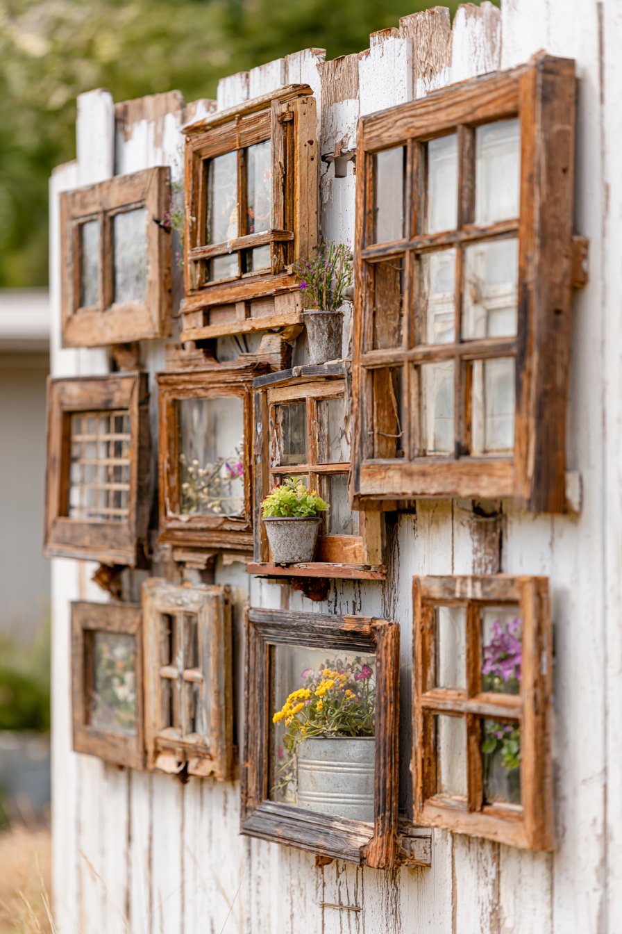 Architectural salvage breathes new life into outdoor walls through this farmhouse-inspired gallery of repurposed window frames. Each antique frame carries its own history—chipped paint revealing layers underneath, wavy glass showing age, hardware that speaks of different eras and manufacturing techniques. Arranged on a white-washed wood fence, these windows create an outdoor gallery where each “artwork” serves different functions: vintage mirrors reflect light and garden views, chalkboard menus allow for changeable messages and seasonal greetings, pressed botanical displays showcase dried flowers protected behind glass. The collection feels personal and evolved, as if accumulated over years rather than purchased in a single shopping trip.