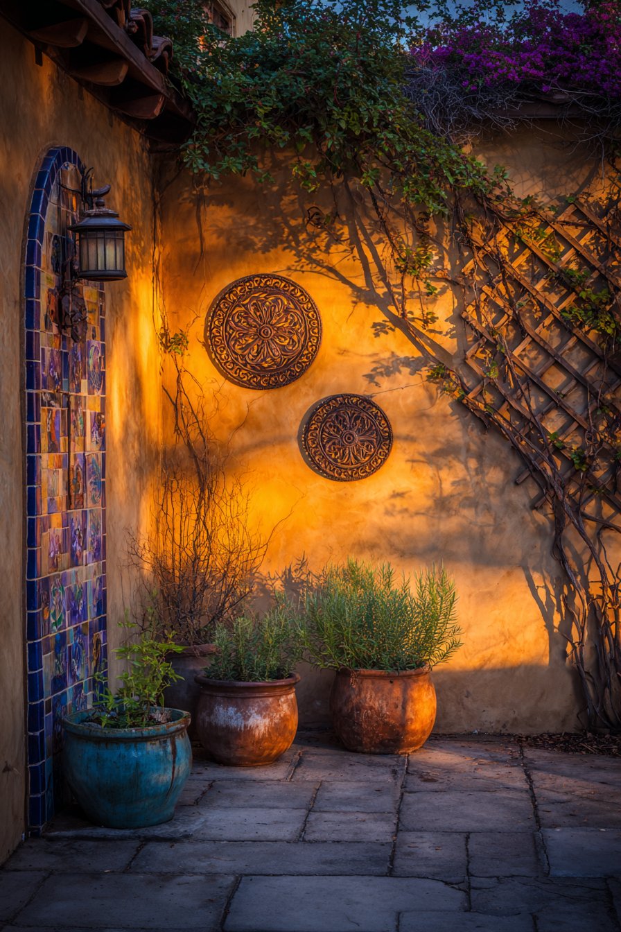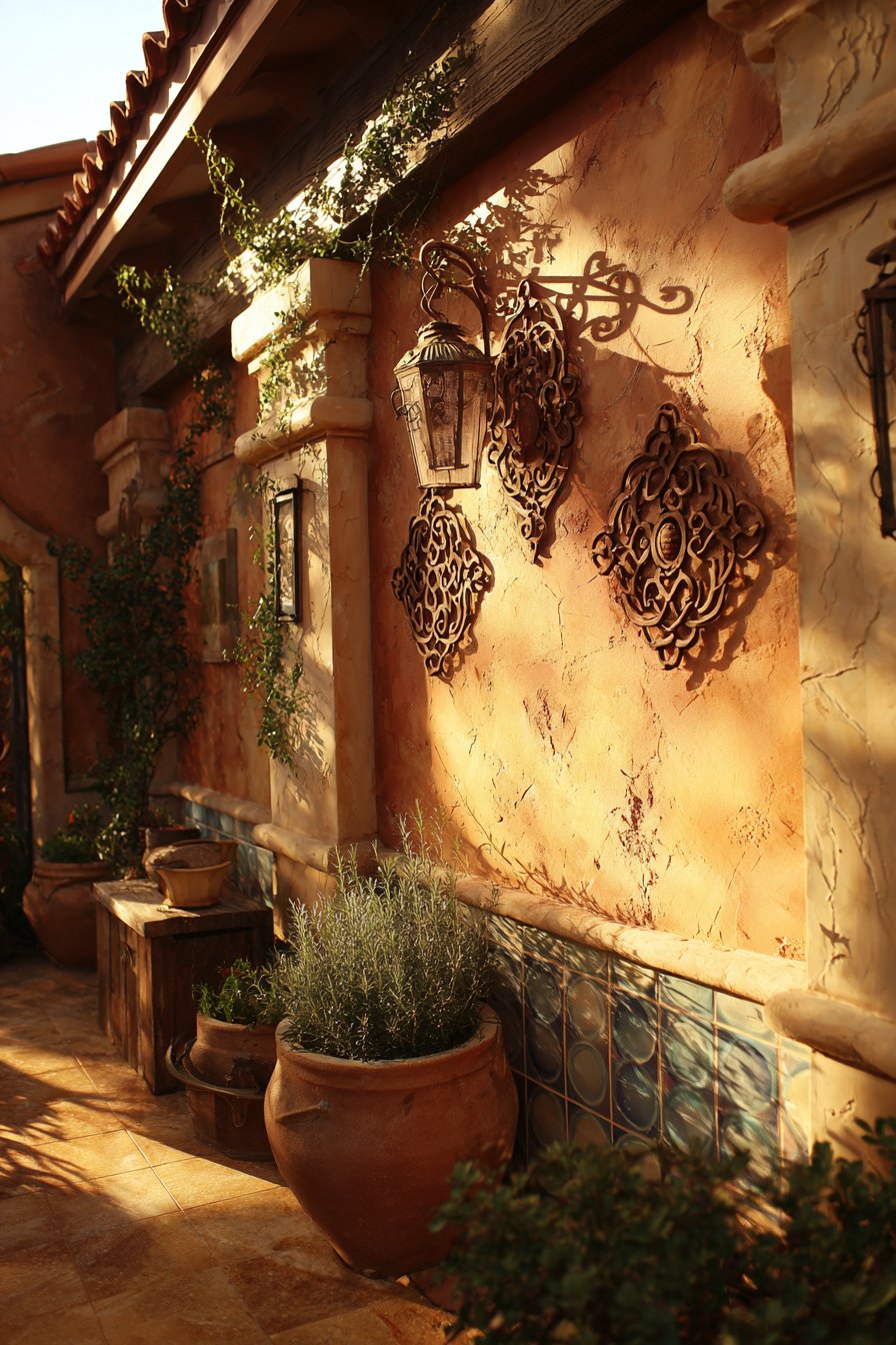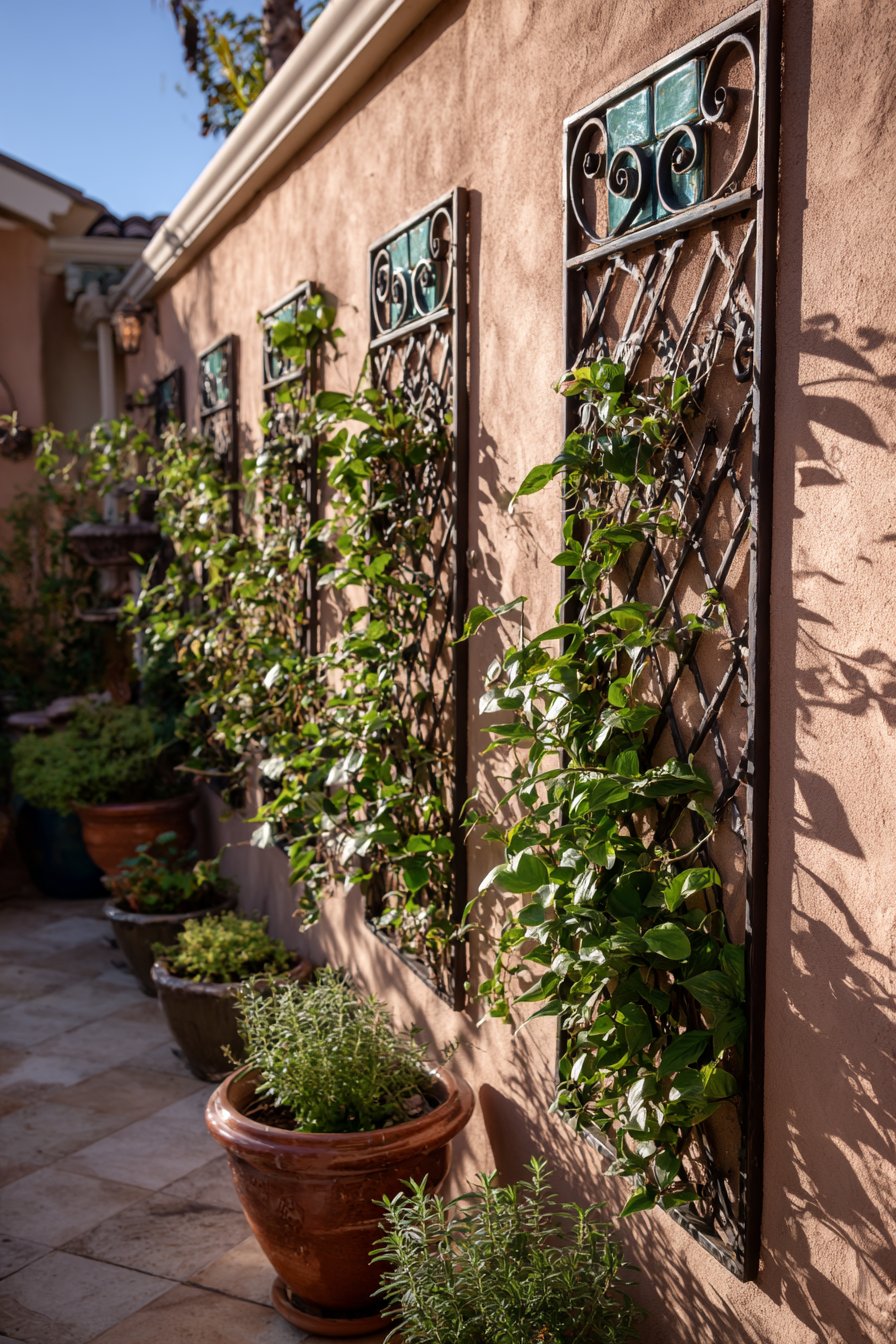 Ornate metalwork and warm earth tones define this Mediterranean-inspired approach that transforms plain walls into European-inspired vistas. Wrought iron wall medallions mounted on terracotta-colored stucco immediately establish old-world elegance through their intricate scrollwork and dimensional quality. These pieces, whether authentic vintage finds or well-crafted reproductions, demonstrate the metalworking artistry associated with Spanish, Italian, and Moroccan design traditions. Climbing jasmine vines weave through sections of decorative metal trellis, their white blooms releasing intoxicating fragrance while softening the metal’s formality with organic growth patterns.