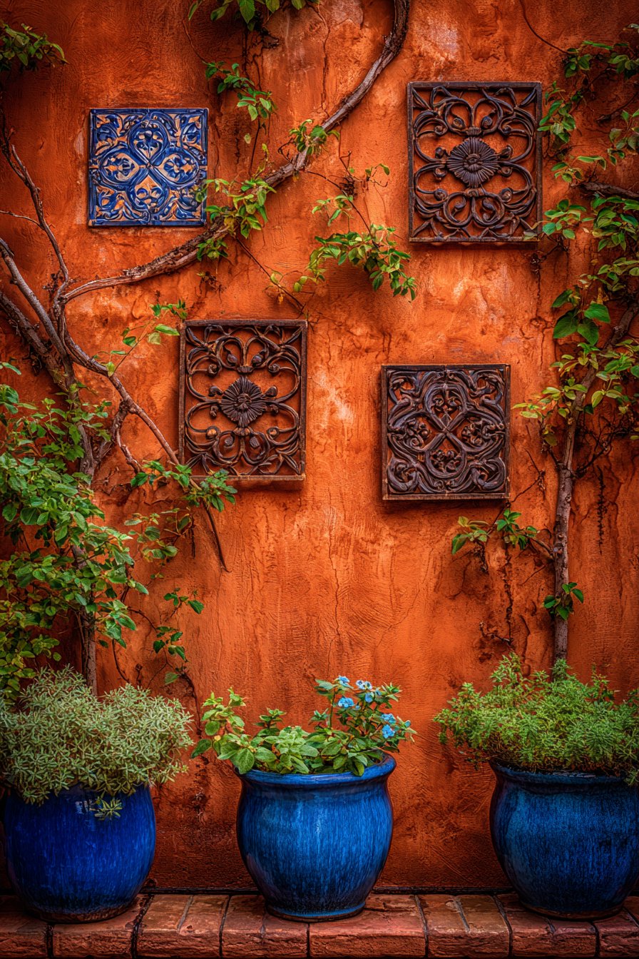 Ceramic tile accents in cobalt blue provide brilliant color contrast that references Mediterranean coastlines and traditional decorative arts. These tiles might be arranged in geometric patterns, inserted individually as jewel-like accents, or grouped to create focal points within the broader composition. The deep blue against terracotta creates the classic color combination associated with Spanish and Greek architecture, immediately signaling regional influence. Clay pot planters at ground level continue the earthenware theme while containing fragrant herbs like rosemary, lavender, and oregano that thrive in Mediterranean climates and contribute sensory appeal beyond visual interest.