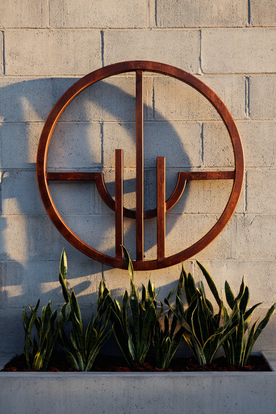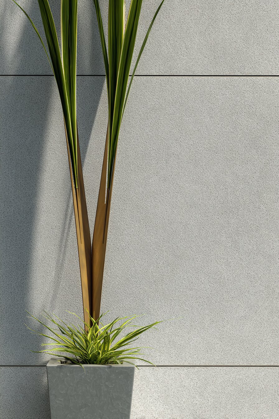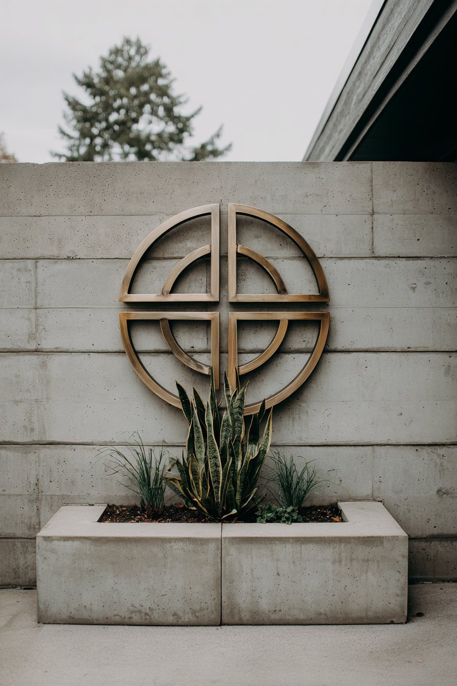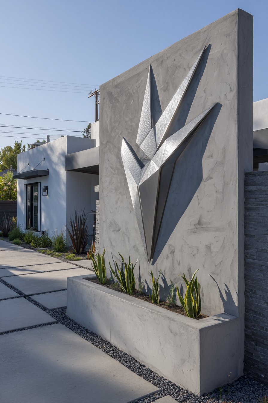The supporting linear planter box echoes the fence material in matching concrete, creating cohesive unity while providing necessary contrast through horizontal placement against the vertical wall. Architectural plants like snake plants (Sansevieria) fill this planter, their vertical sword-like leaves adding organic geometry that complements rather than competes with the metal sculpture. The plants’ gray-green coloring and striking form maintain the minimalist aesthetic—no busy flowers or excessive foliage to distract from the clean composition.