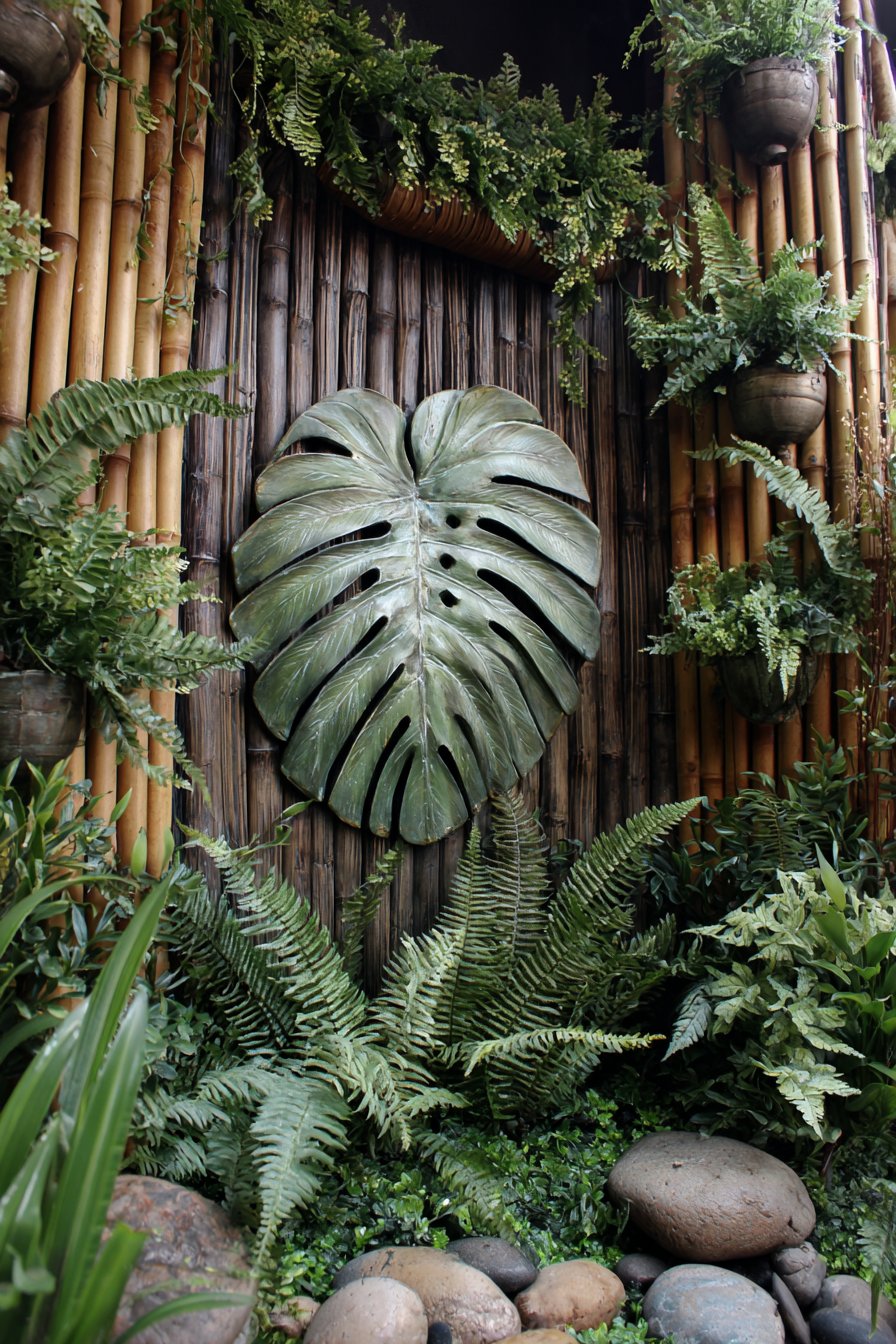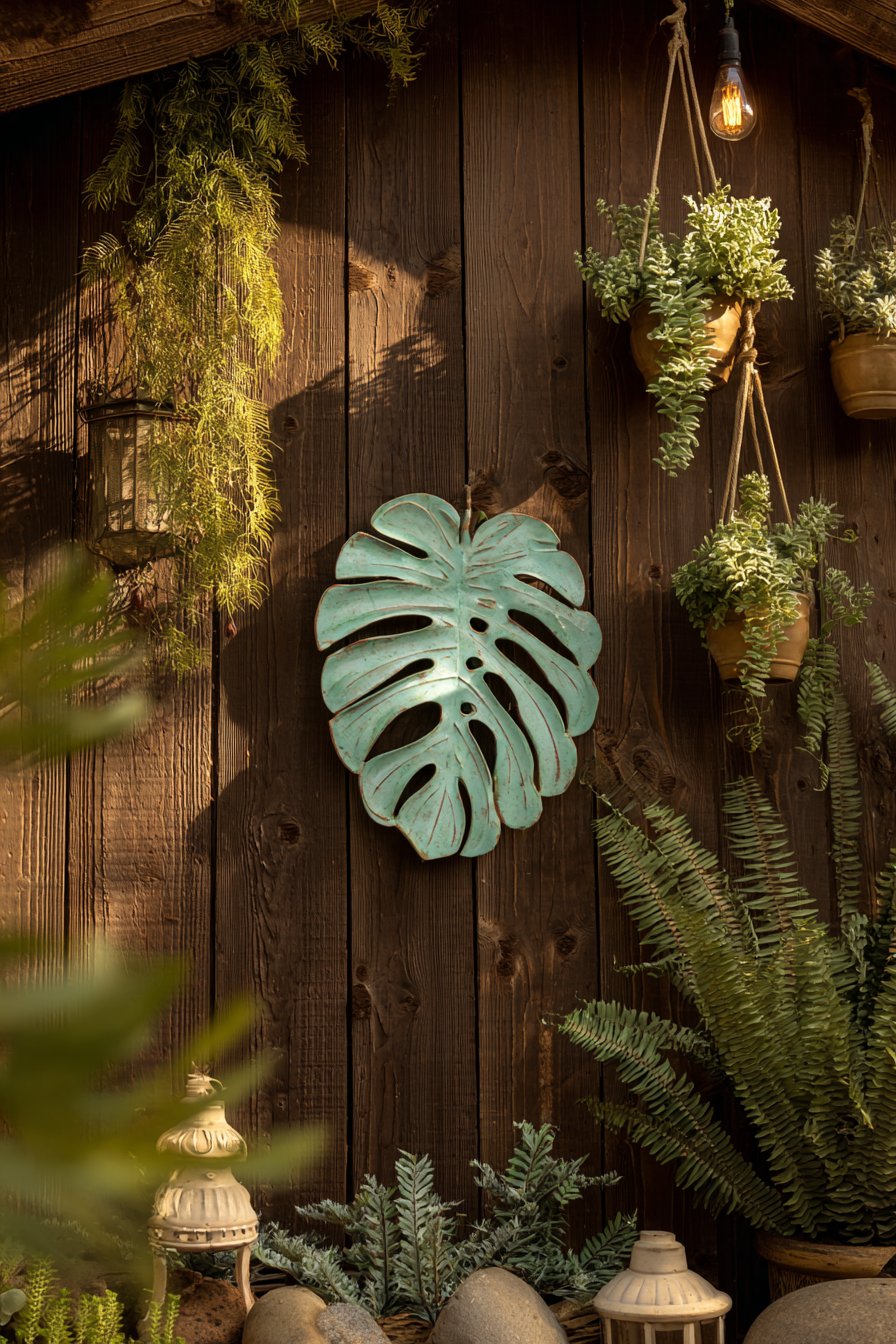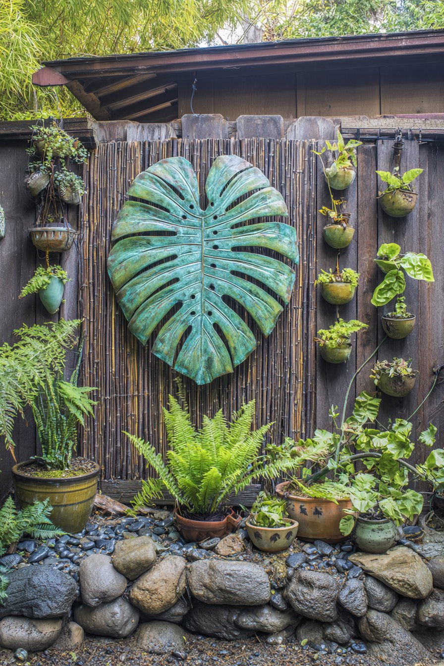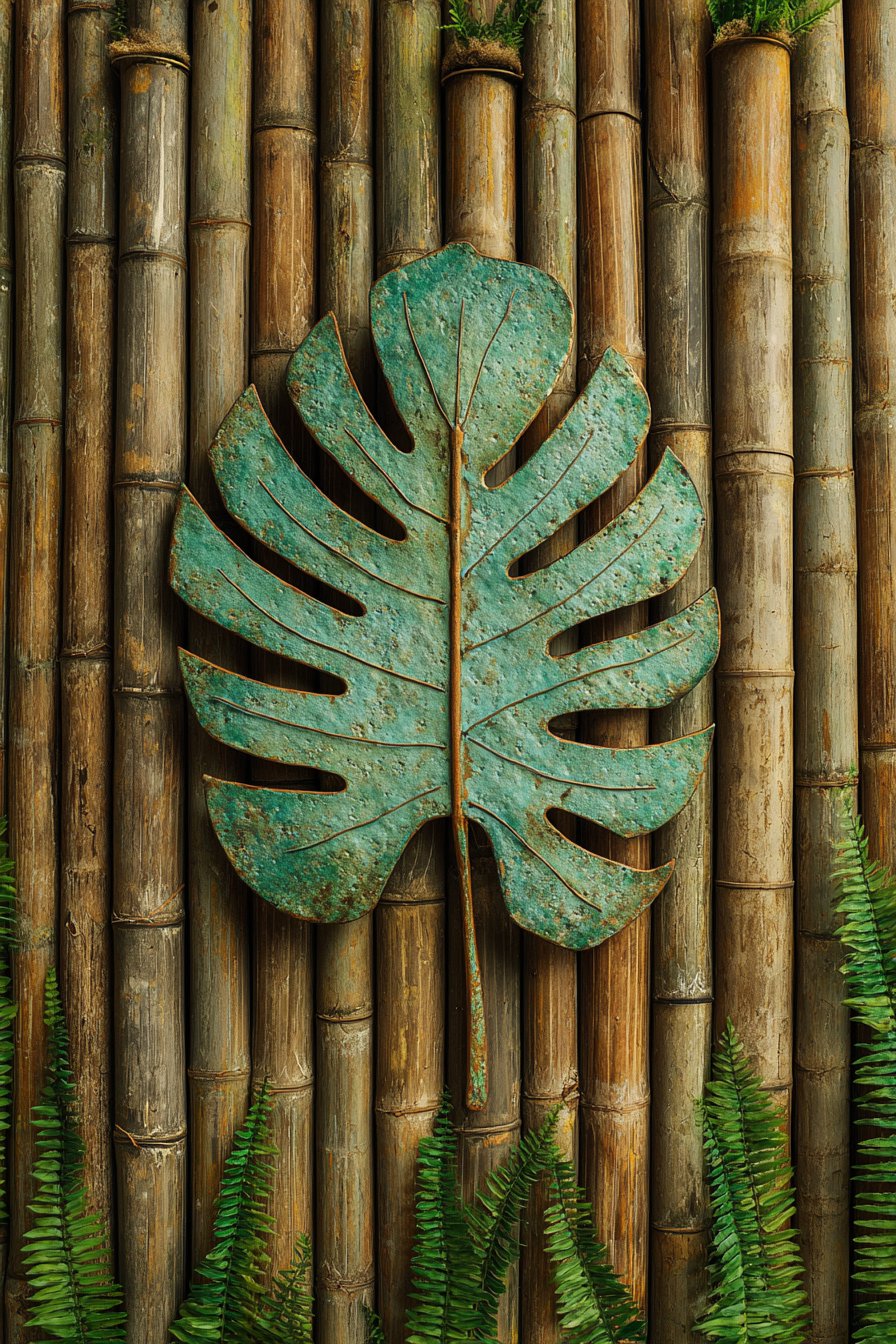 Bold botanical forms rendered in metal bring tropical drama to backyard walls through oversized leaf sculptures that make immediate impact. A large monstera leaf—that iconic Swiss cheese plant form—commands attention in verdigris finish, its blue-green patina suggesting age and tropical humidity. This single sculptural element establishes the theme clearly and confidently against a dark stained wood fence that provides contrast while suggesting the deep shadows found in tropical forests. Surrounding the centerpiece, bamboo privacy panels introduce authentic tropical material while providing additional screening and textural variation through their natural sectioned structure.
