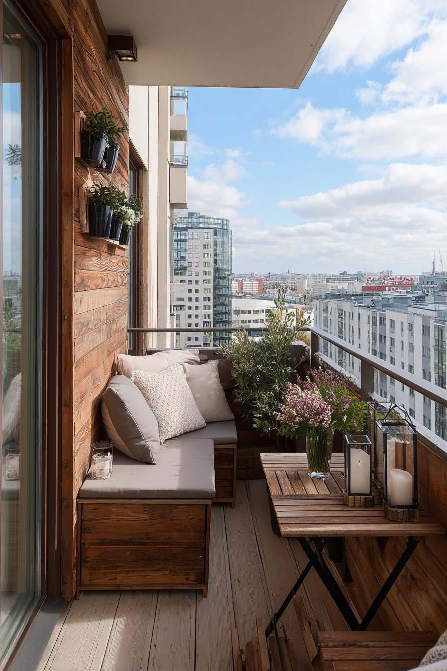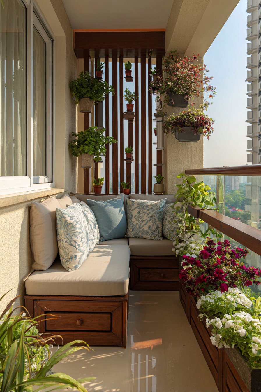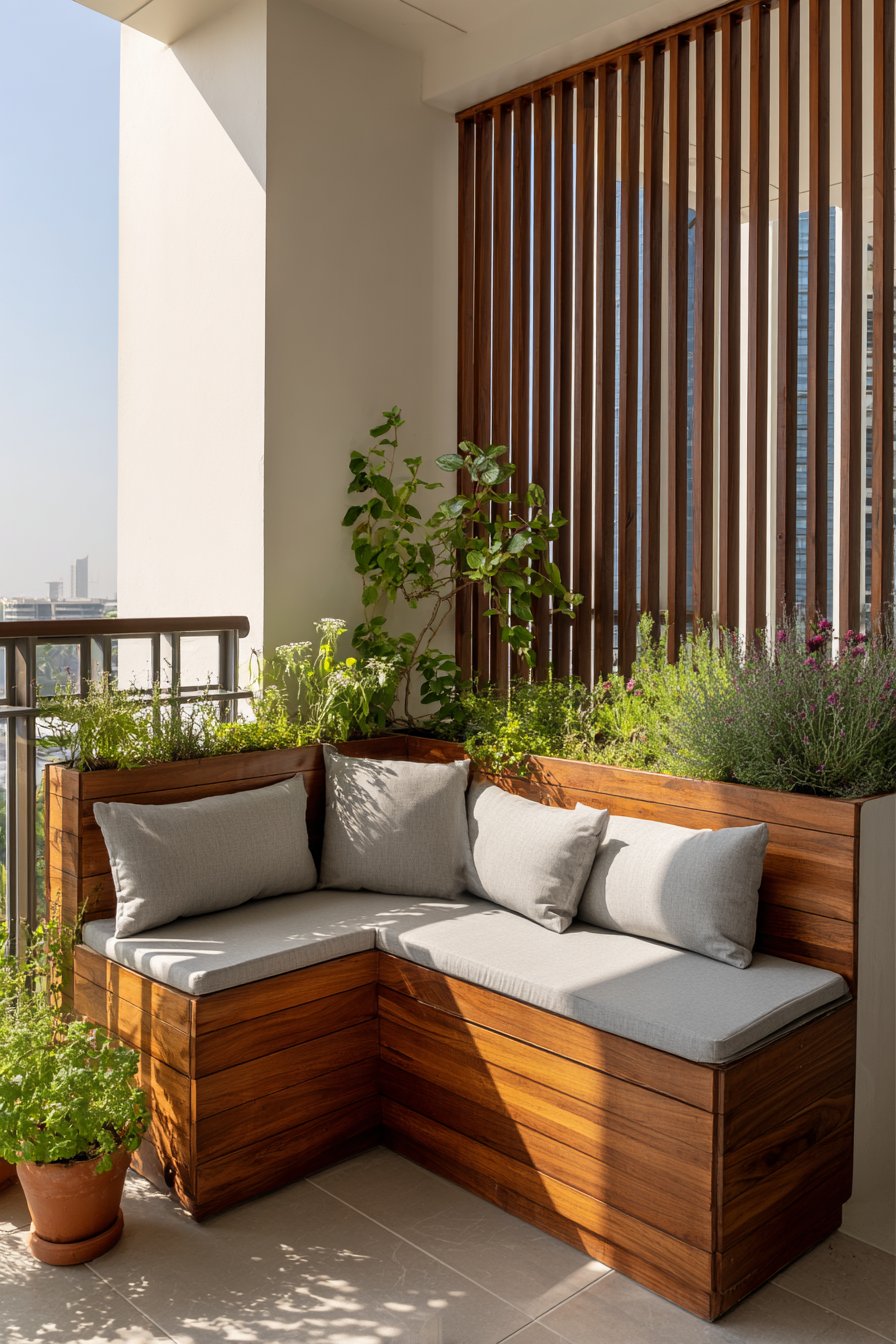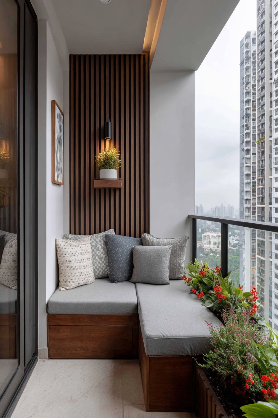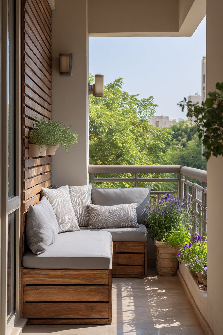 The vertical wooden slat privacy screen serves multiple purposes beyond mere aesthetics. It creates an intimate atmosphere while maintaining airflow and allowing filtered natural light to dance across the space throughout the day. This semi-transparent barrier transforms a public-facing balcony into a private retreat without the claustrophobic feeling of solid walls. The natural wood grain adds warmth and texture, complementing the grey cushions with organic visual interest.
