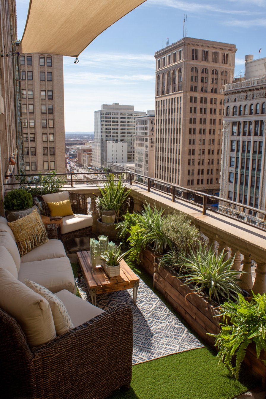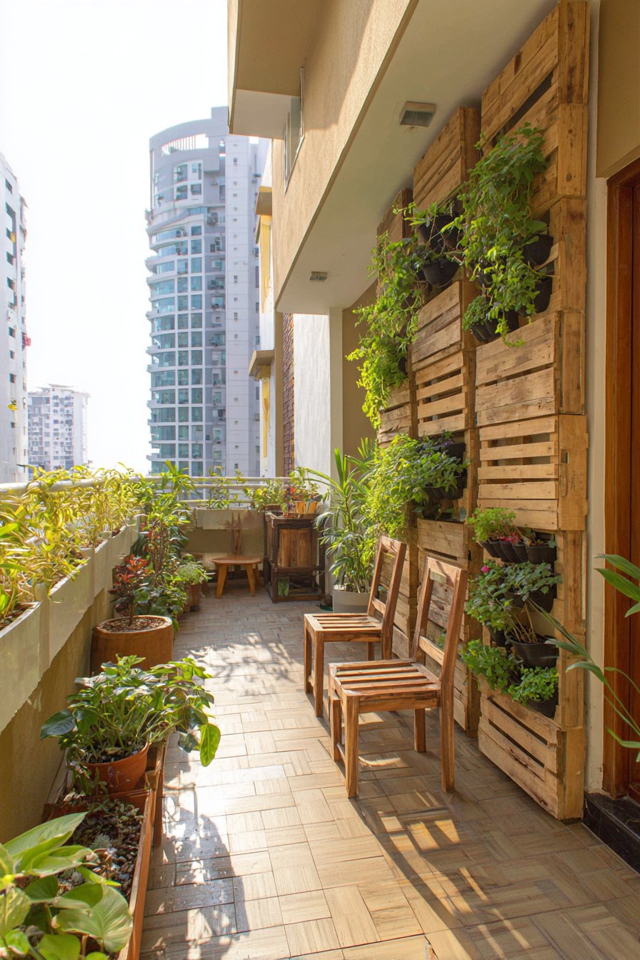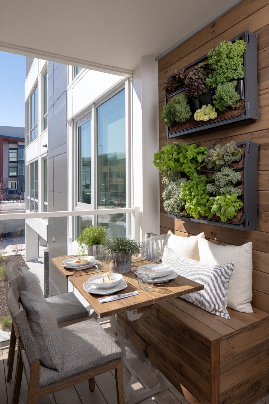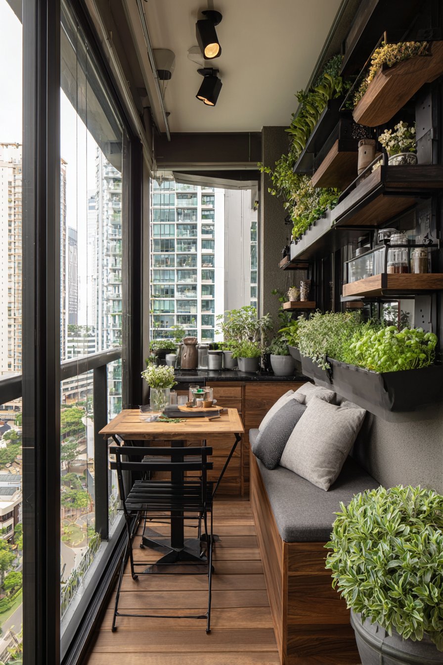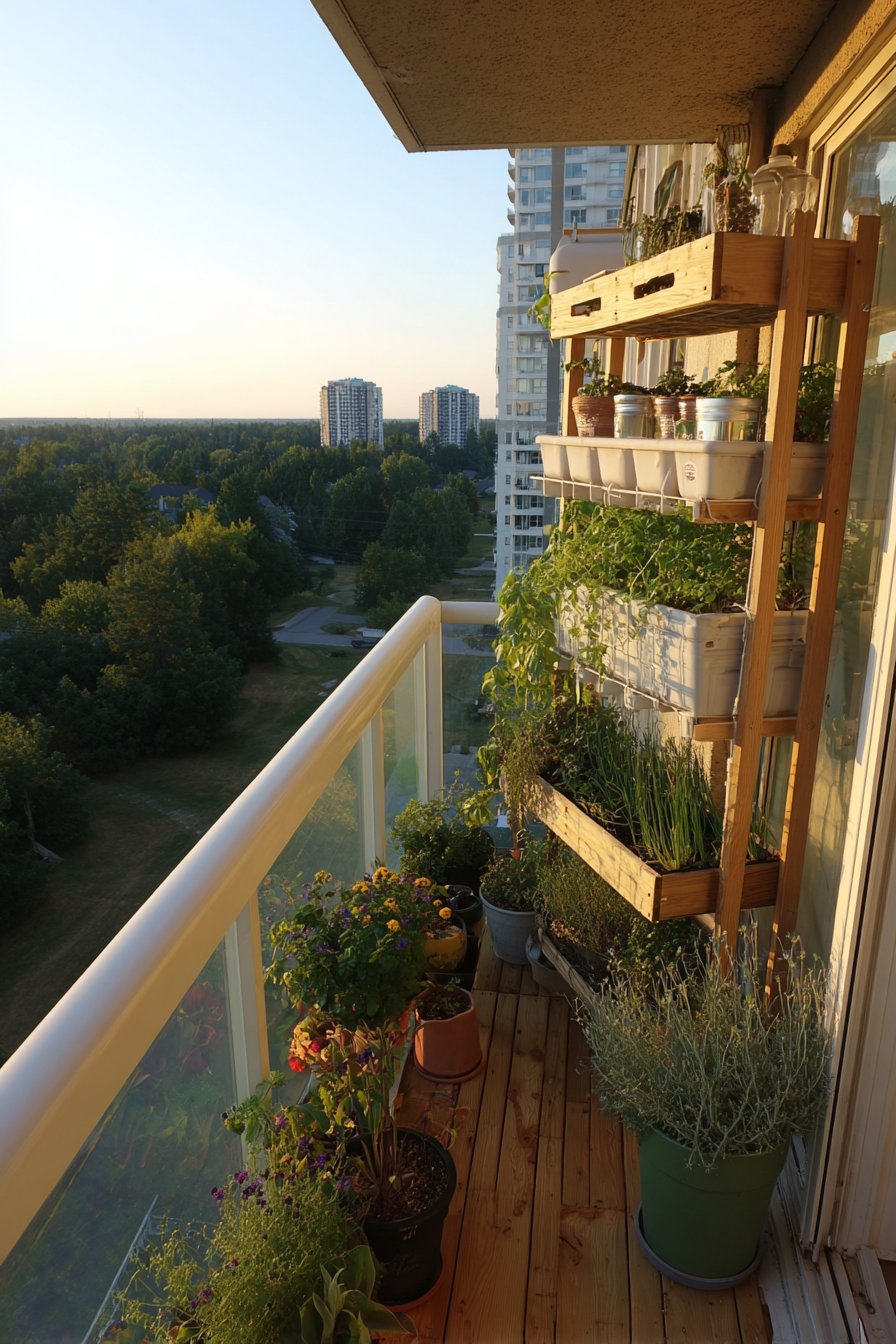Potted herbs and small flowering plants lining the railing introduce living elements that engage multiple senses. Fresh basil, rosemary, and thyme offer culinary convenience while releasing fragrant oils on warm days, while compact flowering varieties add seasonal color bursts. This arrangement maximizes vertical space along the railing, keeping the floor area open for movement while bringing nature within arm’s reach. Morning light illuminates this practical setup, highlighting the thoughtful integration of comfort, storage, and greenery.