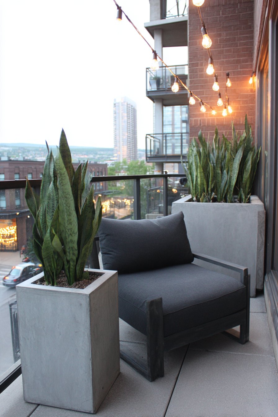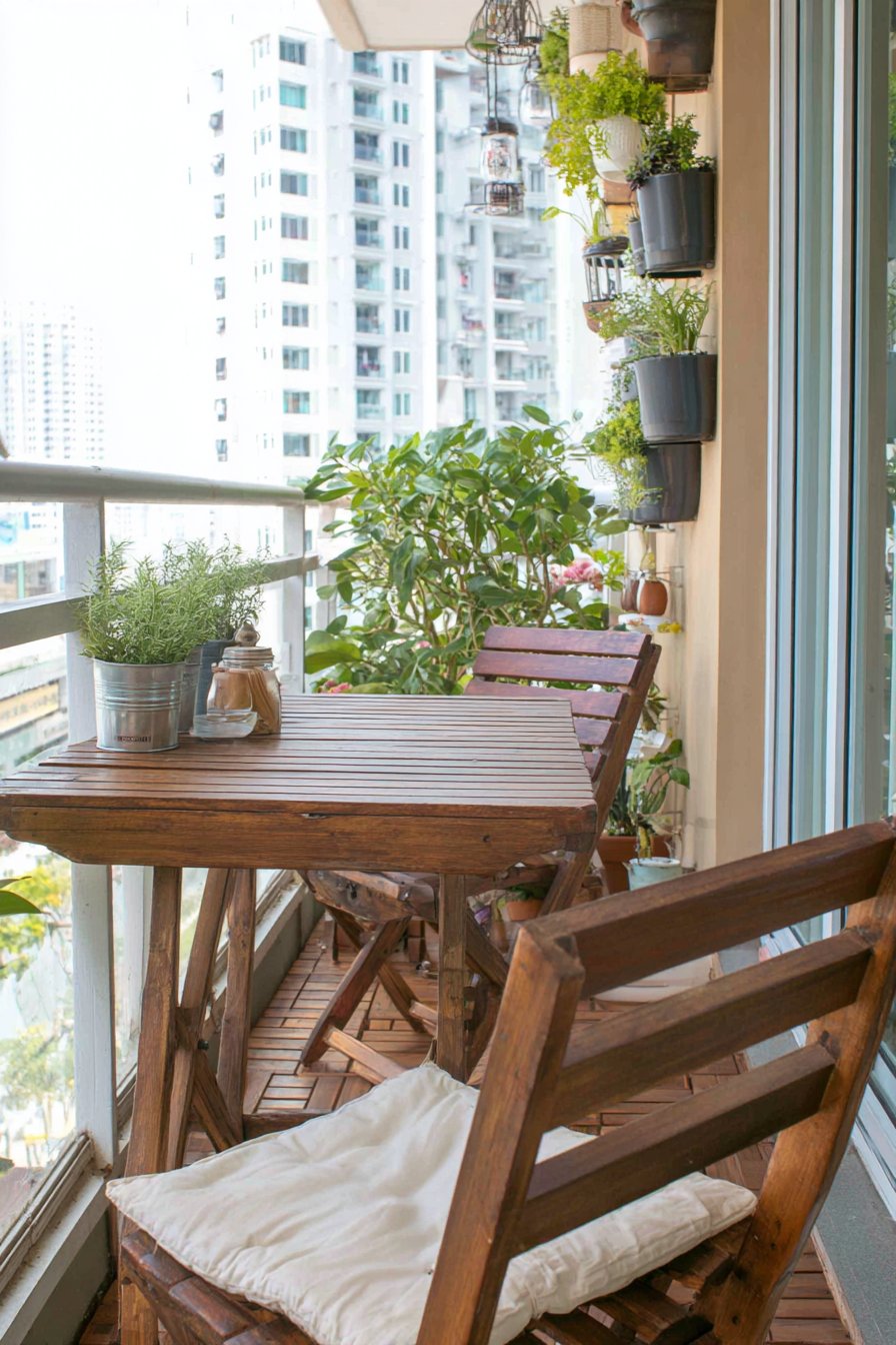 Minimalism in balcony design doesn’t mean sacrificing comfort or personality—it means editing down to essentials and celebrating the beauty of simplicity. This sleek metal bistro set arrangement demonstrates how restraint creates visual calm and spatial clarity. The two-chair, round-table configuration provides functional dining or work surface without overwhelming the available space, while the clean lines and simple silhouettes maintain an uncluttered aesthetic.