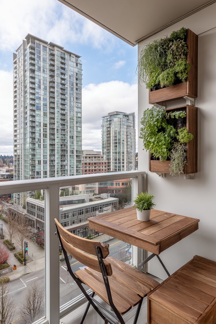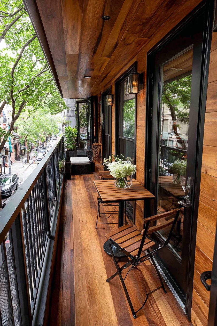 Narrow balconies present unique design challenges requiring specialized furniture and creative space planning. This solution for limited-width spaces features wall-mounted fold-down furniture that provides functionality when needed without permanent space occupation. The slimline bistro set can be easily moved aside when floor space is needed for other purposes, providing dining or work surface without spatial commitment.