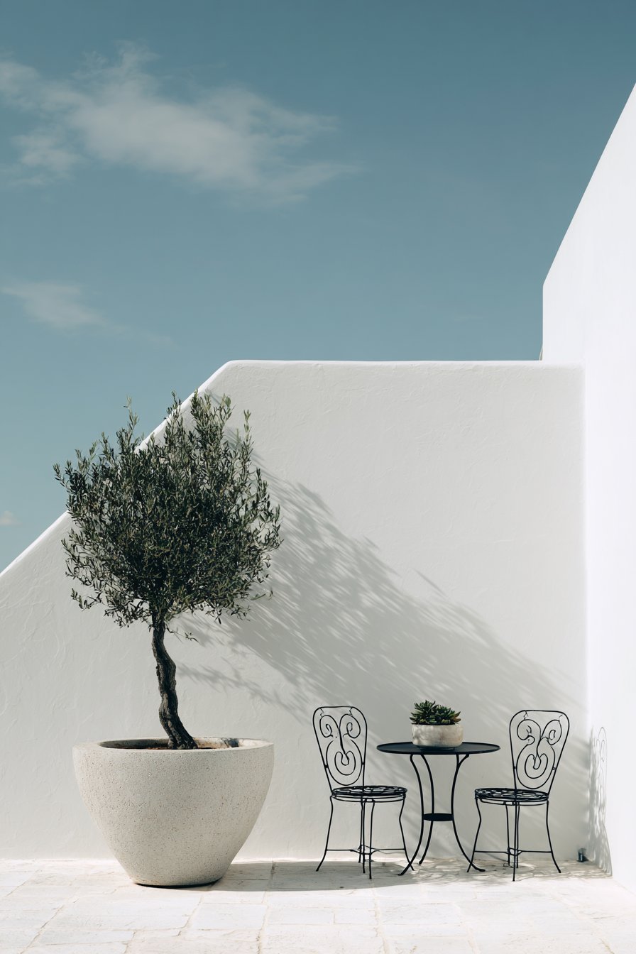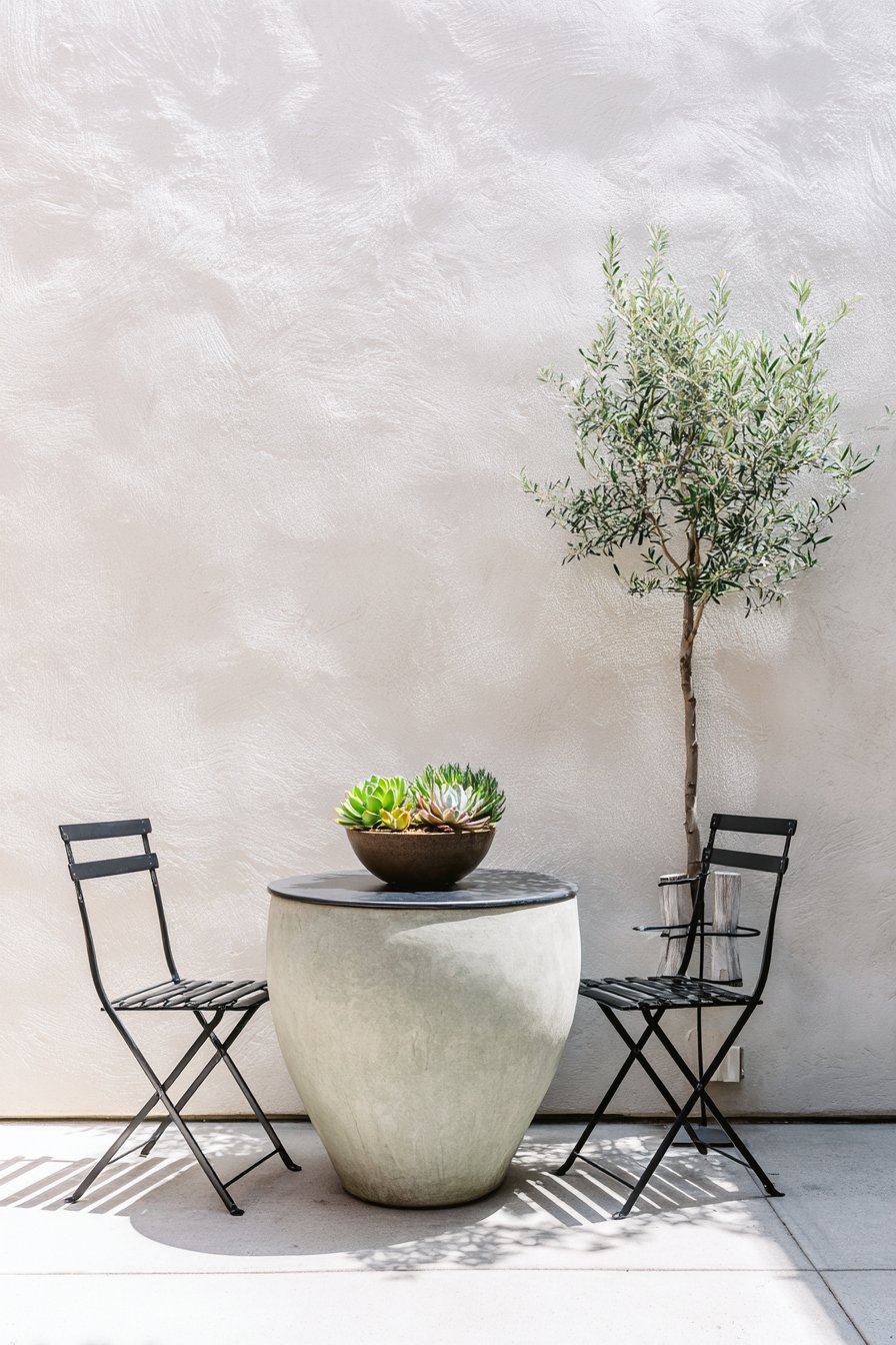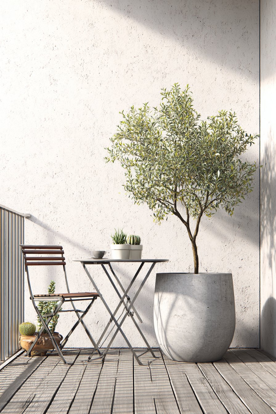 The statement olive tree in a large concrete planter introduces organic form and living greenery without the visual busyness of multiple smaller plants. This single focal point creates dramatic impact while reinforcing the minimalist principle of “less is more.” The concrete planter’s smooth, monolithic form complements the metal furniture, creating material harmony through industrial-modern elements. Its substantial weight also provides stability in windy conditions without requiring unsightly anchoring systems.