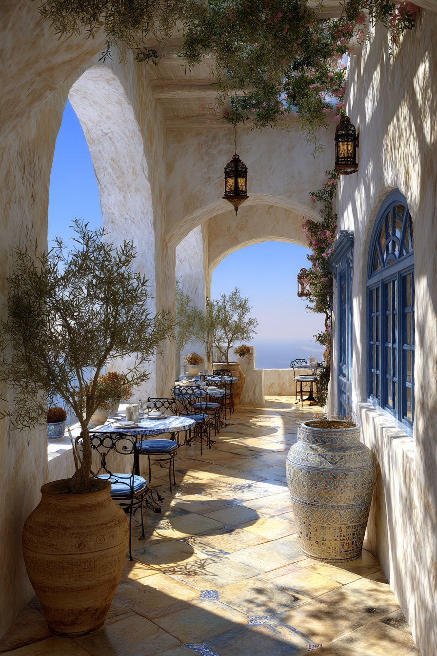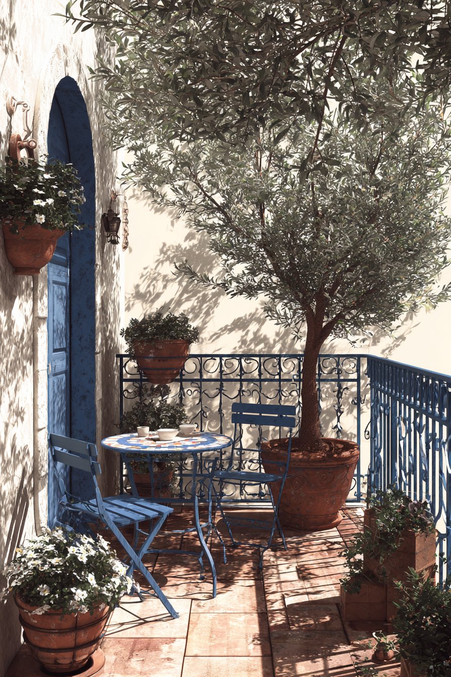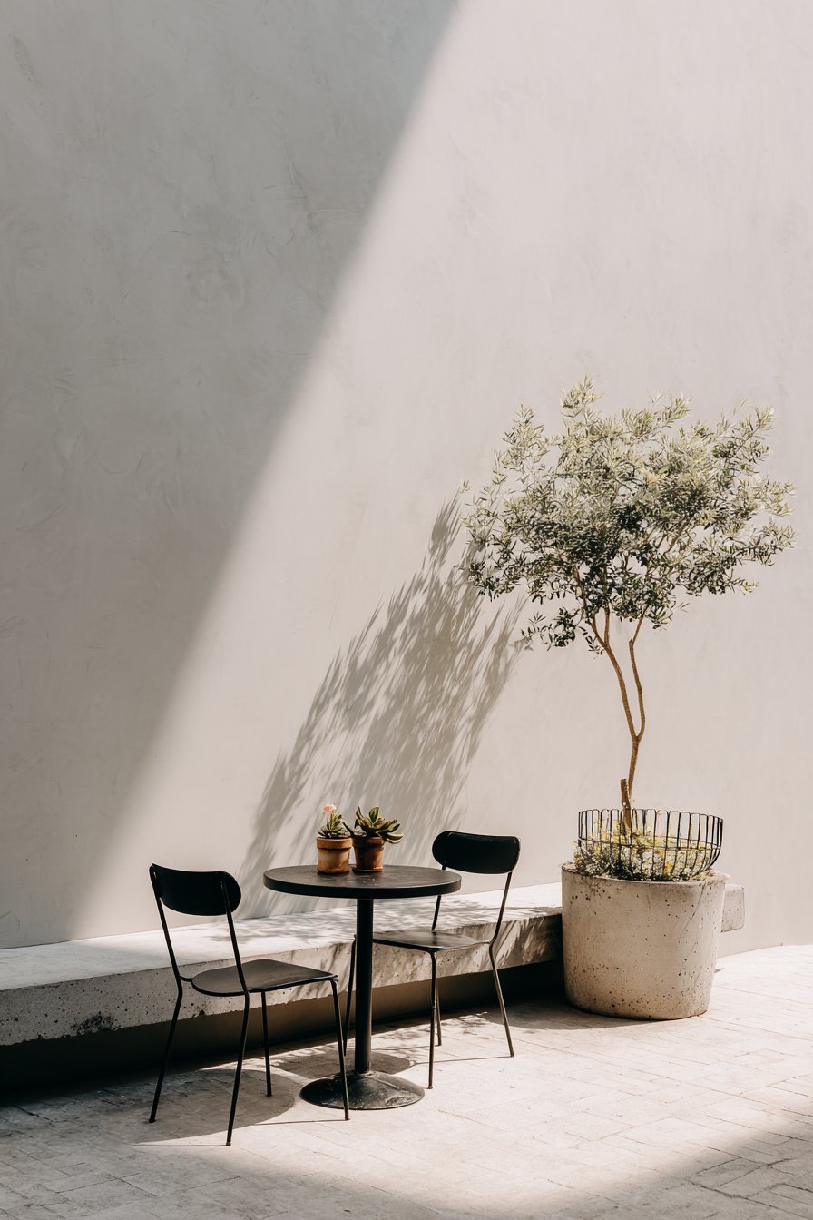 The statement olive tree in a large concrete planter introduces organic form and living greenery without the visual busyness of multiple smaller plants. This single focal point creates dramatic impact while reinforcing the minimalist principle of “less is more.” The concrete planter’s smooth, monolithic form complements the metal furniture, creating material harmony through industrial-modern elements. Its substantial weight also provides stability in windy conditions without requiring unsightly anchoring systems.