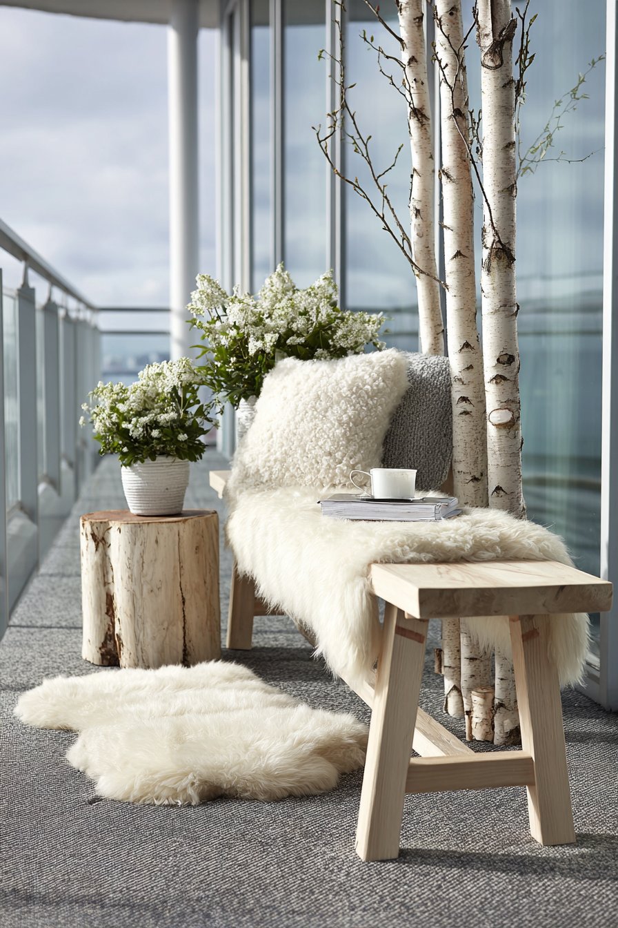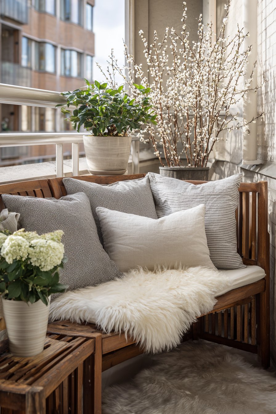 String lights with warm amber bulbs overhead create cozy evening atmosphere as days shorten and outdoor time increasingly occurs after sunset. The amber tone mimics candlelight and harvest celebrations, creating warmer atmosphere than cool white LED alternatives. Natural wood accents throughout complement autumn’s organic aesthetic. Overcast natural lighting creates cozy atmosphere typical of fall weather, while the seasonal transformation demonstrates how easily balcony style can shift to reflect changing seasons through simple textile and accessory updates.