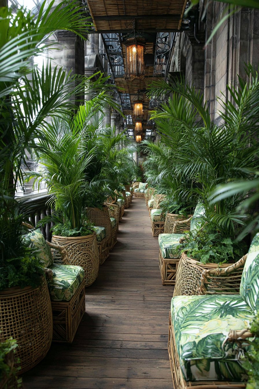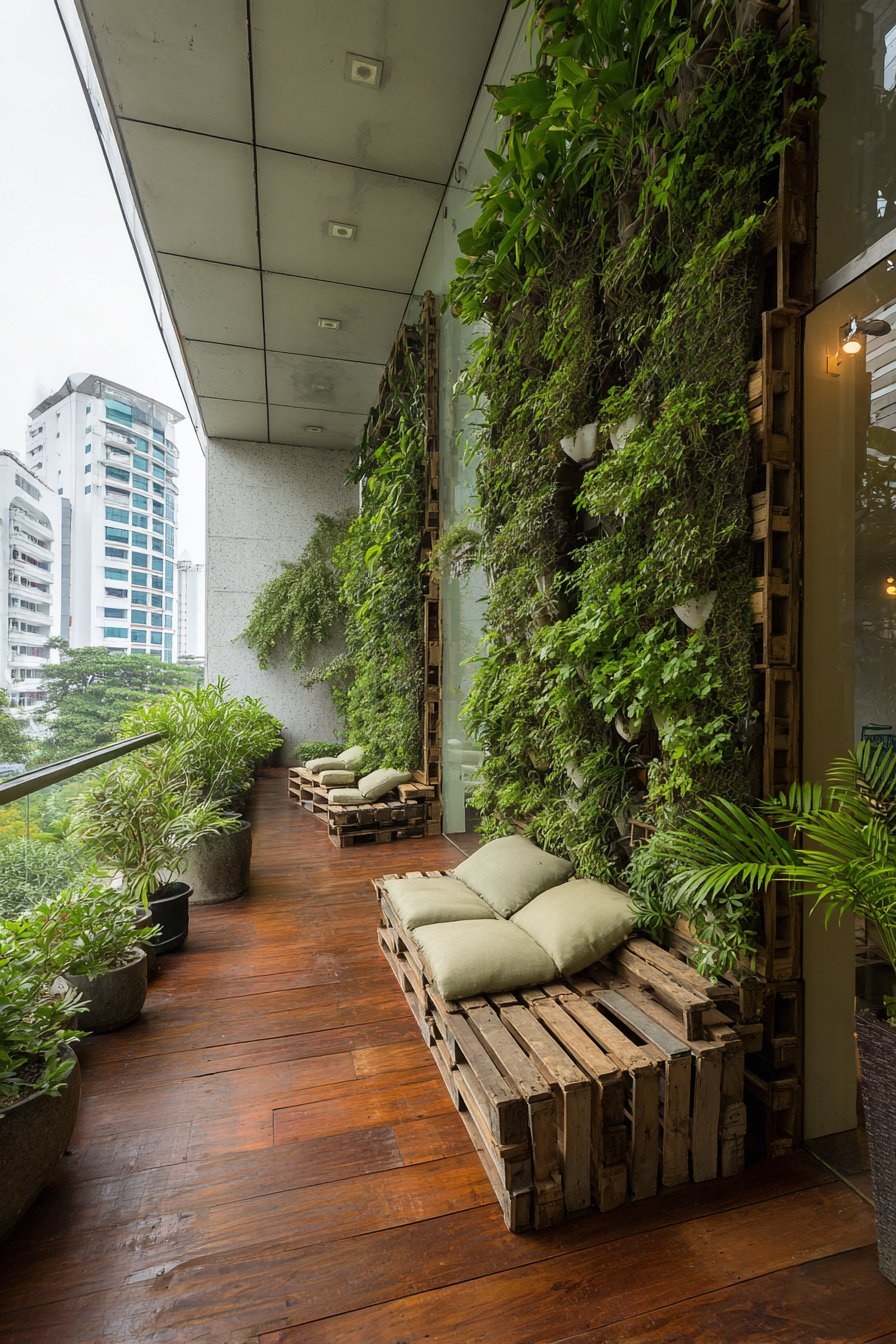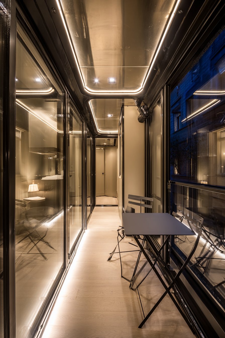 Vertical growing systems maximize wall space for substantial plant collections despite minimal floor area. Wall-mounted planters and trellises move greenery to previously unused surfaces, creating lush garden effect without consuming walking space. Mirrored panels create illusion of depth, visually doubling the apparent width through reflection. This classic design trick makes narrow spaces feel significantly more spacious without physical expansion.