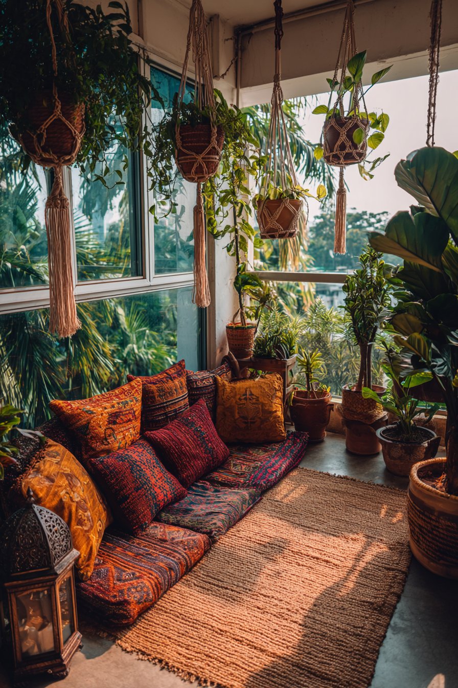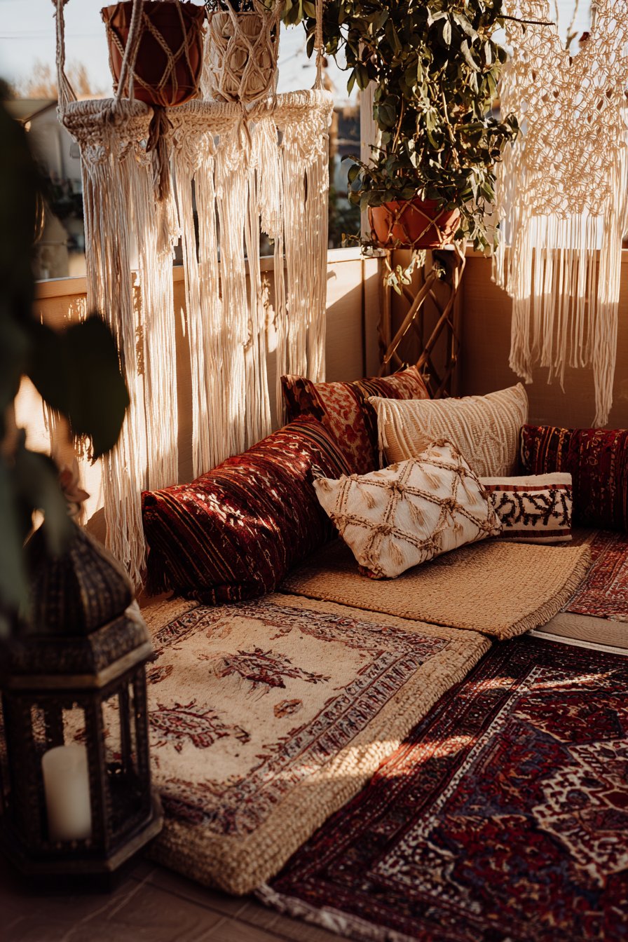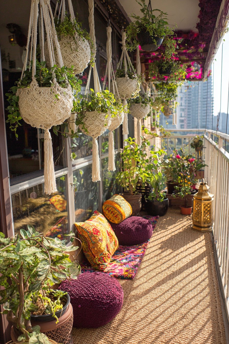 Bohemian design celebrates abundance, texture, and personal expression through carefully curated layers of natural materials and living plants. This balcony interpretation features macramé hanging planters suspended at staggered heights, creating visual rhythm and three-dimensional interest. The handcrafted rope work adds intricate texture while the varying heights draw the eye upward, making the space feel larger and more dynamic than its actual dimensions.