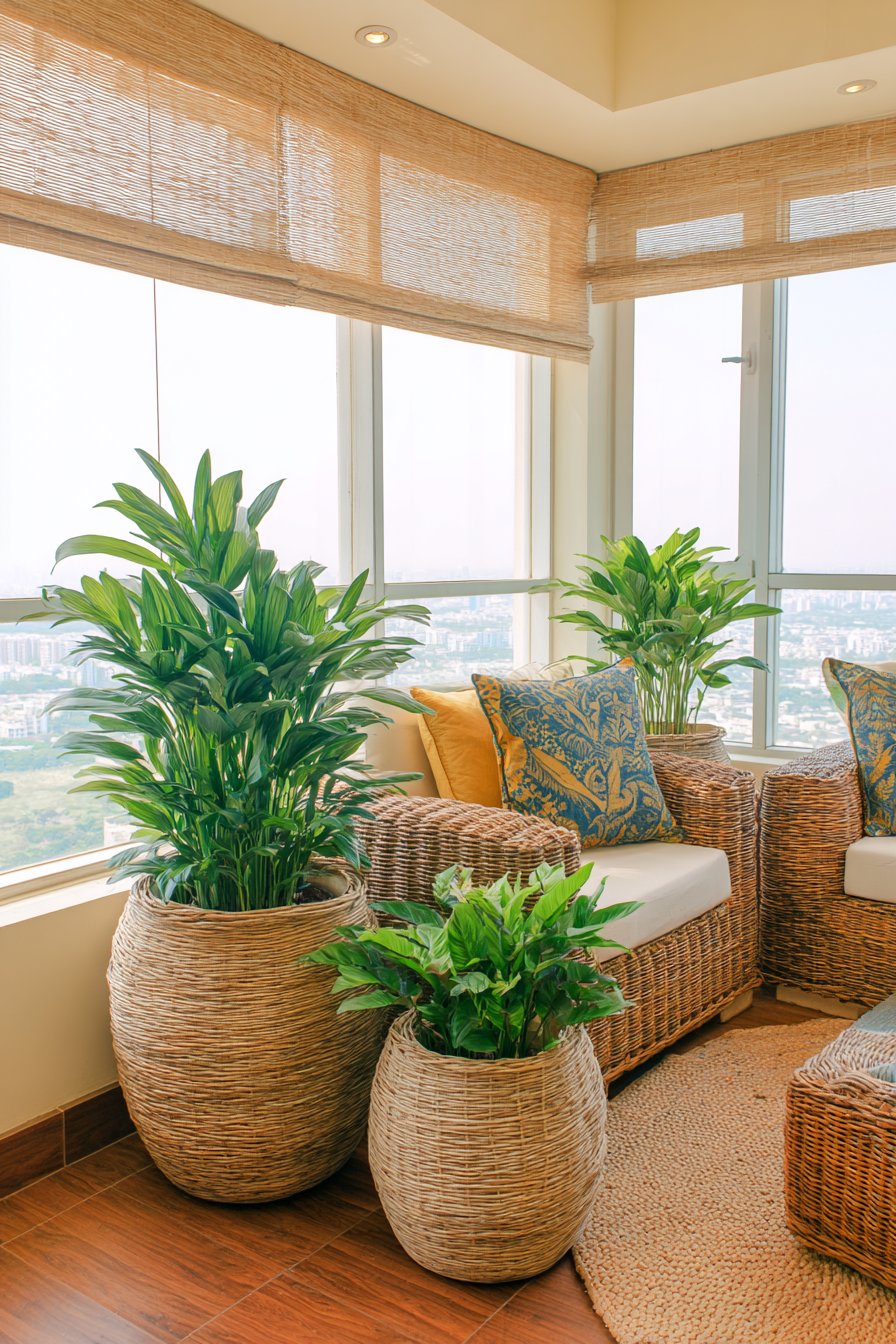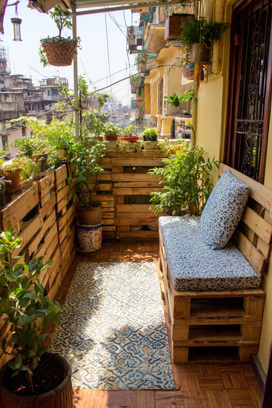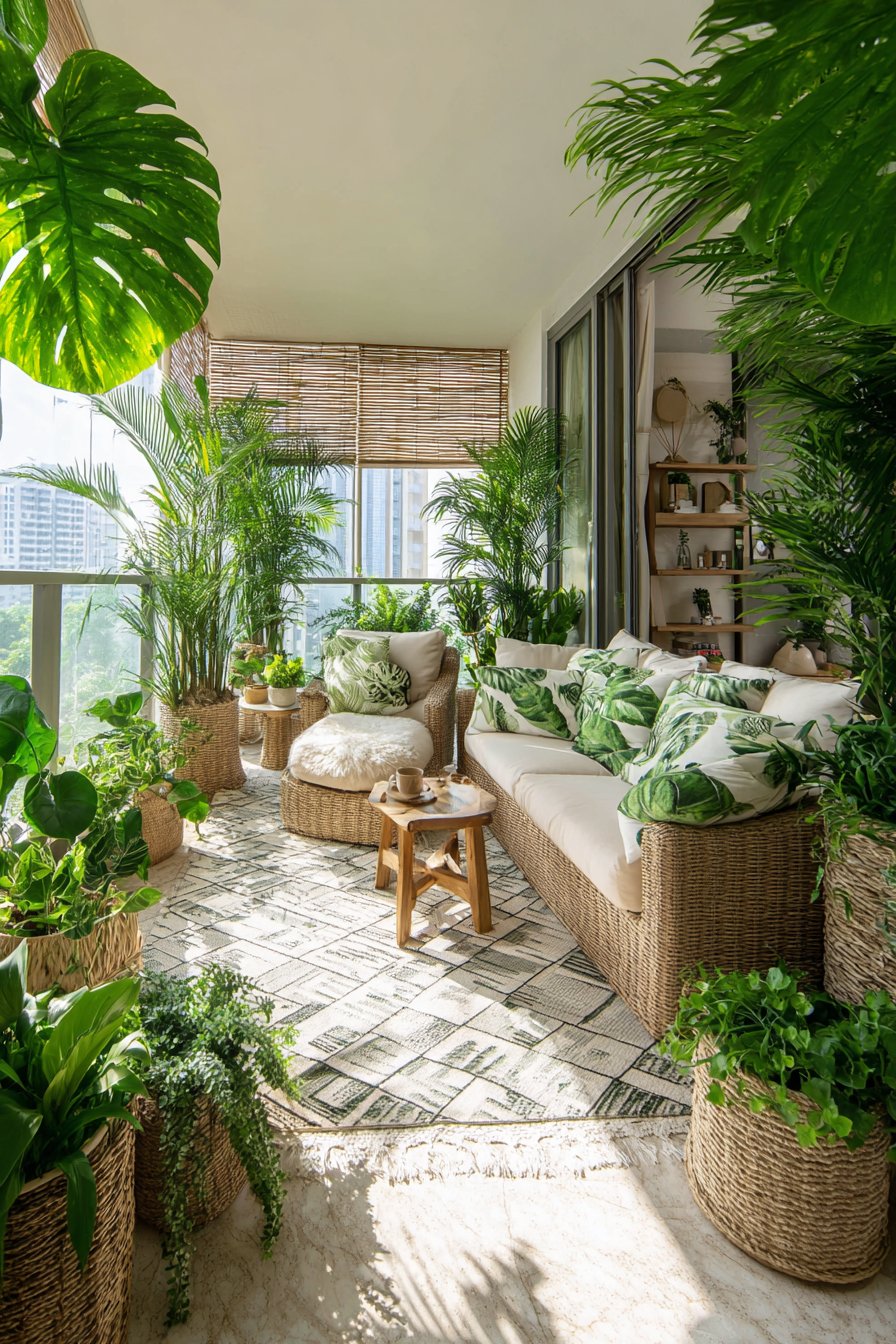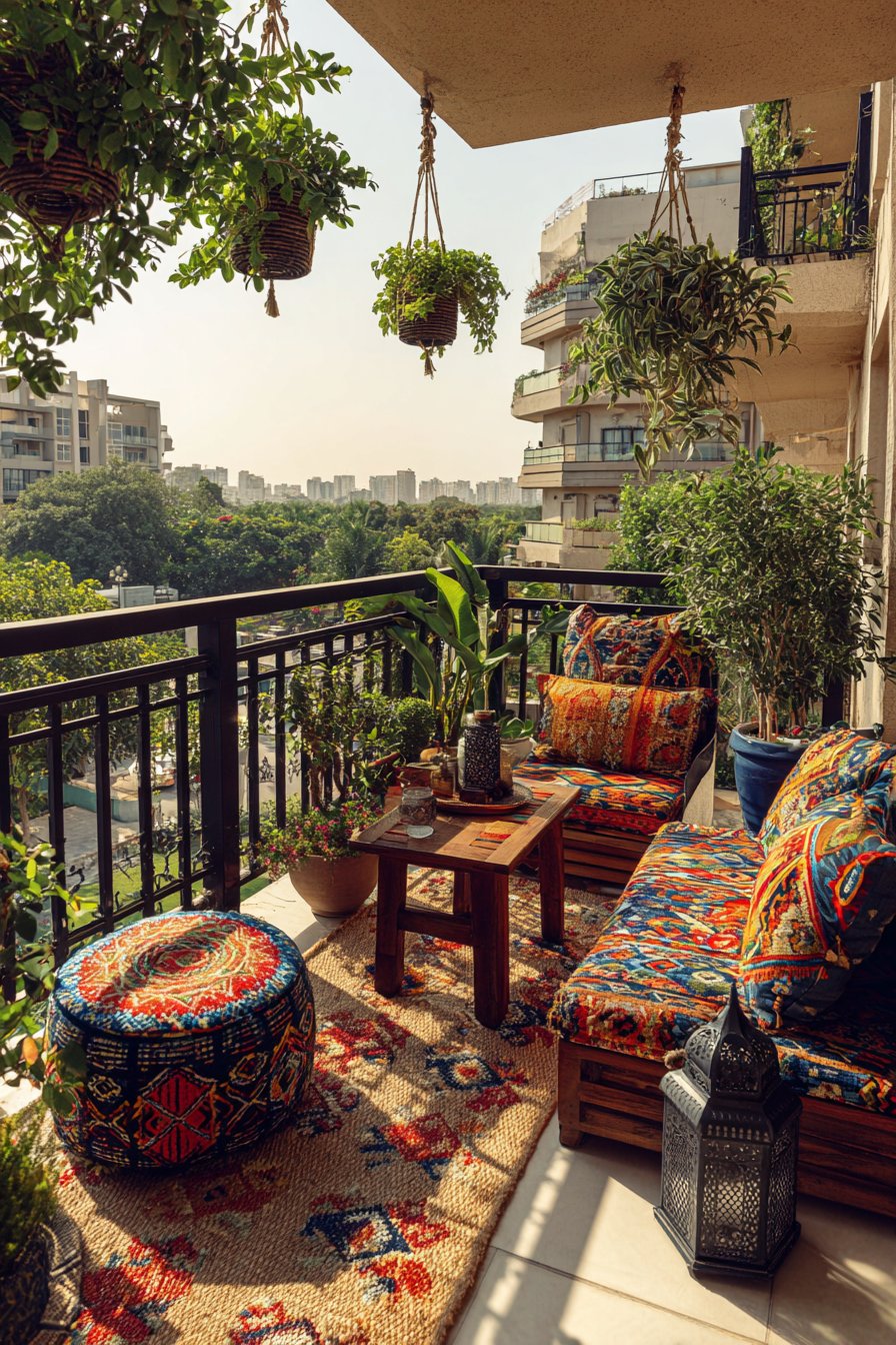 Bohemian design celebrates abundance, texture, and personal expression through carefully curated layers of natural materials and living plants. This balcony interpretation features macramé hanging planters suspended at staggered heights, creating visual rhythm and three-dimensional interest. The handcrafted rope work adds intricate texture while the varying heights draw the eye upward, making the space feel larger and more dynamic than its actual dimensions.