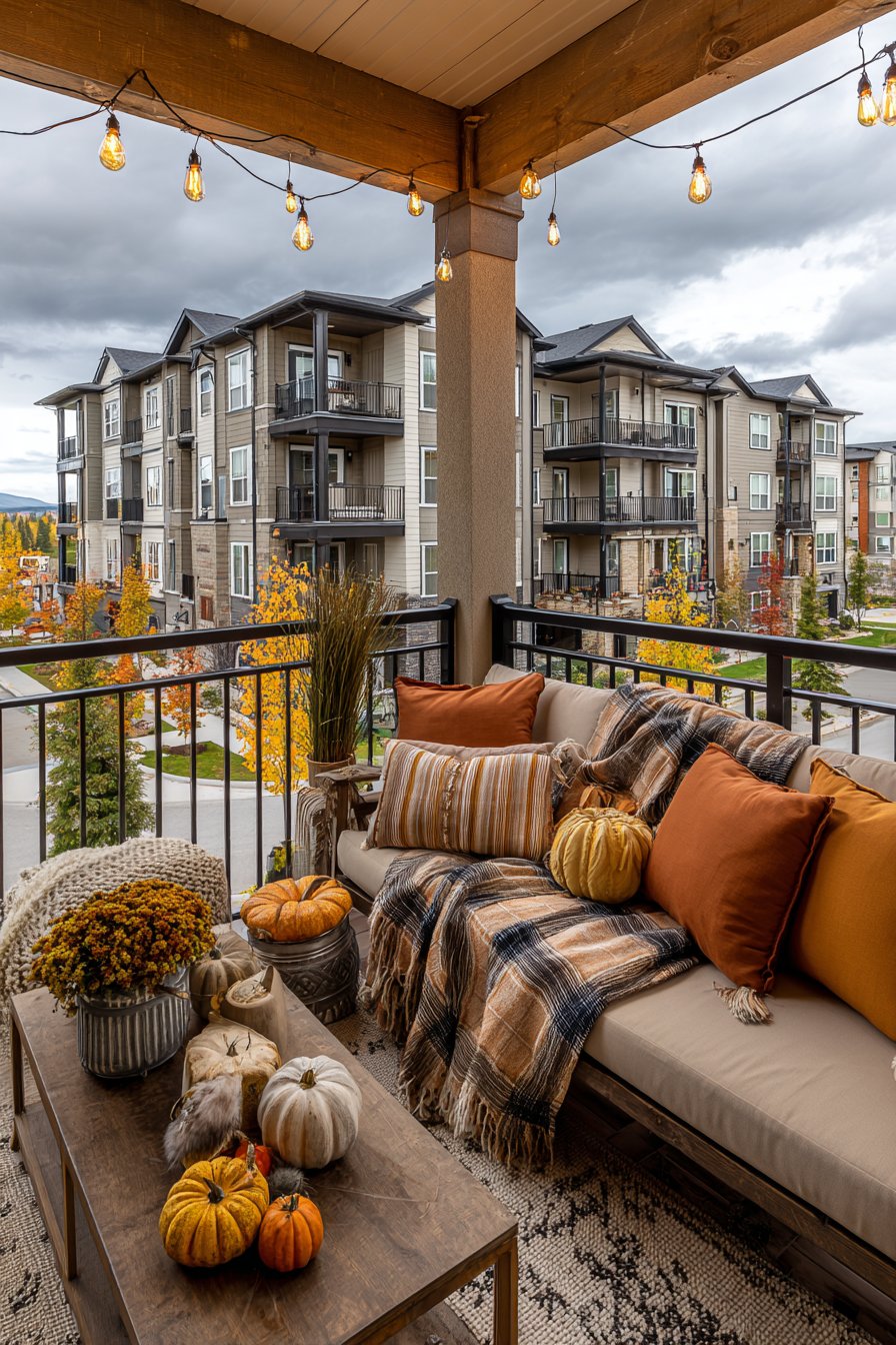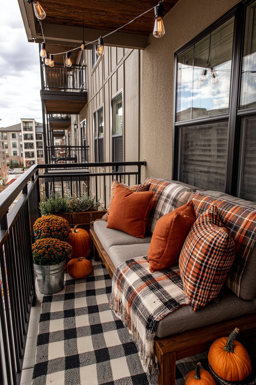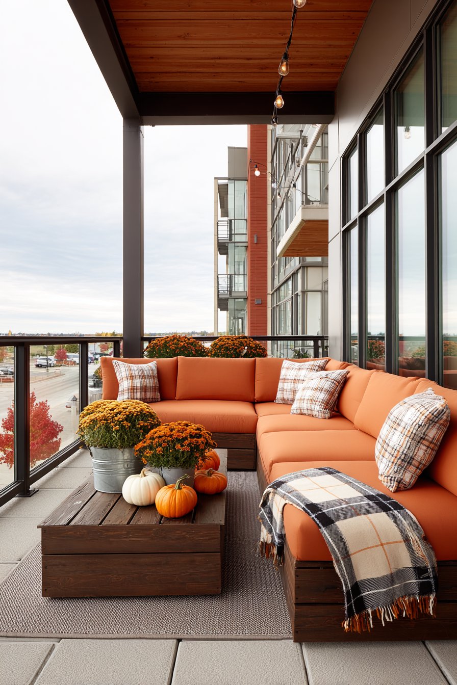 Seasonal styling allows your balcony to evolve throughout the year, reflecting changing weather and celebrations. This autumn configuration features weather-resistant outdoor sofa dressed in burnt orange and rust-colored pillows capturing fall’s signature warm palette. Plaid throw blanket adds cozy texture perfect for crisp autumn evenings while introducing traditional fall pattern.