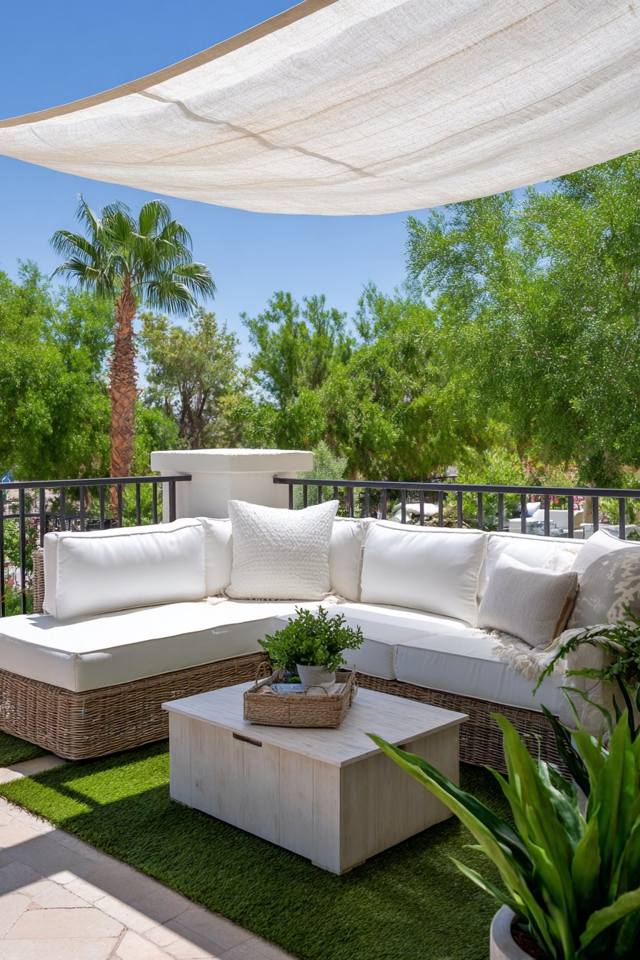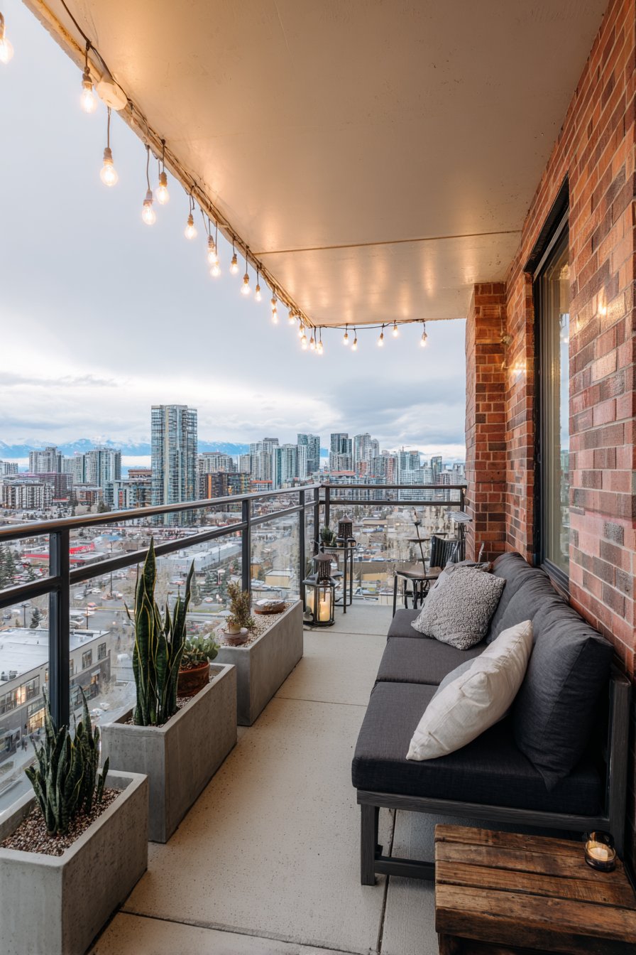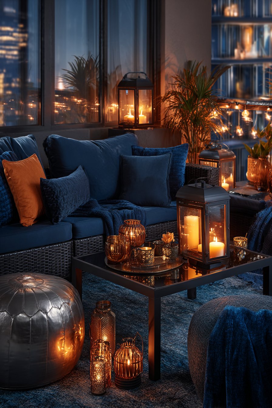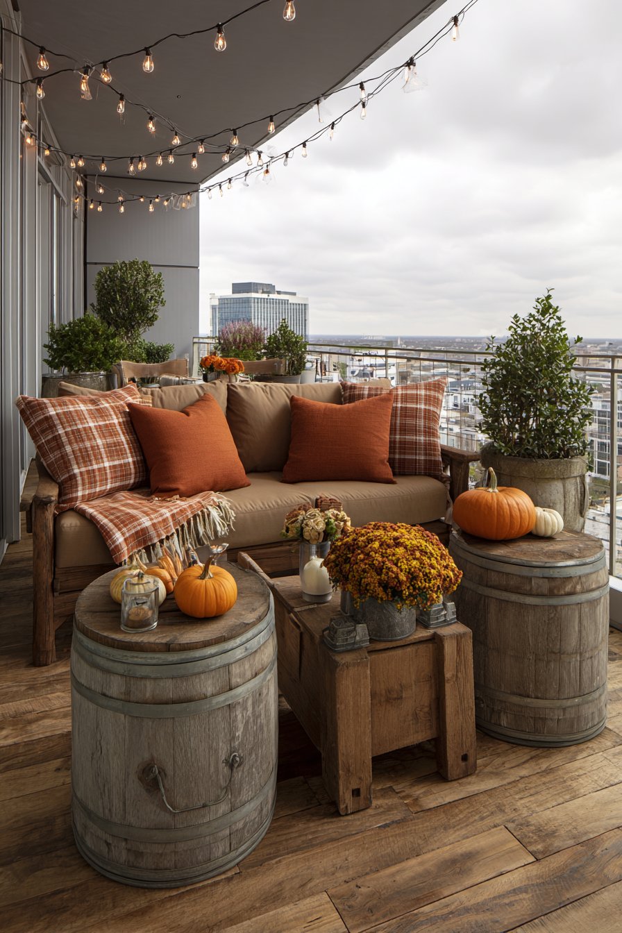 Seasonal styling allows your balcony to evolve throughout the year, reflecting changing weather and celebrations. This autumn configuration features weather-resistant outdoor sofa dressed in burnt orange and rust-colored pillows capturing fall’s signature warm palette. Plaid throw blanket adds cozy texture perfect for crisp autumn evenings while introducing traditional fall pattern.