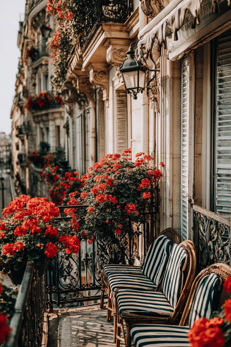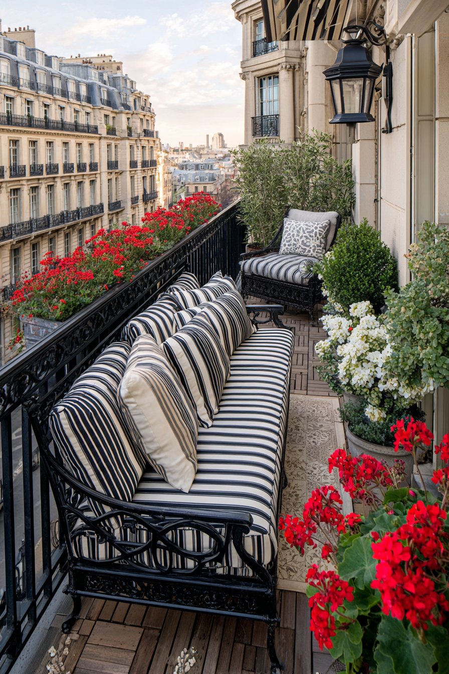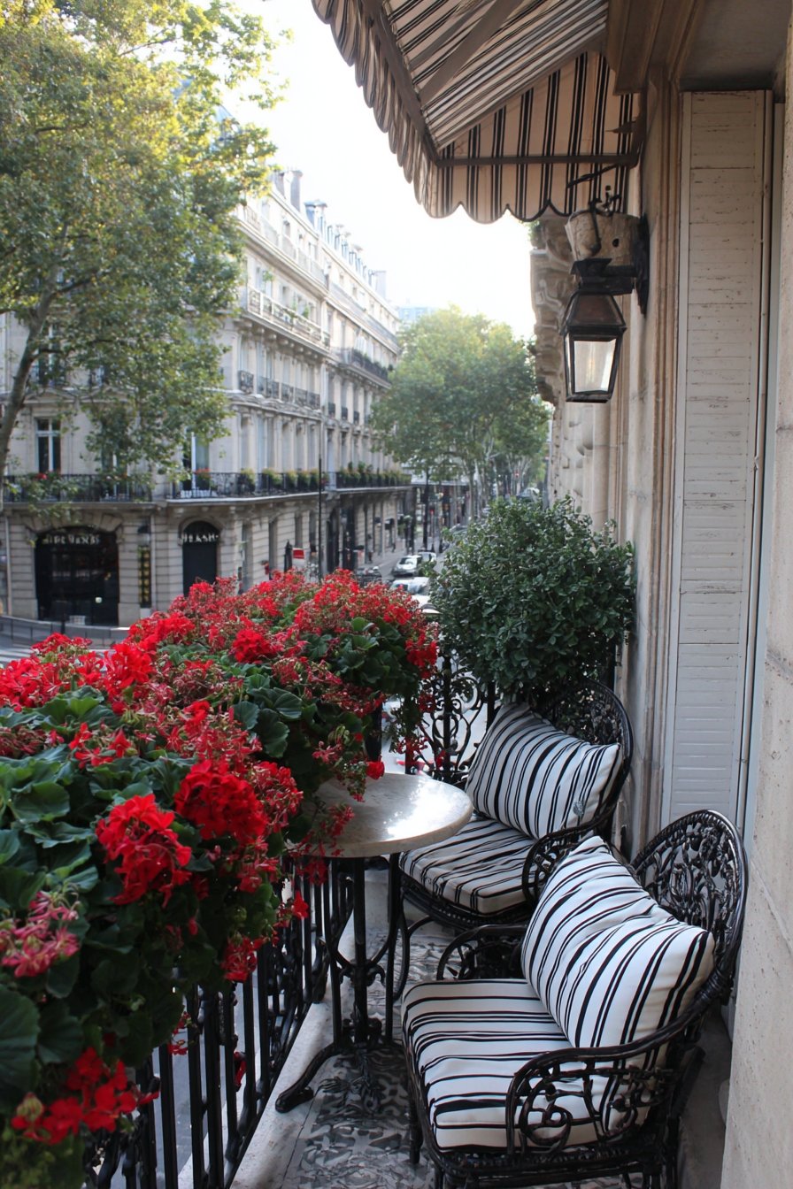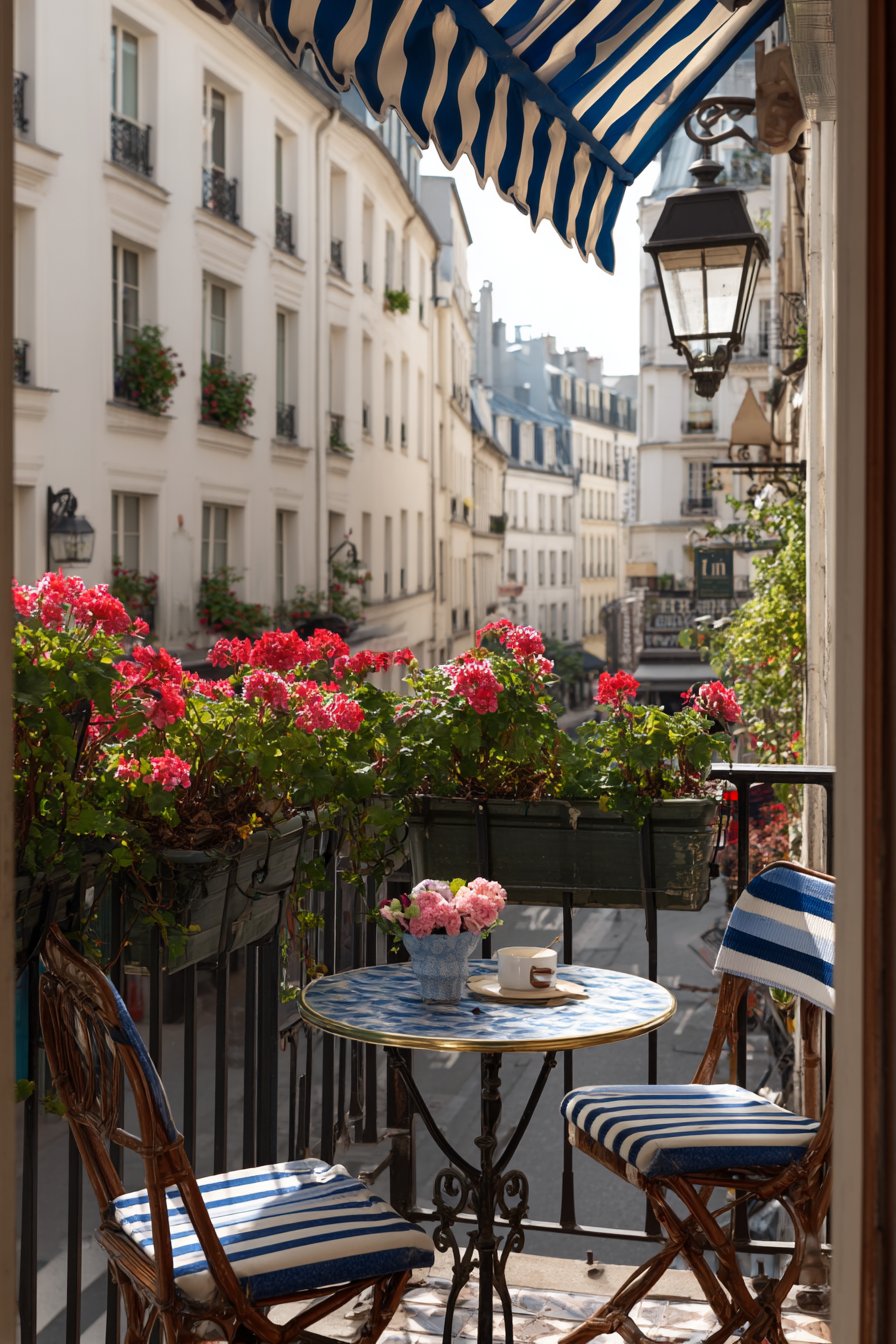 Small café-style awning provides shade while reinforcing the bistro aesthetic through its traditional striped fabric. Vintage-look street lamp style lighting completes the Parisian atmosphere, creating focal point that functions as sculpture during daytime and practical illumination after dark. Soft morning light creates authentic Parisian atmosphere, evoking leisurely café mornings spent with coffee and croissant. The romantic European aesthetic demonstrates how design can transport you to beloved destinations without leaving home.