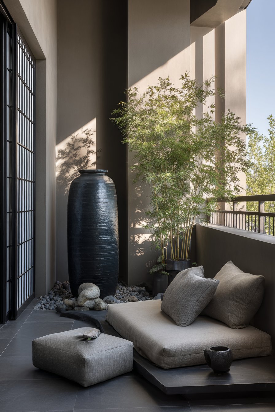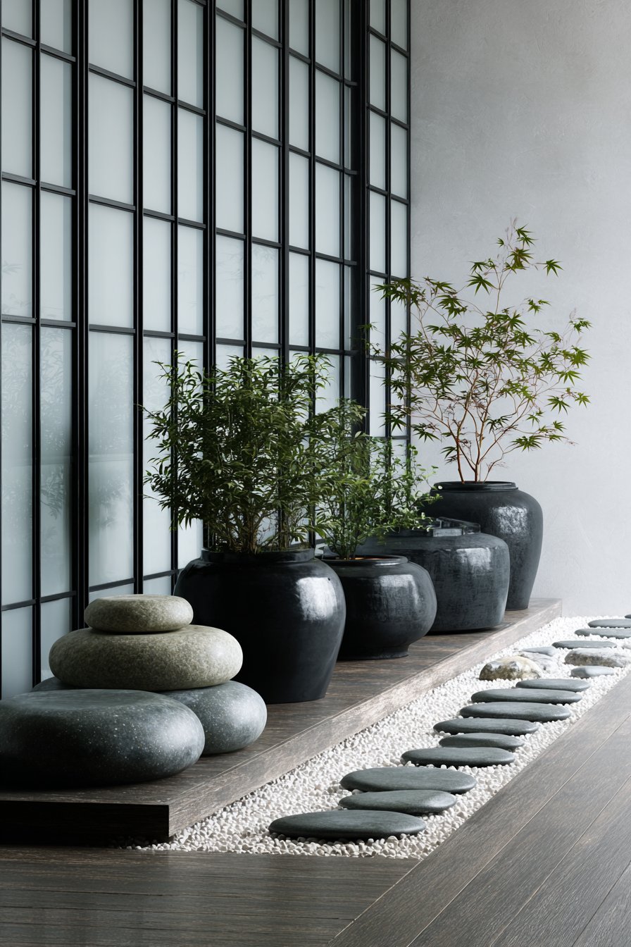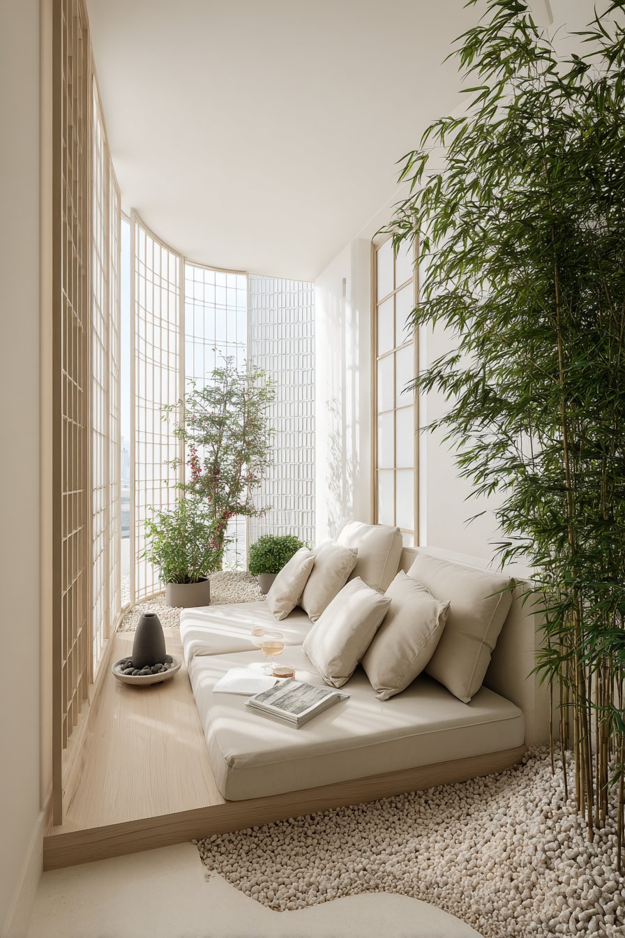 Minimalist plant selection including bamboo and Japanese maple in ceramic pots reinforces the zen aesthetic through restrained choices. Bamboo’s vertical lines and rustling leaves add movement and sound without visual chaos. Japanese maple provides seasonal interest through color changes while maintaining elegant form. Shoji-screen inspired privacy panels create enclosed sanctuary feeling while filtering light in traditionally Japanese manner. Soft filtered morning light creates ideal conditions for meditation practice—gentle enough to avoid distraction but sufficient to prevent drowsiness. The tranquil minimalist atmosphere demonstrates how thoughtful design supports spiritual and mental wellness practices.