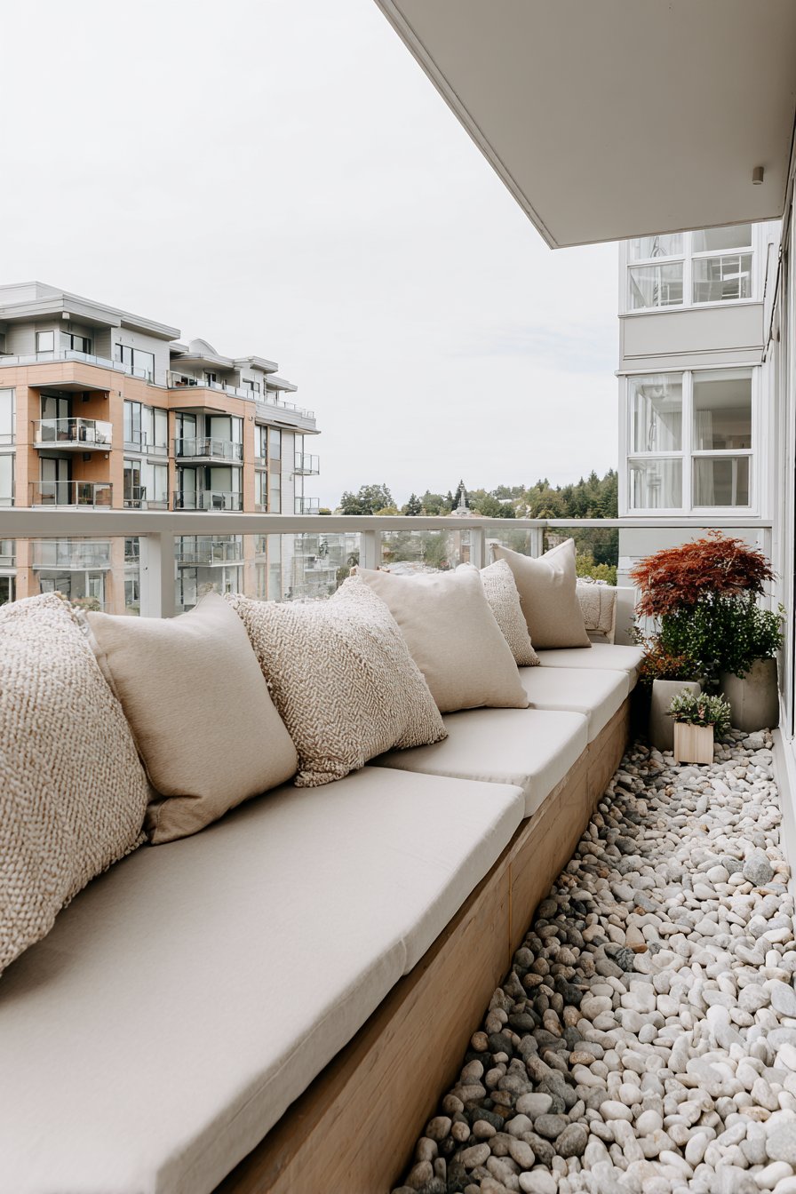 The foundation of exceptional small-space balcony design lies in furniture that works twice as hard. This corner L-shaped bench configuration exemplifies intelligent space planning, offering comfortable seating while concealing valuable storage beneath weather-resistant cushions in sophisticated soft grey tones. The built-in storage compartment provides a practical home for outdoor accessories, gardening tools, and seasonal items that would otherwise clutter your limited square footage.