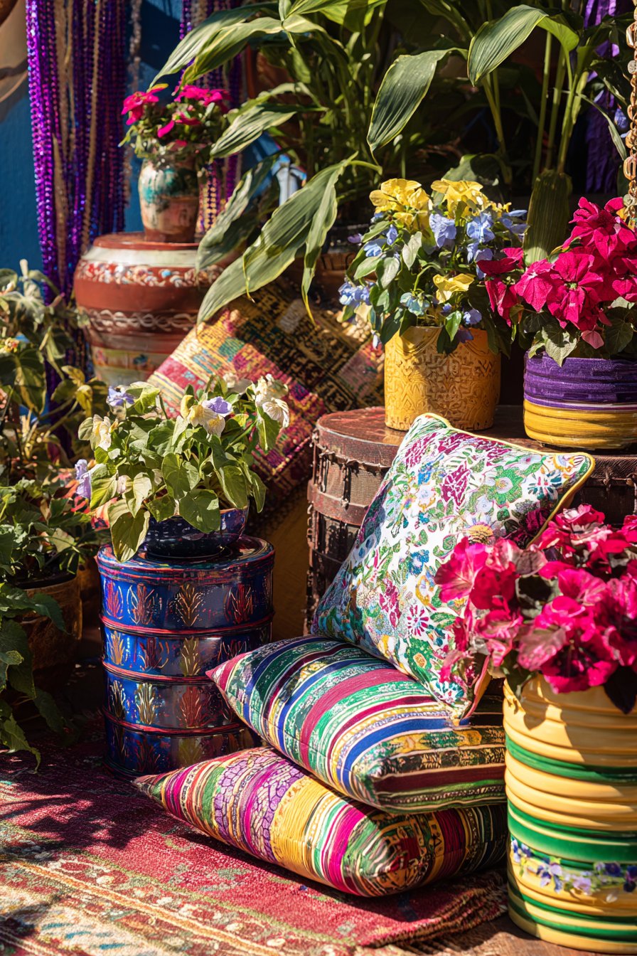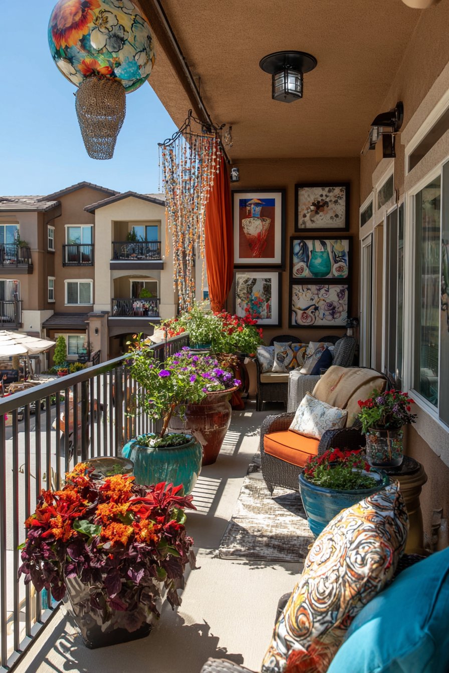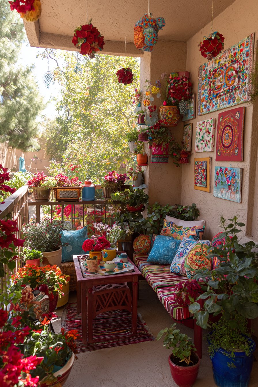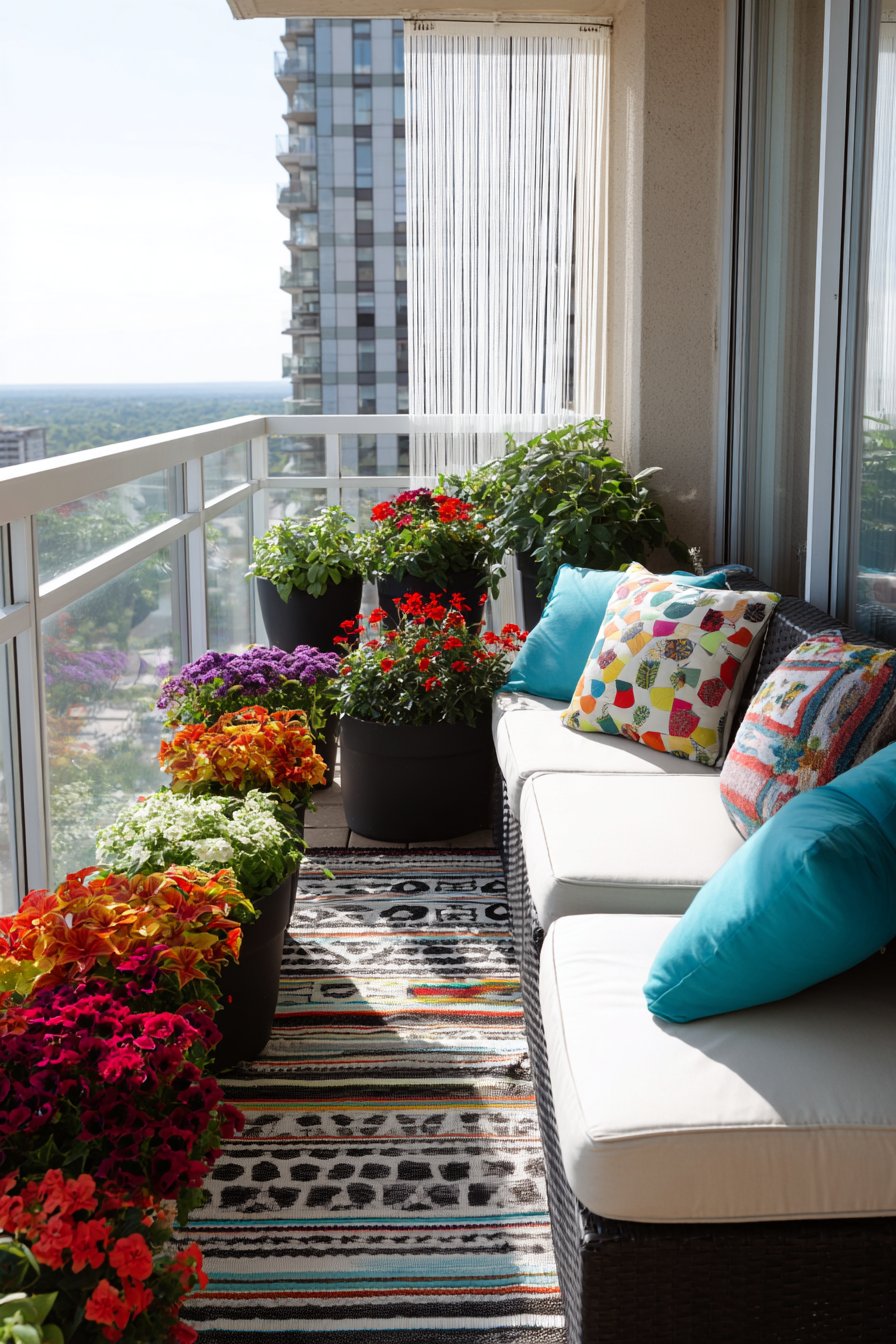 Eclectic collection of colorful planters in various sizes and materials showcases personal style through diverse container choices. Ceramic, metal, woven basket, painted terra cotta—each material and color adds another layer to the visual feast. Hanging beaded curtains introduce movement, sound, and light refraction while adding bohemian charm. Layered outdoor rugs create depth and define different functional zones within the balcony.