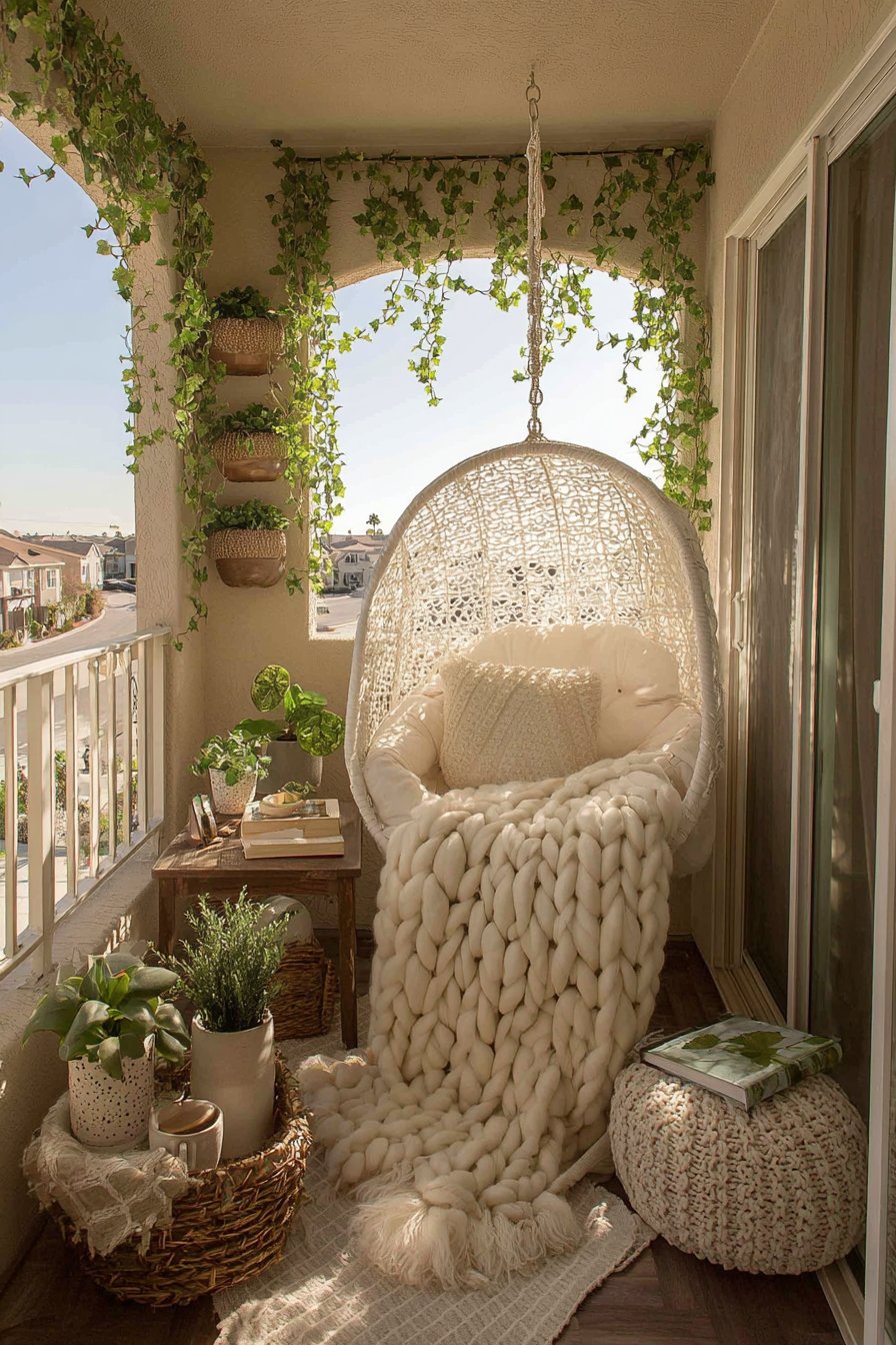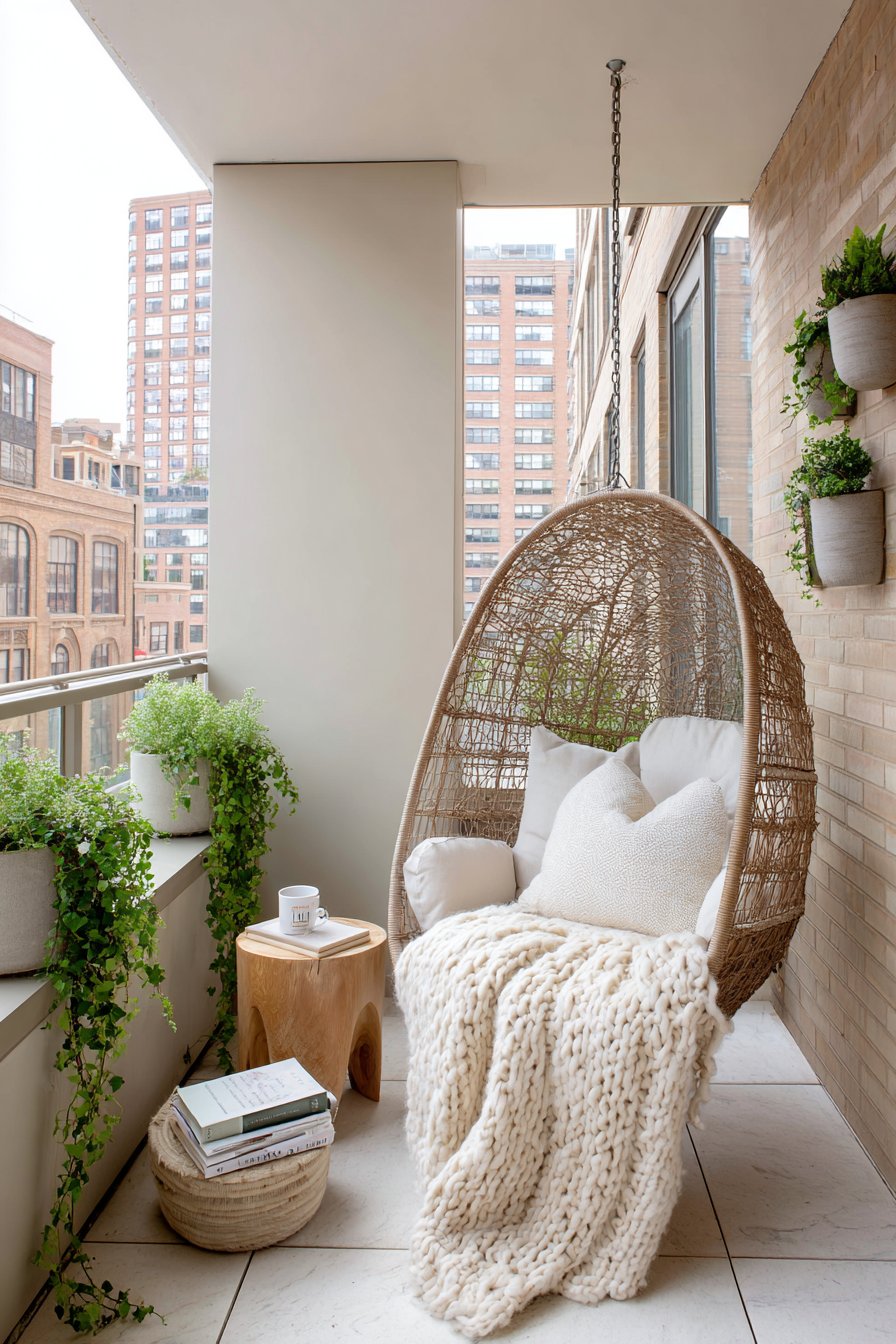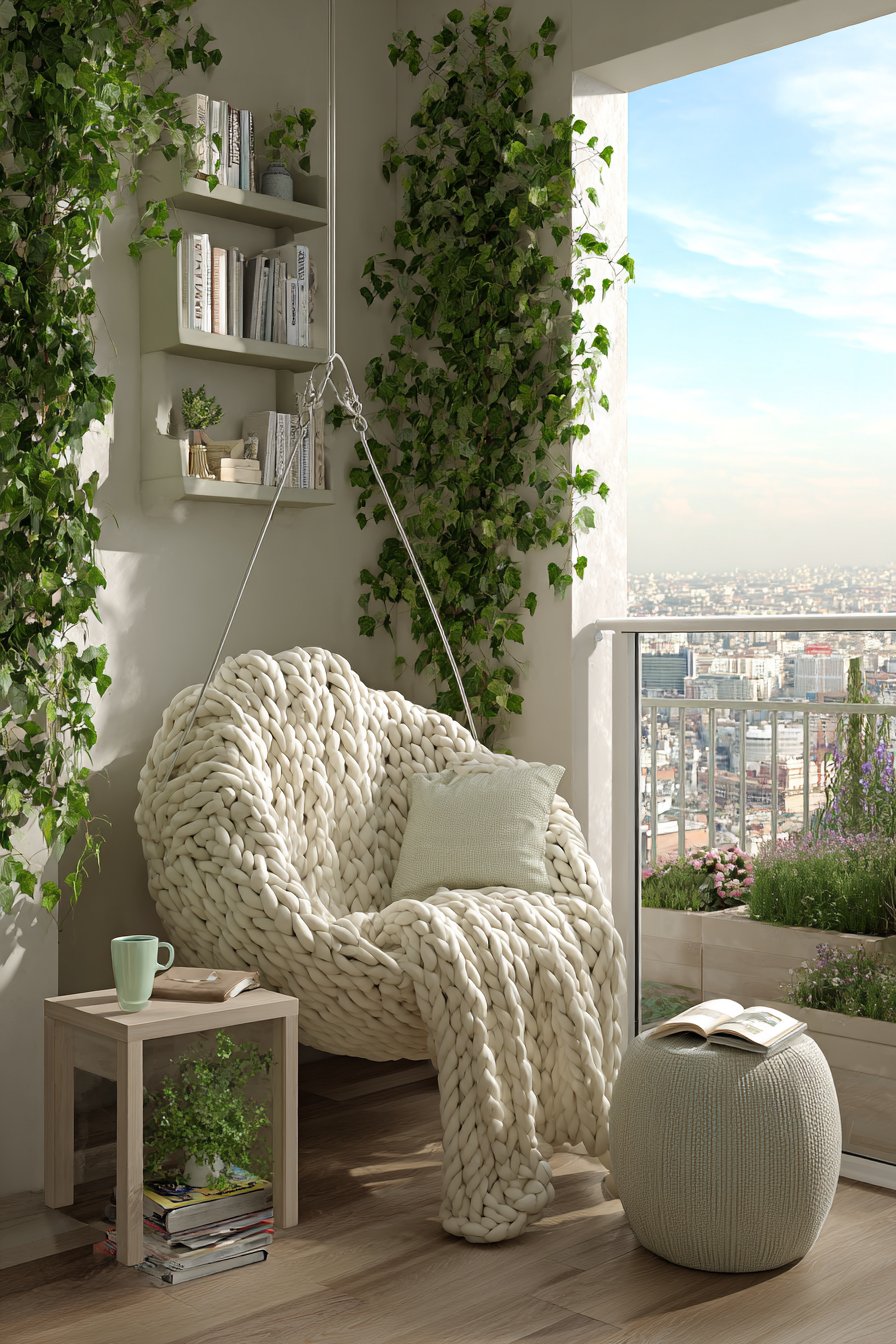 The hanging egg chair represents the ultimate in relaxed luxury, suspended from a reinforced ceiling mount to create a gently swaying retreat perfect for reading, napping, or quiet contemplation. This cozy configuration transforms a corner of your balcony into a dedicated relaxation zone, physically and psychologically separated from everyday concerns. The suspended nature provides subtle motion that many find soothing, while the enveloping form creates a sense of protection and privacy.