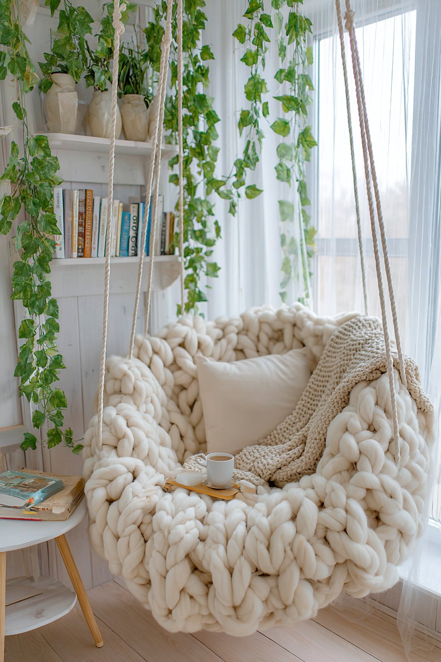 The small side table positioned within easy reach holds reading materials and morning coffee, providing necessary functionality without requiring you to leave your comfortable nest. Trailing potted ivy cascading from wall-mounted planters introduces living greenery at eye level when seated, creating a sense of being nestled within nature. Natural daylight streaming from the side provides ideal reading illumination while highlighting the interplay of textures—woven chair material, chunky knit fabric, and delicate trailing foliage.