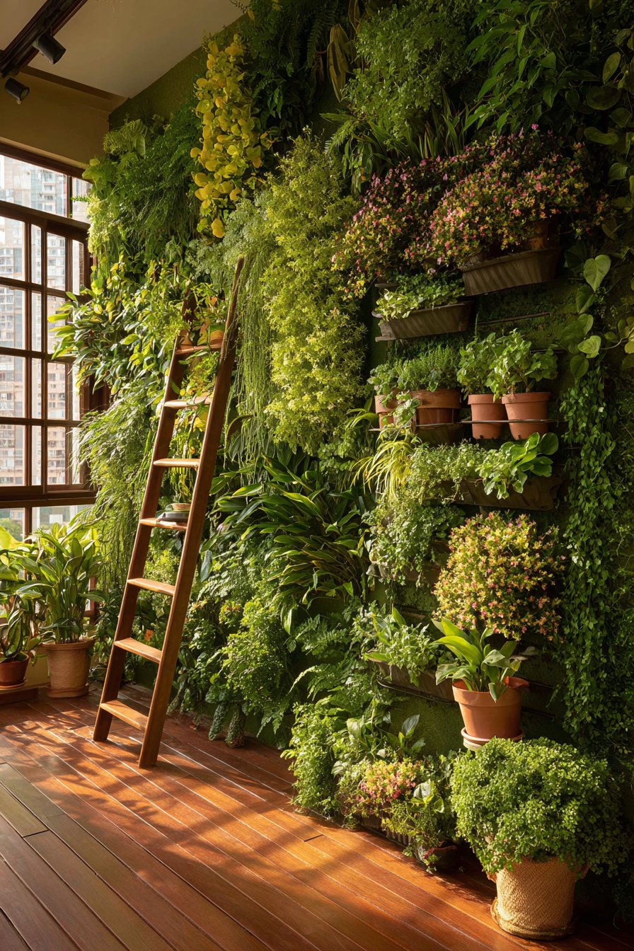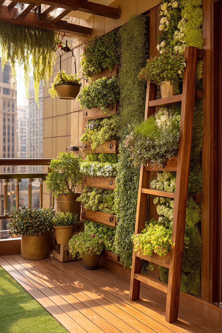 The wooden ladder shelf adds another dimension of vertical growing space, displaying additional potted plants at varying heights. This layered approach creates depth and visual complexity, with plants at multiple elevations drawing the eye upward and making the balcony feel more spacious. The combination of mounted wall system and freestanding ladder offers flexibility—you can easily rearrange ladder-displayed plants seasonally while the wall installation provides permanent structure.