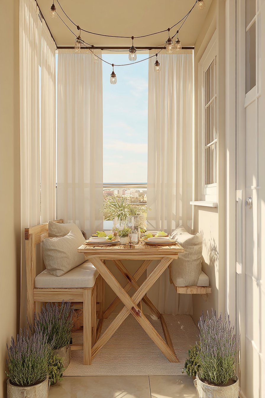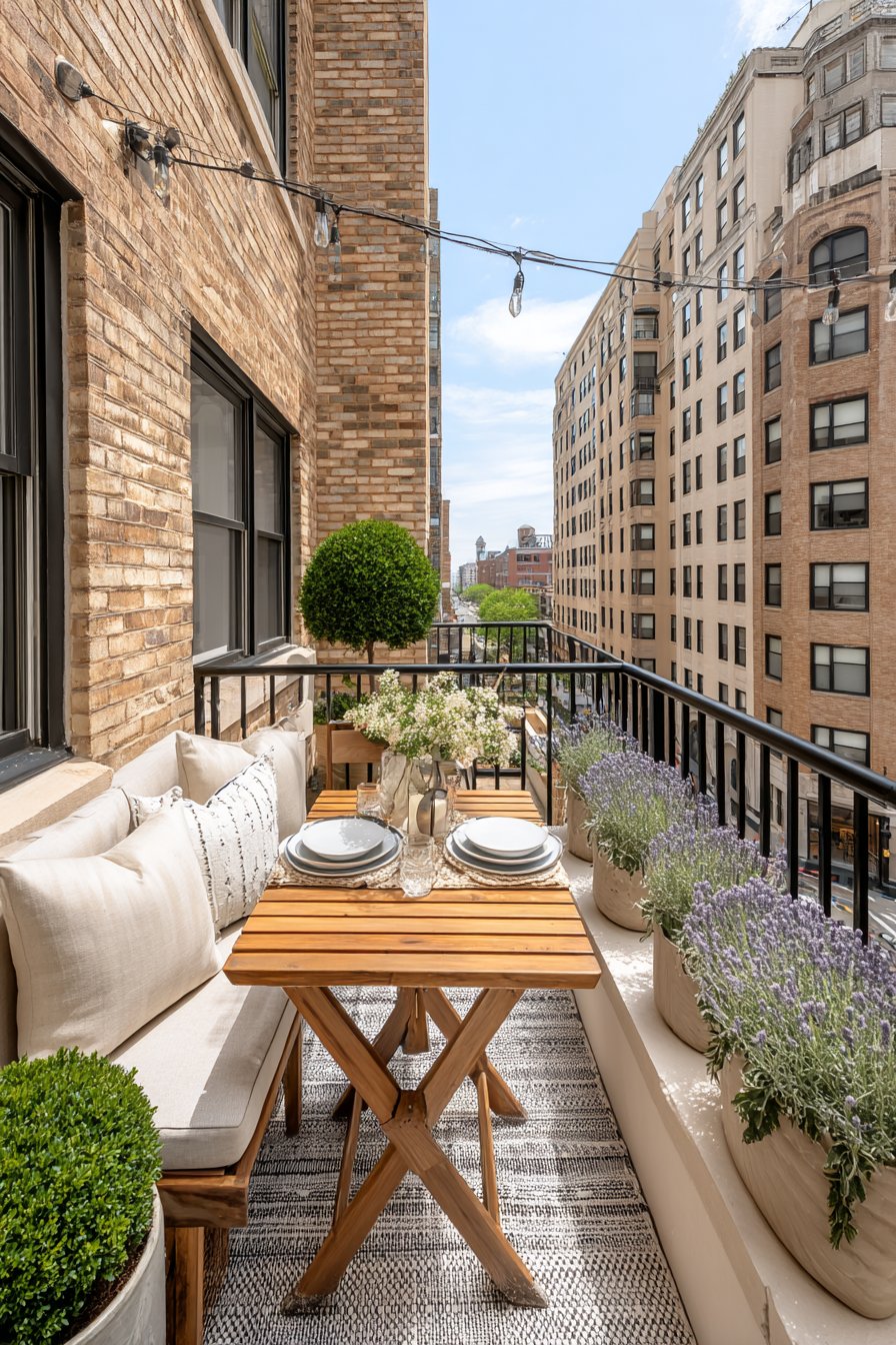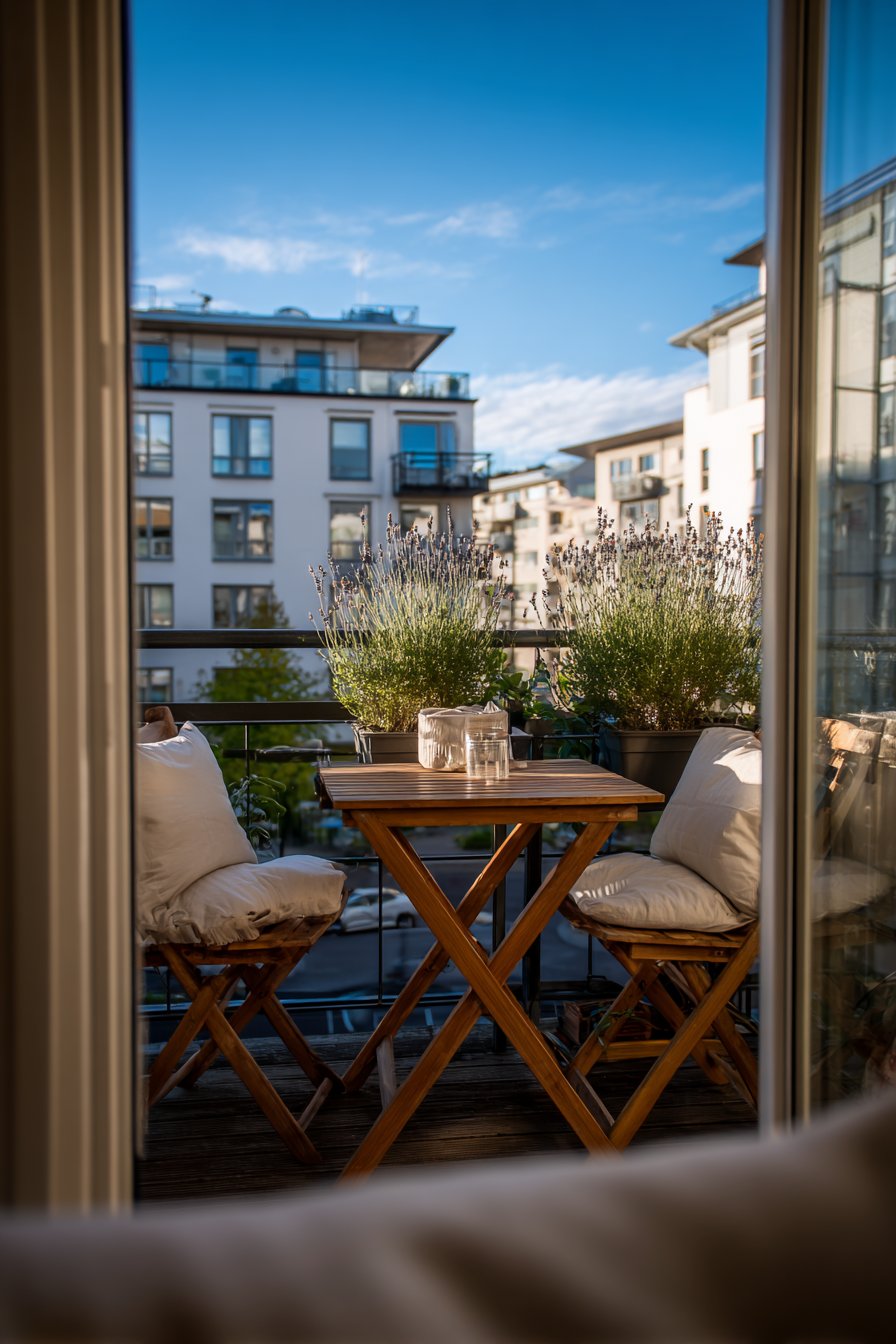 Potted lavender and rosemary plants frame the dining area, engaging the olfactory sense with their aromatic oils released on warm evenings. These Mediterranean herbs thrive in sunny balcony conditions while serving double duty as both decorative elements and culinary ingredients. Neutral-toned outdoor cushions on the bistro chairs add comfort for extended meals, encouraging lingering conversations over coffee. Late afternoon natural light creates a warm, inviting atmosphere, while the strategic plant placement defines the dining zone within the larger balcony space.