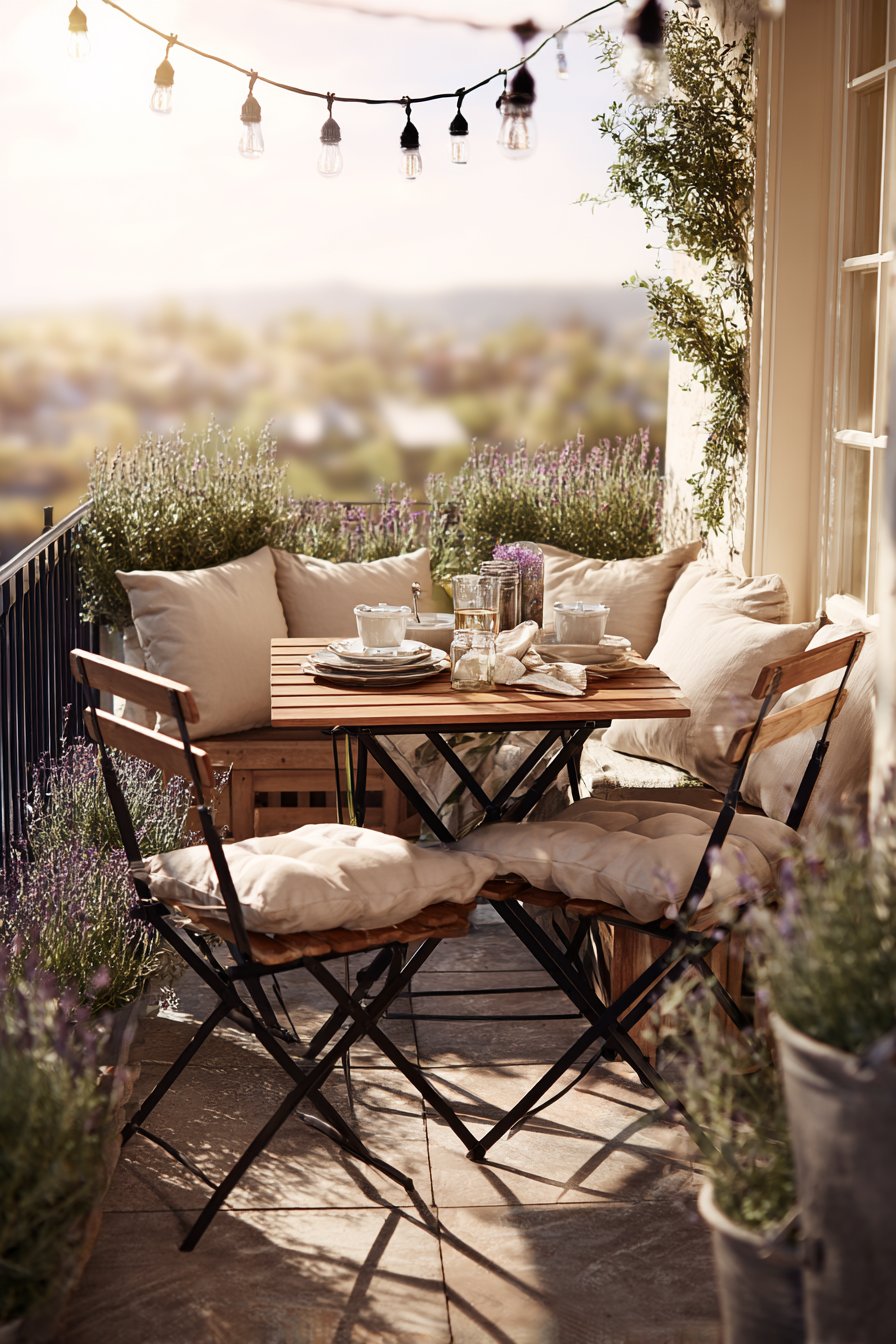 Creating an outdoor dining experience doesn’t require restaurant-sized space—just thoughtful furniture selection and atmospheric lighting. This dining-focused setup features a space-saving folding wooden table that can be collapsed and stored when not in use, maximizing flexibility in how you use your limited square footage. Paired with two bistro chairs, this configuration comfortably accommodates intimate meals while maintaining an open, uncluttered feel when dining furniture isn’t needed.