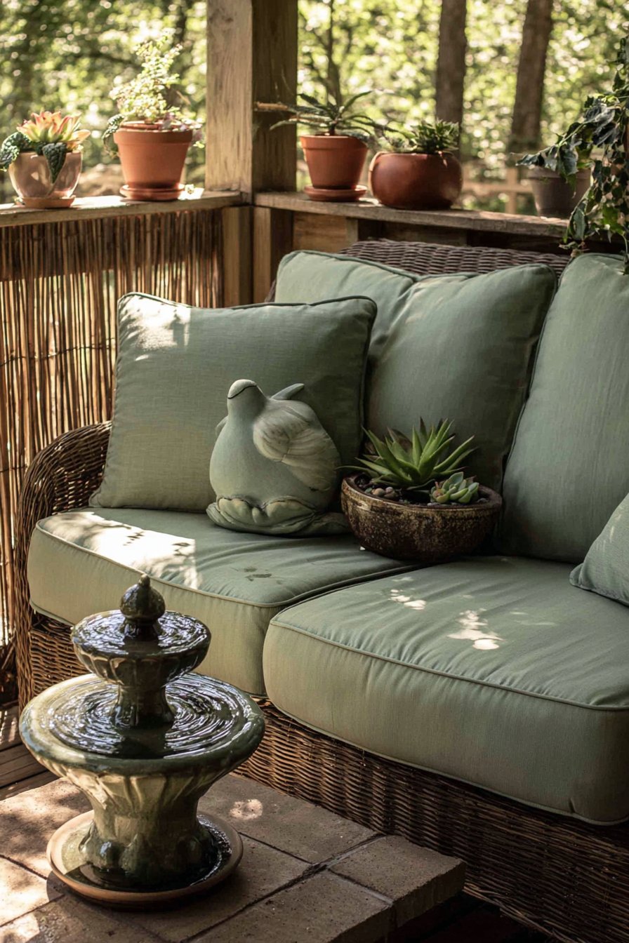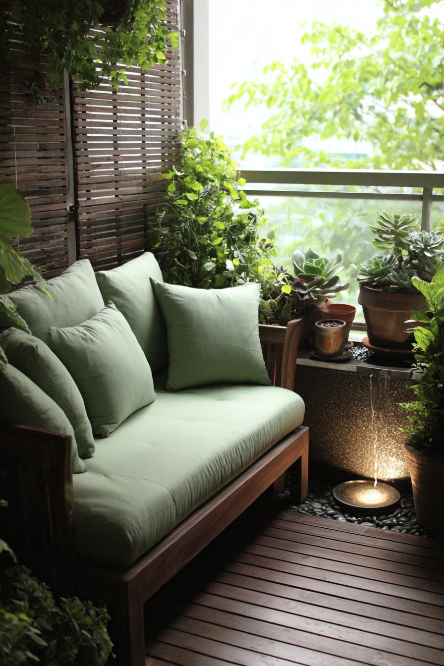 A small water fountain feature introduces tranquil sound that masks urban noise pollution while creating a spa-like sensory experience. The gentle trickling provides acoustic privacy, making conversations feel more intimate while the visual movement of water adds dynamic interest. Mixed succulent arrangements in terracotta pots contribute additional greenery without demanding intensive maintenance. Soft filtered natural lighting through bamboo creates dappled shadow patterns that shift throughout the day, enhancing the secluded retreat atmosphere through constantly changing light quality.