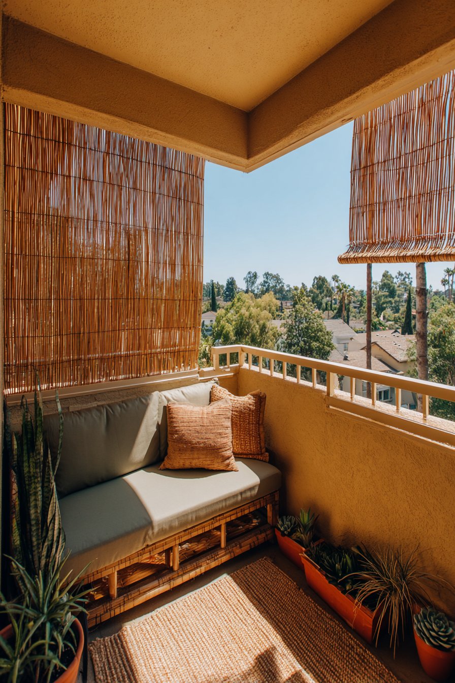 Privacy concerns often limit balcony enjoyment, especially in urban settings with neighboring balconies in close proximity. This privacy-focused design employs bamboo screens on two sides, creating an enclosed sanctuary that feels protected from outside observation without sacrificing airflow or natural light. The natural bamboo material introduces organic texture and warm tones while the vertical lines create visual height, making the space feel more expansive.