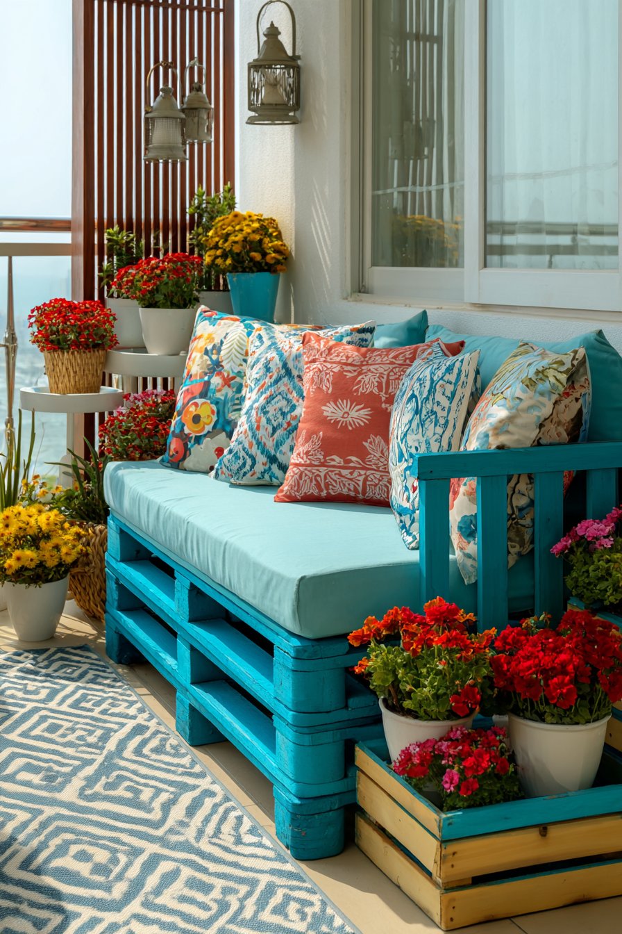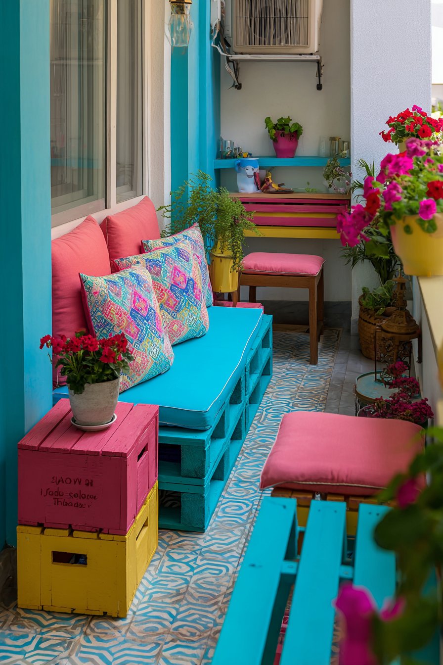 For personalities that thrive on color and energy, this vibrant approach embraces bold hues and pattern mixing. Turquoise and coral outdoor furniture creates a striking complementary color combination that energizes the space and reflects tropical, coastal influences. The saturated colors make a confident statement that’s impossible to ignore, transforming the balcony into a celebration of personality and joy.