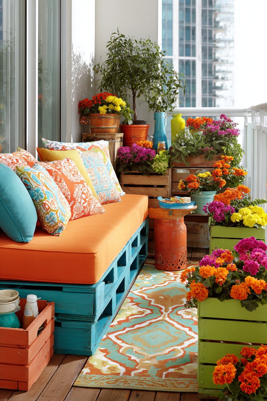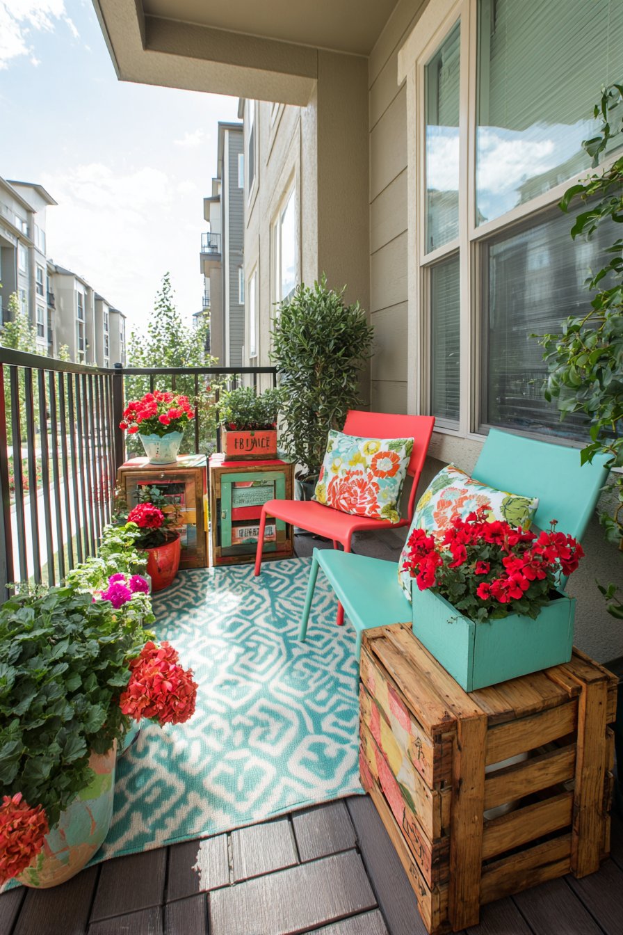 Painted wooden crates serving as plant stands demonstrate creative repurposing while adding handcrafted charm. Bright geraniums and petunias in containers provide living color that echoes and amplifies the furniture palette. The decorative outdoor rug in geometric pattern anchors the seating area, defining the space while introducing additional pattern at a larger scale. Bright midday natural light showcases the cheerful color palette at its most vibrant, though the energetic scheme remains engaging even under overcast skies or evening lighting.