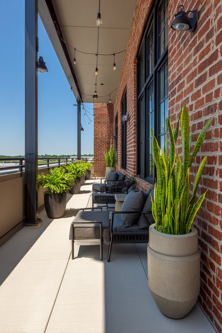 Industrial design translates beautifully to balcony spaces, especially in urban loft buildings where the aesthetic complements architectural context. Metal furniture with clean lines embodies the industrial vocabulary of functional simplicity and honest materials. The utilitarian forms celebrate engineering and manufacturing aesthetics rather than hiding structural elements, creating visual coherence with urban surroundings.