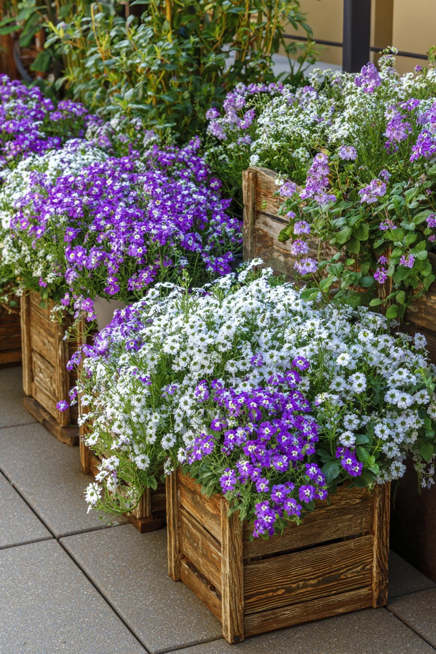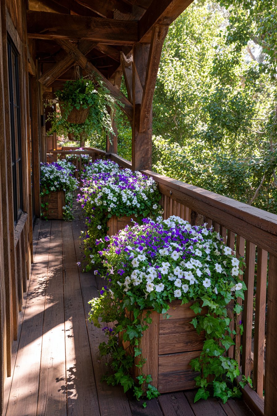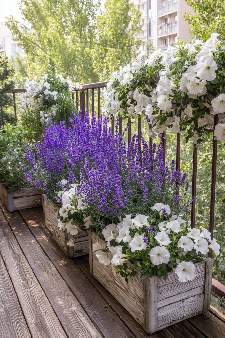 This balcony flower idea prioritizes olfactory pleasure through carefully selected fragrant flowers arranged in vintage wooden crates. Sweet alyssum, stock flowers, and fragrant nicotiana create an aromatic retreat that intensifies during evening hours when many fragrant flowers release their scent most powerfully. The white and purple blooms establish a calming color palette while their perfumes transform the small balcony into a sensory sanctuary perfect for evening relaxation.