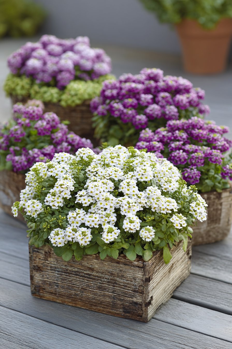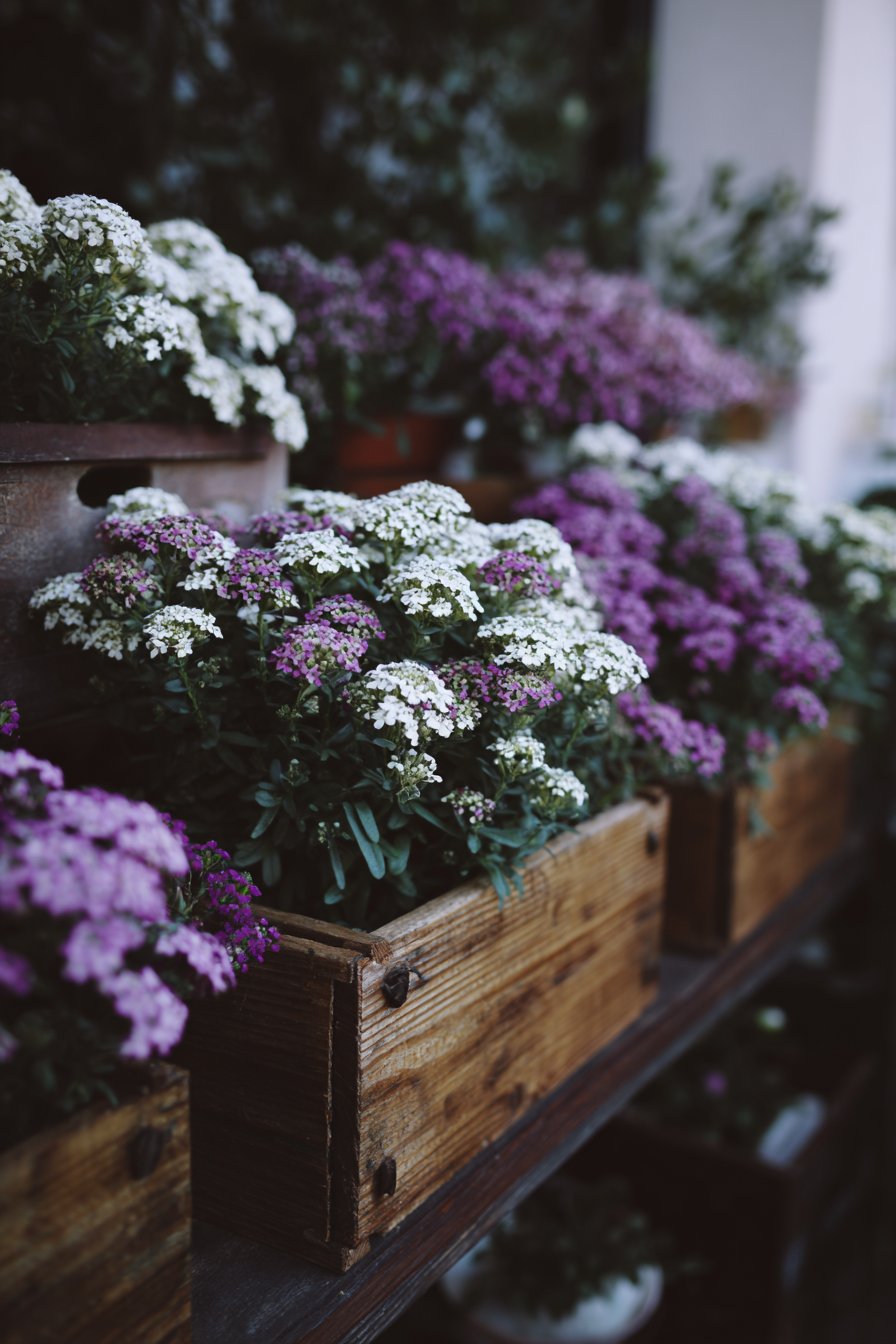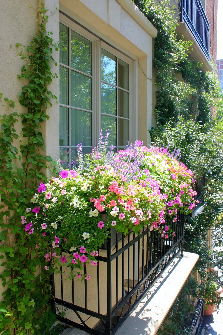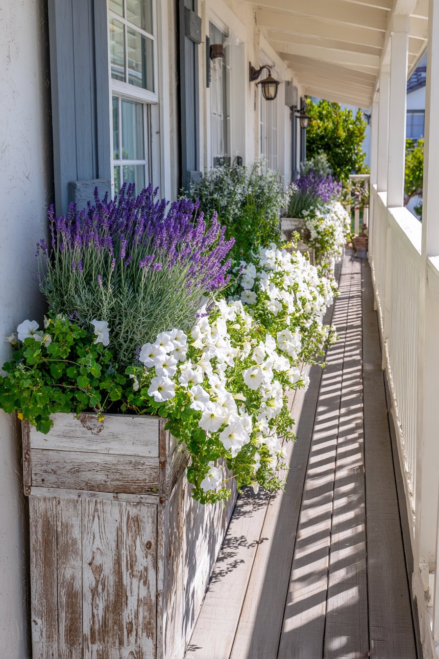 This balcony flower idea prioritizes olfactory pleasure through carefully selected fragrant flowers arranged in vintage wooden crates. Sweet alyssum, stock flowers, and fragrant nicotiana create an aromatic retreat that intensifies during evening hours when many fragrant flowers release their scent most powerfully. The white and purple blooms establish a calming color palette while their perfumes transform the small balcony into a sensory sanctuary perfect for evening relaxation.