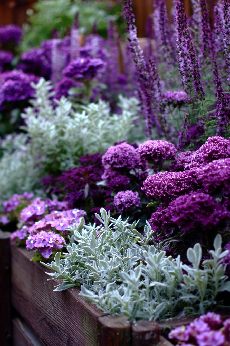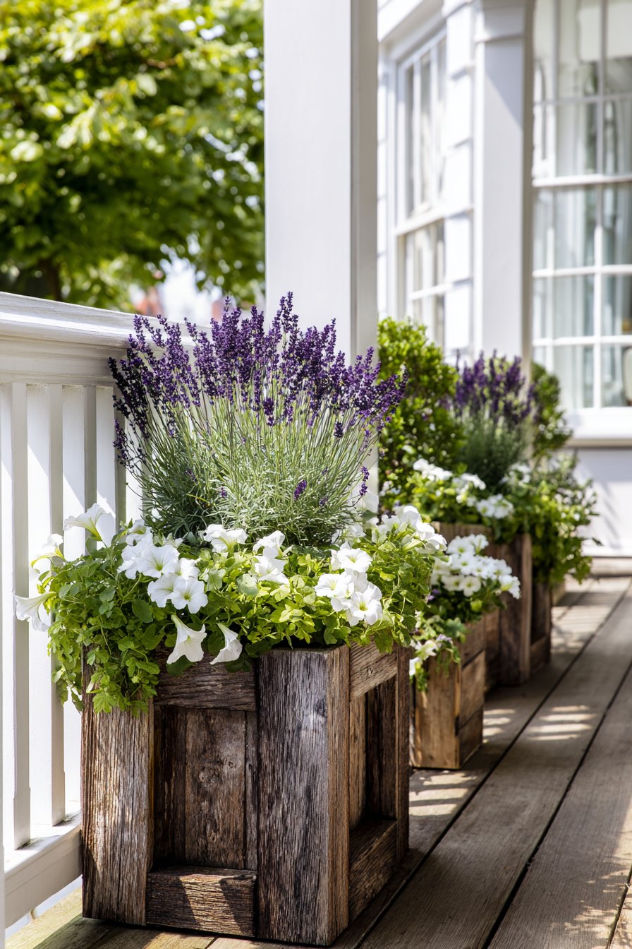 The purple and white color palette delivers sophisticated simplicity, allowing the lavender’s silvery-green foliage to shine as a textural element even when not in bloom. The weathered wood planters complement this natural aesthetic, their aged patina suggesting years of garden enjoyment while actually being entirely achievable for new installations. This arrangement excels in full sun exposure, where lavender thrives and releases its signature fragrance most intensely during warm afternoons.