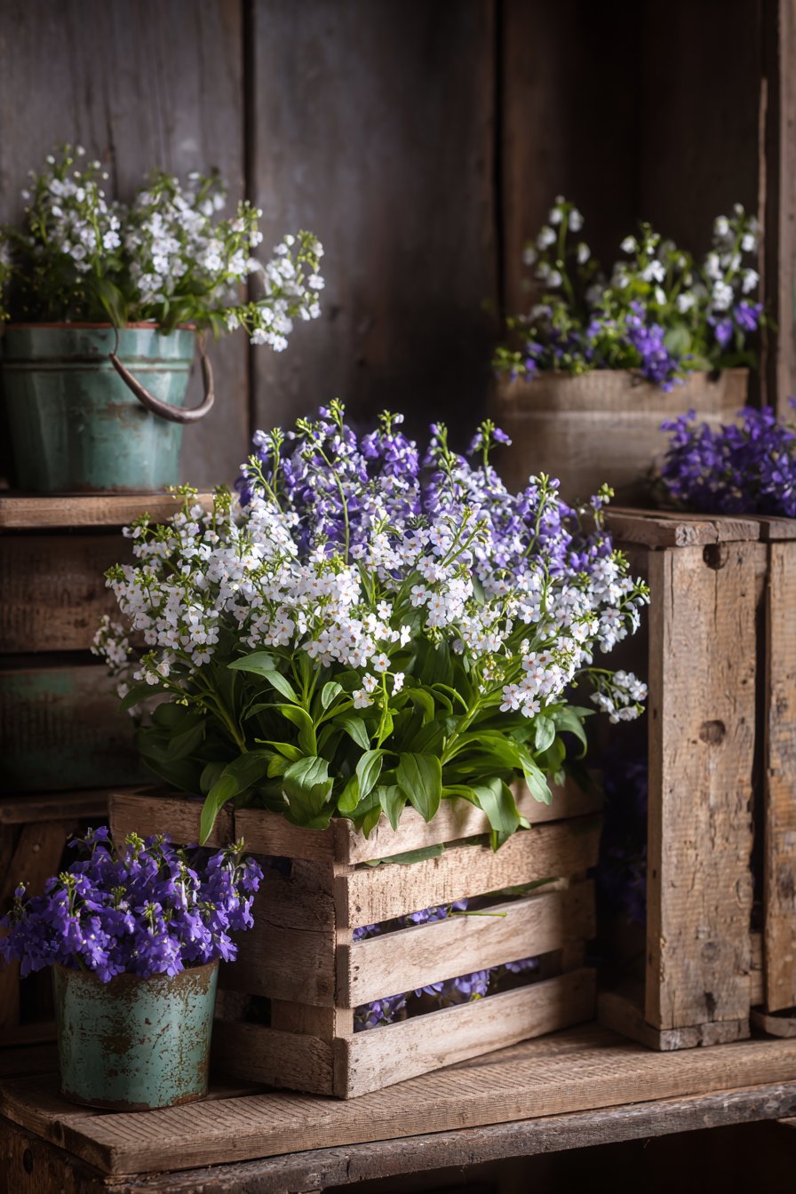 Vintage wooden crates provide charming containers whose rough, aged texture contrasts beautifully with delicate flowers. The visible wood grain and weathered finish add character and warmth, while their generous depth accommodates substantial root systems. These rustic containers suit cottage gardens, farmhouse aesthetics, or any design scheme valuing authenticity and character over polished perfection.