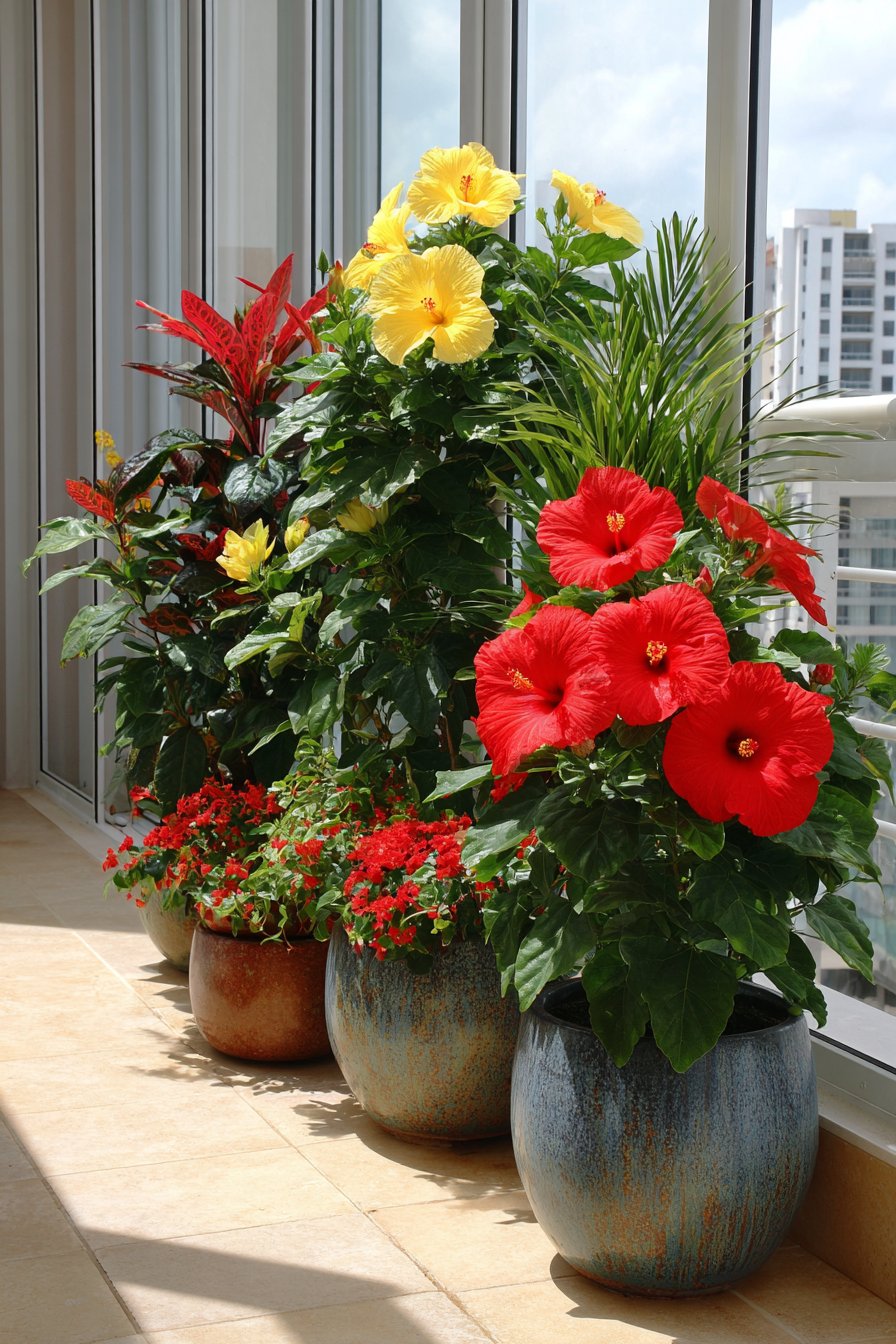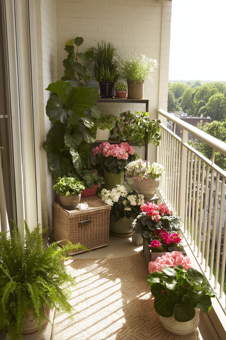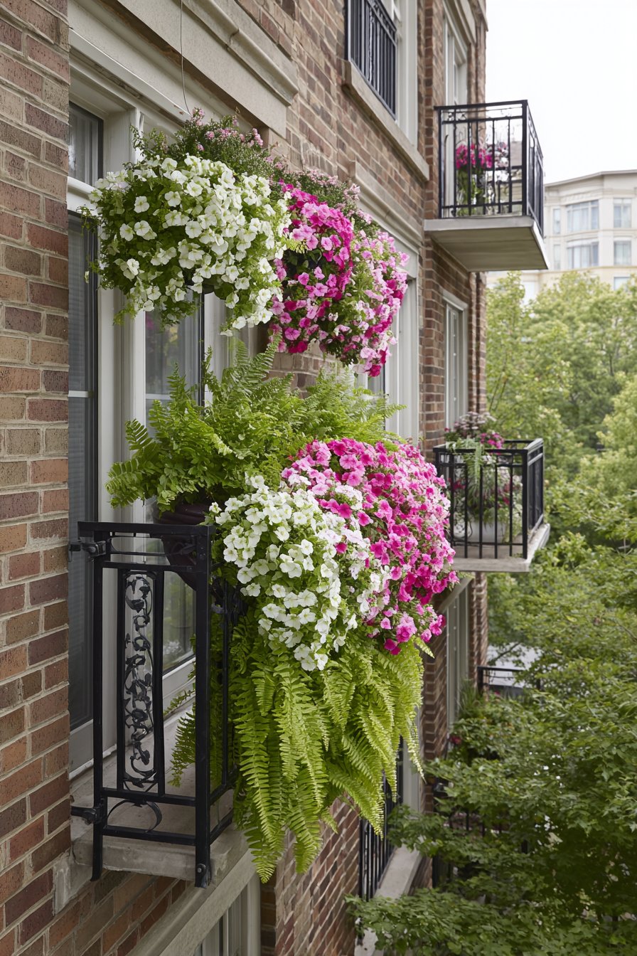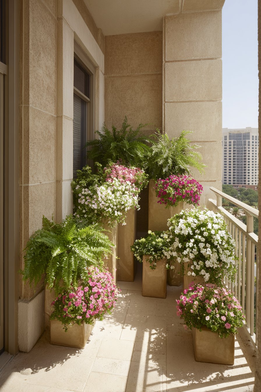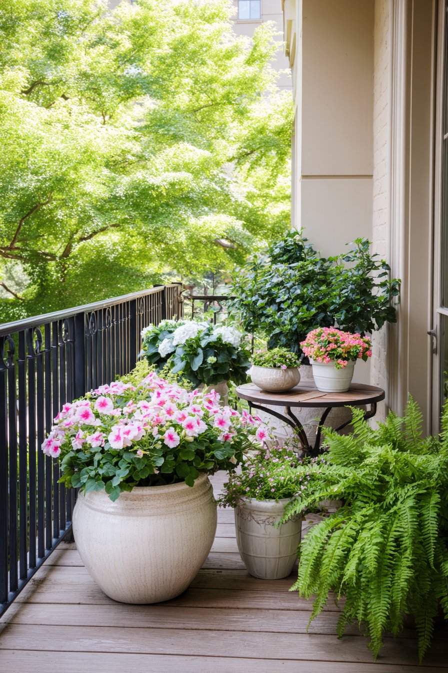 Not all balconies bask in abundant sunshine, making this shade-focused balcony flower idea invaluable for north-facing or heavily covered outdoor spaces. The carefully curated collection features shade-loving plants including pink and white impatiens, colorful begonias, and lush green ferns arranged in coordinating ceramic planters. This demonstrates that limited sunlight need not mean limited beauty—numerous flowering plants thrive in shade when given appropriate care and conditions.